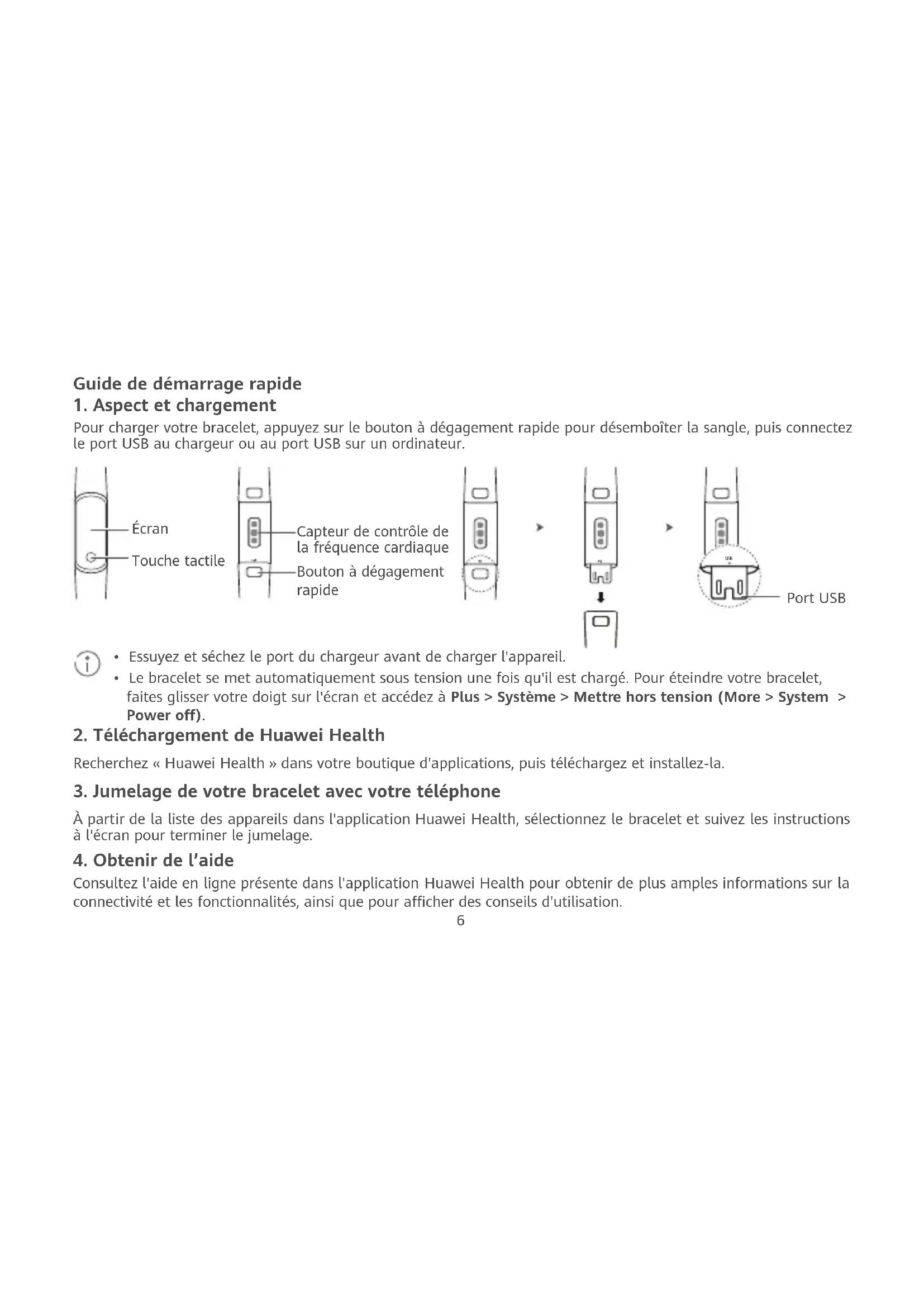 À partir de la liste des appareils dans l'application Huawei Health, sélectionnez le bracelet et suivez les instructions à l'écran pour terminer le jumelage. Consultez l'aide en ligne présente dans l'application Huawei Health pour obtenir de plus amples informations sur la connectivité et les fonctionnalités, ainsi que pour acher des conseils d'utilisation. Capteur de contrôle de la fréquence cardiaque Touche tactile Écran Port USB USB USB Bouton à dégagement rapide USB USB USB USB6 7 Copyright © Huawei Technologies Co., Ltd. 2019. Tous droits réservés. CE DOCUMENT EST À TITRE INFORMATIF UNIQUEMENT ET NE CONSTITUE AUCUNE GARANTIE QUELLE QU'ELLE SOIT. Marques de commerce et autorisations , , , et sont des marques de commerce ou des marques déposées de Huawei Technologies Co., Ltd. La marque ainsi que les logos Bluetooth