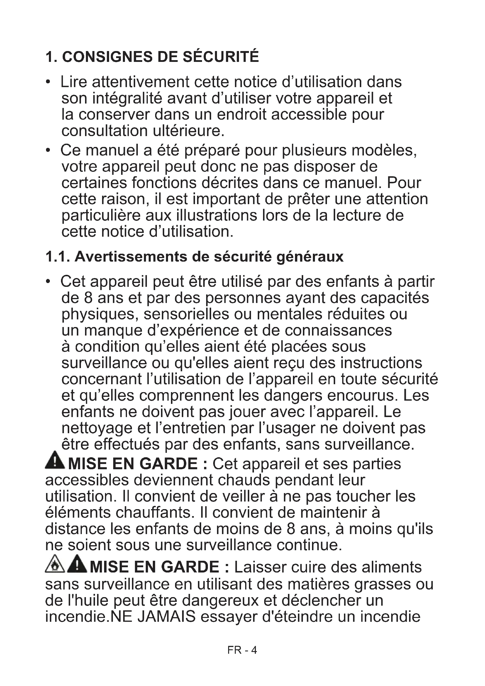 - Cet appareil peut être utilisé par des enfants à partir de 8 ans et par des personnes ayant des capacités physiques, sensorielles ou mentales réduites ou un manque d’expérience et de connaissances à condition qu’elles aient été placées sous surveillance ou qu'elles aient reçu des instructions concernant l’utilisation de l’appareil en toute sécurité et qu’elles comprennent les dangers encourus. Les enfants ne doivent pas jouer avec l’appareil. Le nettoyage et l’entretien par l’usager ne doivent pas être effectués par des enfants, sans surveillance. MISE EN GARDE : Cet appareil et ses parties accessibles deviennent chauds pendant leur utilisation. Il convient de veiller à ne pas toucher les éléments chauffants. Il convient de maintenir à distance les enfants de moins de 8 ans, à moins qu'ils ne soient sous une surveillance continue. MISE EN GARDE : Laisser cuire des aliments sans surveillance en utilisant des matières grasses ou de l'huile peut être dangereux et déclencher un incendie.NE JAMAIS essayer d'éteindre un incendieFR - 5 avec de l'eau, mais arrêter l'appareil puis couvrir les flammes par exemple avec un couvercle ou une couverture anti-feu. MISE EN GARDE : Risque d'incendie: ne pas entreposer d'objets sur les surfaces de cuisson.