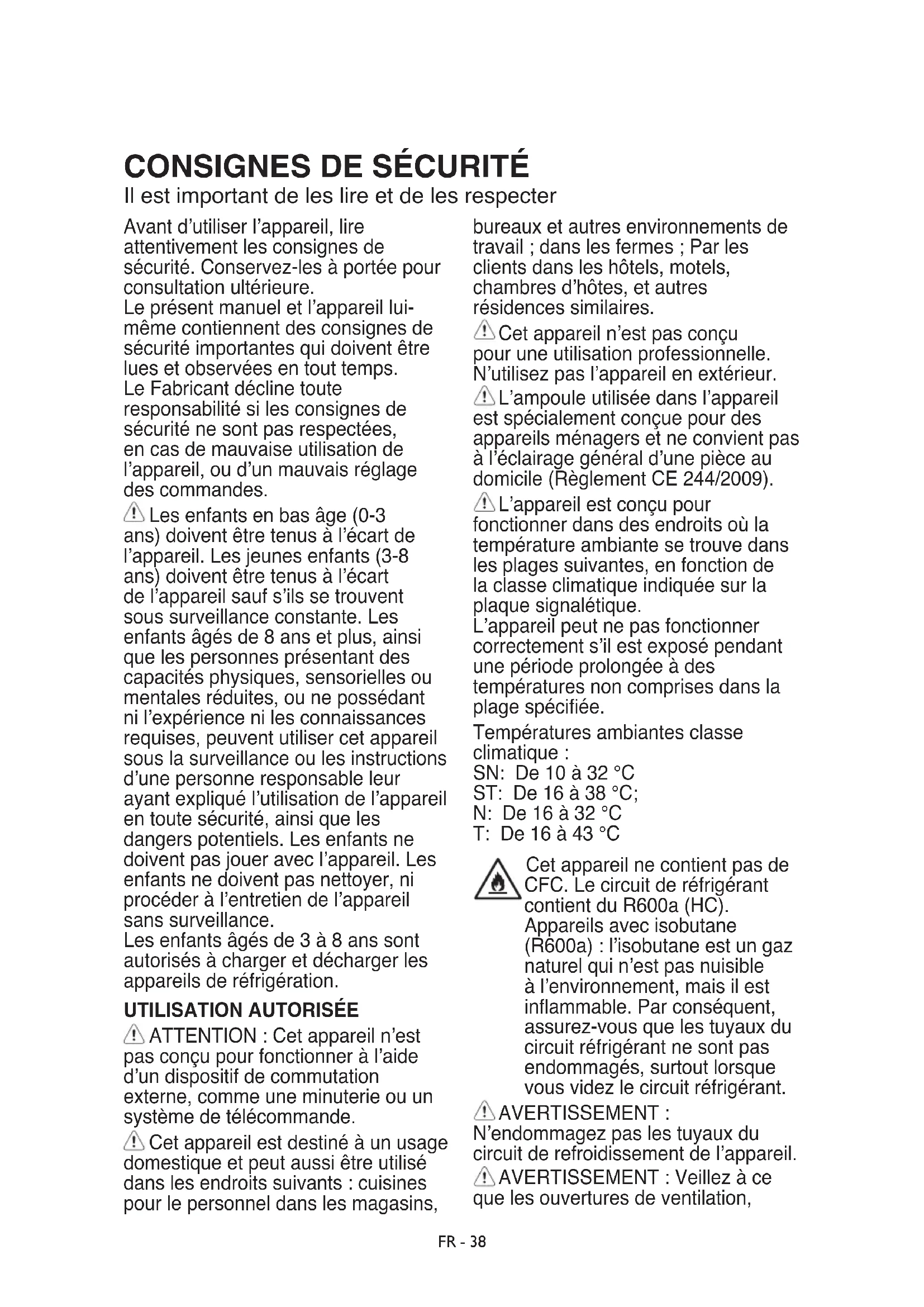 ATTENTION : Cet appareil n’est pas conçu pour fonctionner à l’aide d’un dispositif de commutation externe, comme une minuterie ou un système de télécommande. Cet appareil est destiné à un usage domestique et peut aussi être utilisé dans les endroits suivants : cuisines pour le personnel dans les magasins, bureaux et autres environnements de travail ; dans les fermes ; Par les clients dans les hôtels, motels, chambres d’hôtes, et autres résidences similaires. Cet appareil n’est pas conçu pour une utilisation professionnelle. N’utilisez pas l’appareil en extérieur. L’ampoule utilisée dans l’appareil est spécialement conçue pour des appareils ménagers et ne convient pas à l’éclairage général d’une pièce au domicile (Règlement CE 244/2009). L’appareil est conçu pour fonctionner dans des endroits où la température ambiante se trouve dans les plages suivantes, en fonction de la classe climatique indiquée sur la plaque signalétique. L’appareil peut ne pas fonctionner correctement s’il est exposé pendant une période prolongée à des températures non comprises dans la plage spéciée. Températures ambiantes classe climatique : SN: De 10 à 32 °C ST: De 16 à 38 °C; N: De 16 à 32 °C T: De 16 à 43 °C Cet appareil ne contient pas de CFC. Le circuit de réfrigérant contient du R600a (HC). Appareils avec isobutane (R600a) : l’isobutane est un gaz naturel qui n’est pas nuisible à l’environnement, mais il est inammable. Par conséquent, assurez-vous que les tuyaux du circuit réfrigérant ne sont pas endommagés, surtout lorsque vous videz le circuit réfrigérant.