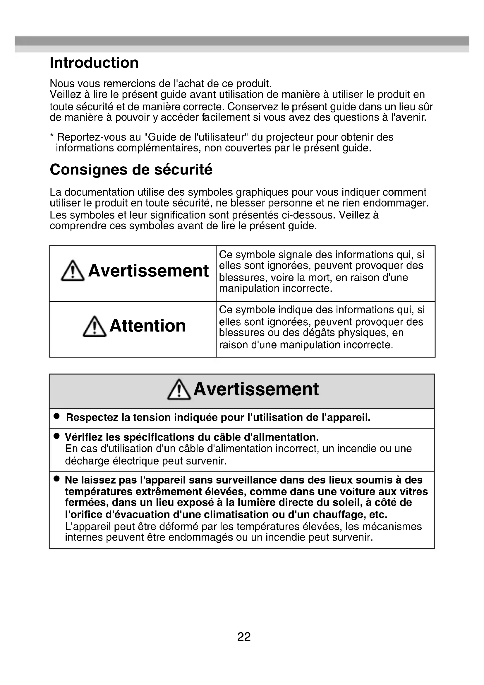 - Reportez-vous au "Guide de l'utilisateur" du projecteur pour obtenir des informations complémentaires, non couvertes par le présent guide. Consignes de sécurité La documentation utilise des symboles graphiques pour vous indiquer comment utiliser le produit en toute sécurité, ne blesser personne et ne rien endommager. Les symboles et leur signification sont présentés ci-dessous. Veillez à comprendre ces symboles avant de lire le présent guide. Avertissement Ce symbole signale des informations qui, si elles sont ignorées, peuvent provoquer des blessures, voire la mort, en raison d'une manipulation incorrecte. Attention Ce symbole indique des informations qui, si elles sont ignorées, peuvent provoquer des blessures ou des dégâts physiques, en raison d'une manipulation incorrecte. Avertissement