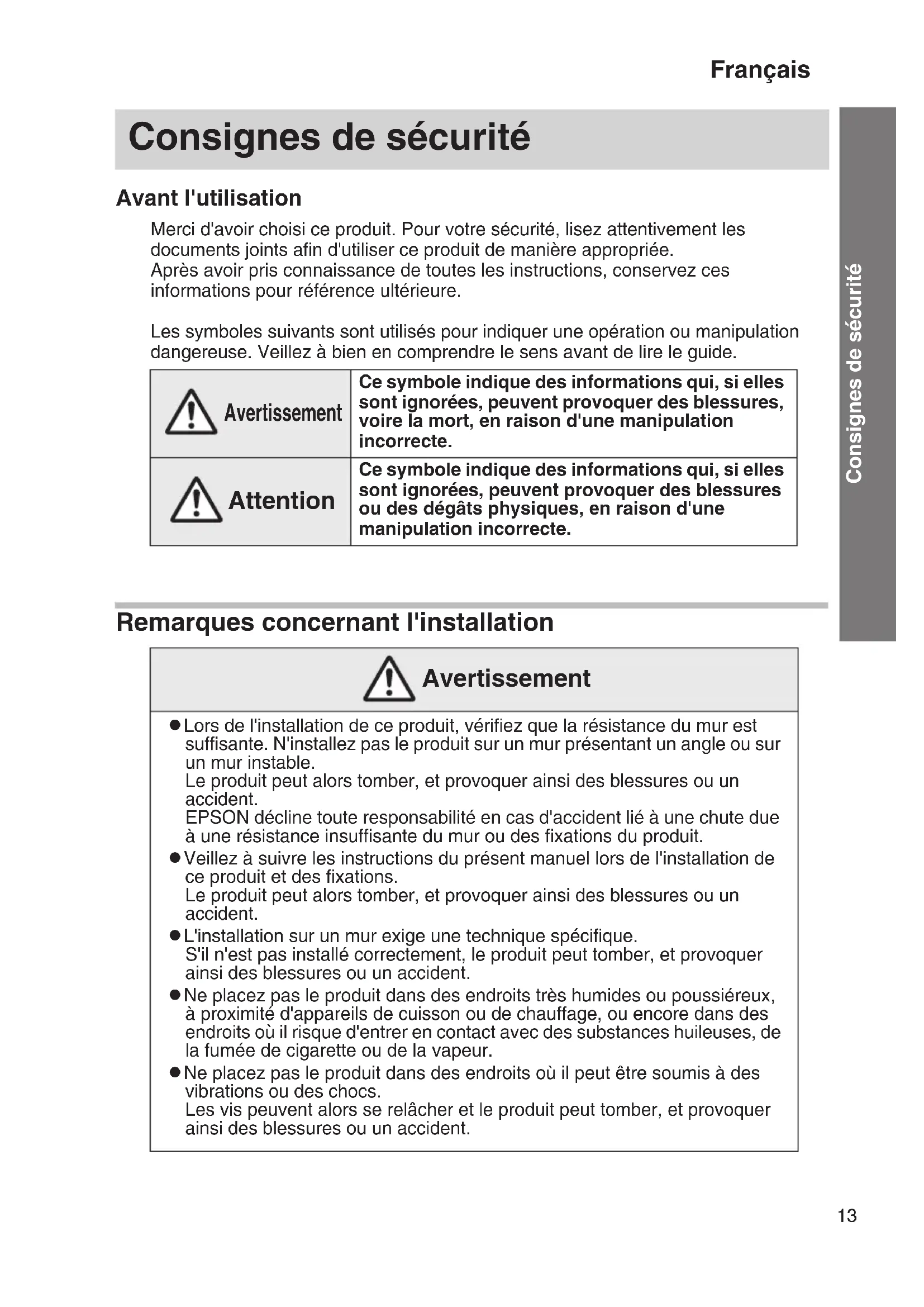 - Ziehen Sie beim Herausziehen des Steckers nicht am Netzkabel, sondern halten Sie den Stecker direkt fest. v Verwenden Sie kein beschädigtes Netzkabel. Anderenfalls besteht die Gefahr eines Brandes oder Stromschlages. Wurde das Netzkabel beschädigt (Kabel liegen frei, sind gebrochen usw.), wenden Sie sich an Ihren Händler oder das Epson-Kundendienst- Callcenter. v Hören Sie nicht für längere Zeit stechende Geräusche o. Ä. bei hoher Lautstärke an. Dies kann einen negativen Einfluss auf Ihr Hörvermögen haben.12 Hinweise zur Lagerung und zum Transport Achtung v Stellen Sie am Anfang keine zu hohe Lautstärke ein. Anderenfalls könnten unerwartet stechende Geräusche ausgegeben werden und möglicherweise Ihr Hörvermögen beschädigen. Stellen Sie deshalb sicher, dass die Lautstärke vor der Audioeingabe eines angeschlossenen Gerätes reduziert und erst allmählich erhöht wird. v Verwenden Sie die Lautsprecher nicht fortwährend bei einer sehr hohen Lautstärke. Anderenfalls könnten ihre Klangeigenschaften nachlassen oder ihre Betriebsdauer extrem verkürzt werden. v Reinigen Sie das Produkt regelmäßig. Wenn das Produkt für einen langen Zeitraum nicht gereinigt wurde, kann sich Staub darauf ansammeln, was zu einem Brand oder Stromschlag führen kann. v Trennen Sie vor der Reinigung alle Kabel vom Produkt. v Verwenden Sie bei der Reinigung des Produkts keine befeuchteten Tücher oder Lösungsmittel wie Alkohol, Verdünner oder Waschbenzin. v Die Lautsprecher sind nicht magnetisch abgeschirmt. Warnung v Lagern Sie das Produkt nicht an Orten, an denen es sich übermäßig erhitzen kann, wie in Fahrzeugen bei geschlossenen Fenstern, in direktem Sonnenlicht oder in der Nähe von Abluftöffnungen von Klimaanlagen. Achtung v Schalten Sie das Produkt vor dem Versetzen aus, trennen Sie es von der Stromversorgung und allen anderen Kabeln.13 Français Consignes de sécurité Avant l'utilisation Merci d'avoir choisi ce produit. Pour votre sécurité, lisez attentivement les documents joints afin d'utiliser ce produit de manière appropriée.Après avoir pris connaissance de toutes les instructions, conservez ces informations pour référence ultérieure.Les symboles suivants sont utilisés pour indiquer une opération ou manipulation dangereuse. Veillez à bien en comprendre le sens avant de lire le guide. Remarques concernant l'installation Consignes de sécurité Avertissement Ce symbole indique des informations qui, si elles sont ignorées, peuvent provoquer des blessures, voire la mort, en raison d'une manipulation incorrecte. Attention Ce symbole indique des informations qui, si elles sont ignorées, peuvent provoquer des blessures ou des dégâts physiques, en raison d'une manipulation incorrecte. Avertissement v Lors de l'installation de ce produit, vérifiez que la résistance du mur est suffisante. N'installez pas le produit sur un mur présentant un angle ou sur un mur instable.Le produit peut alors tomber, et provoquer ainsi des blessures ou un accident.EPSON décline toute responsabilité en cas d'accident lié à une chute due à une résistance insuffisante du mur ou des fixations du produit.v Veillez à suivre les instructions du présent manuel lors de l'installation de ce produit et des fixations.Le produit peut alors tomber, et provoquer ainsi des blessures ou un accident.v L'installation sur un mur exige une technique spécifique.S'il n'est pas installé correctement, le produit peut tomber, et provoquer ainsi des blessures ou un accident.v Ne placez pas le produit dans des endroits très humides ou poussiéreux, à proximité d'appareils de cuisson ou de chauffage, ou encore dans des endroits où il risque d'entrer en contact avec des substances huileuses, de la fumée de cigarette ou de la vapeur.v Ne placez pas le produit dans des endroits où il peut être soumis à des vibrations ou des chocs.Les vis peuvent alors se relâcher et le produit peut tomber, et provoquer ainsi des blessures ou un accident.14 Remarques concernant l'utilisation Avertissement v Veillez à bien mettre ce produit hors tension ainsi que les équipements connectés pendant l'installation. v Veillez à fixer fermement les câbles de sécurité. Pour l'installation des câbles de sécurité, vérifiez que la résistance du plafond est suffisante. v Serrez fermement les vis. Veillez à les serrer de nouveau pour confirmation. Le produit peut alors tomber et provoquer des blessures ou un accident. v N'appliquez pas d'adhésif frein-filet, de lubrifiant ou d'huile sur la zone de fixation du produit. Le boîtier ou la pièce de fixation peut alors se fissurer et entraîner un dysfonctionnement du produit. Le produit peut également tomber et provoquer des blessures ou un accident. Attention v Fixez le produit sans laisser d'espace entre celui-ci et le mur. Vérifiez que les vis sont vissées sans présenter d'angle. Vérifiez si les vis sont serrées fermement. Avertissement v Ne posez aucun objet sur le produit ni ne suspendez d'objet lourd à celui- ci. v Ne desserrez pas les vis après l'installation. Vérifiez leur serrage régulièrement et qu'aucune vis n'est relâchée. Si nécessaire, resserrez fermement. v N’ouvrez aucun couvercle du produit, sauf dans les cas explicitement prévus dans le guide de l'utilisateur, et n'essayez pas de démonter ou de modifier le produit. Ceci peut provoquer un incendie, une électrocution ou un accident car certains composants internes présentent une tension élevée. Confiez toutes les réparations à un technicien qualifié. v Veillez à ne pas renverser de boisson telle que du thé, du café ou du jus de fruit et à pas vaporiser de l'insecticide en aérosol sur le produit. Ceci peut provoquer un dysfonctionnement, un incendie ou une électrocution. Si du liquide est renversé sur le produit, mettez-le hors tension et débranchez immédiatement l'adaptateur secteur. Prenez ensuite contact avec votre fournisseur. Si vous continuez à utiliser le produi