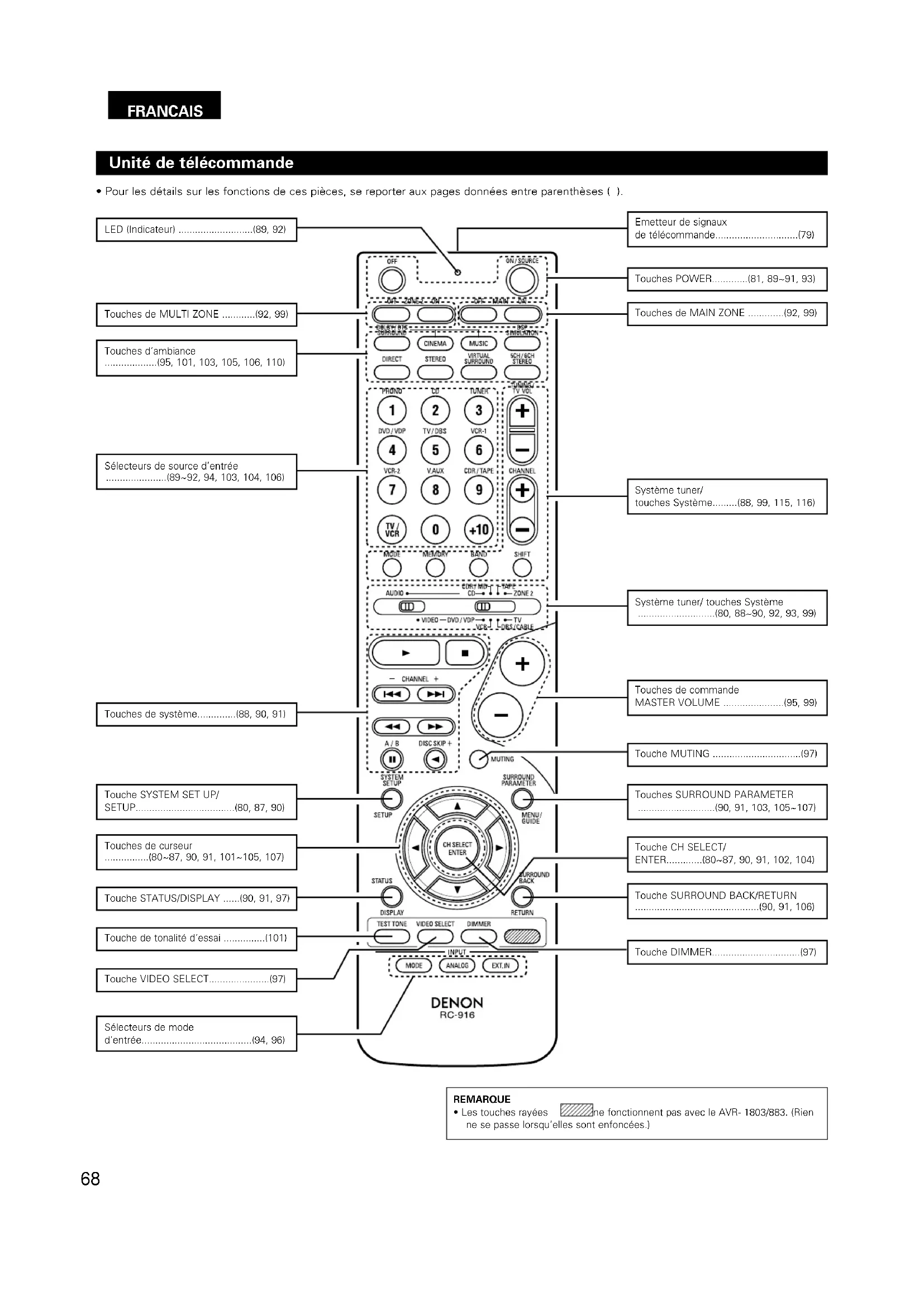 - Les touches rayées ne fonctionnent pas avec le AVR- 1803/883. (Rien ne se passe lorsqu’elles sont enfoncées.)69 FRANCAIS