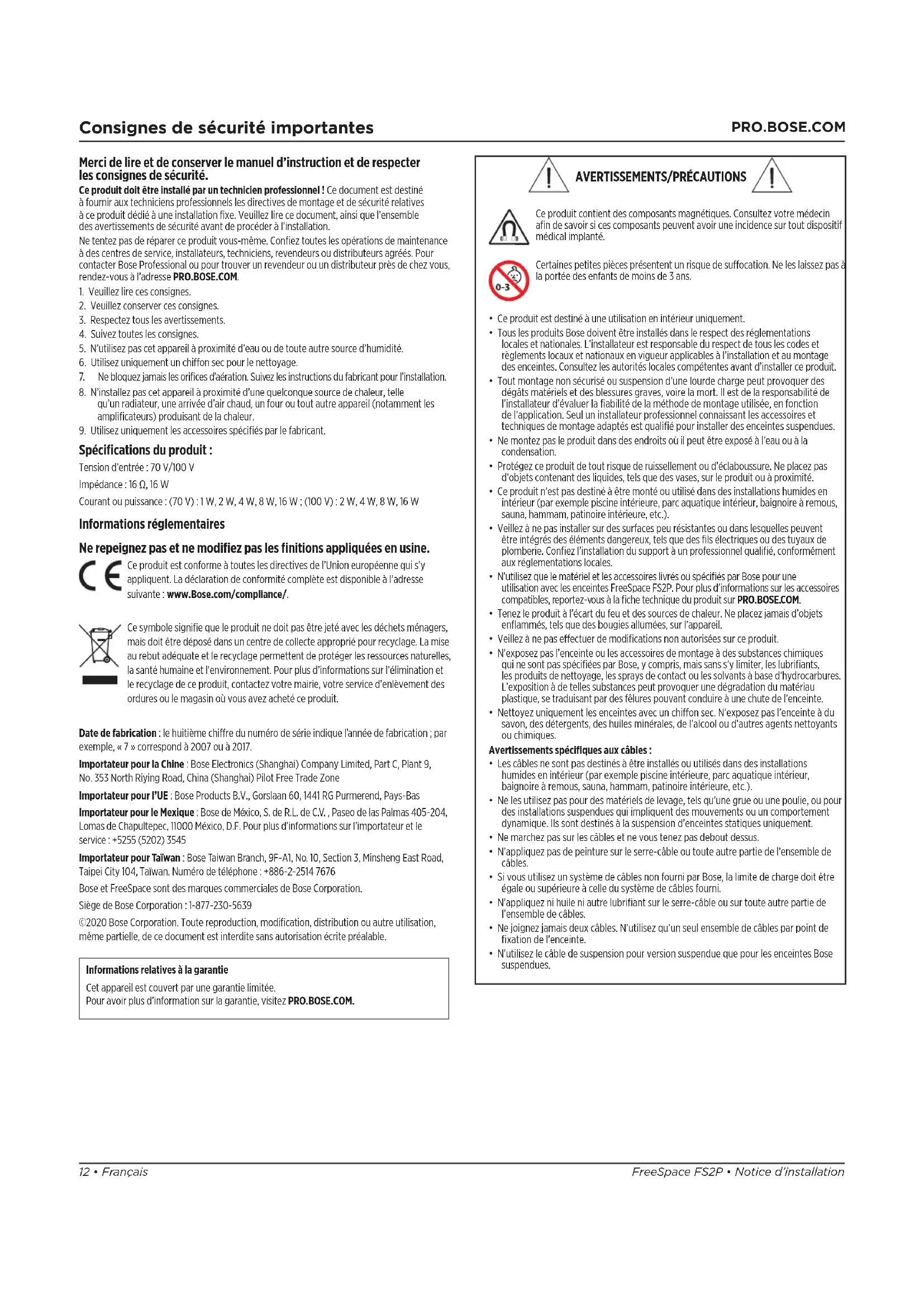 Spécifications du produit: Tension d’entrée: 70V/100V Impédance: 16Ω, 16W Courant ou puissance: (70V): 1W, 2W, 4W, 8W, 16W; (100V): 2W, 4W, 8W, 16W Informations réglementaires Ne repeignez pas et ne modifiez pas les finitions appliquées en usine. Ce produit est conforme à toutes les directives de l’Union européenne qui s’y appliquent. La déclaration de conformité complète est disponible à l’adresse suivante: www.Bose.com/compliance/. Ce symbole signifie que le produit ne doit pas être jeté avec les déchets ménagers, mais doit être déposé dans un centre de collecte approprié pour recyclage. La mise au rebut adéquate et le recyclage permettent de protéger les ressources naturelles, la santé humaine et l’environnement. Pour plus d’informations sur l’élimination et le recyclage de ce produit, contactez votre mairie, votre service d’enlèvement des ordures ou le magasin où vous avez acheté ce produit. Date de fabrication: le huitième chire du numéro de série indique l’année de fabrication; par exemple, «7» correspond à 2007 ou à 2017. Importateur pour la Chine: Bose Electronics (Shanghai) Company Limited, Part C, Plant 9, No. 353 North Riying Road, China (Shanghai) Pilot Free Trade Zone Importateur pour l’UE: Bose Products B.V., Gorslaan 60, 1441 RG Purmerend, Pays-Bas Importateur pour le Mexique: Bose de México, S. de R.L. de C.V. , Paseo de las Palmas 405-204, Lomas de Chapultepec, 11000 México, D.F. Pour plus d’informations sur l’importateur et le service: +5255 (5202) 3545 Importateur pour Taïwan: Bose Taiwan Branch, 9F-A1, No. 10, Section 3, Minsheng East Road, Taipei City 104, Taïwan. Numéro de téléphone: +886-2-2514 7676 Bose et FreeSpace sont des marques commerciales de Bose Corporation. Siège de Bose Corporation: 1-877-230-5639 ©2020 Bose Corporation. Toute reproduction, modification, distribution ou autre utilisation, même partielle, de ce document est interdite sans autorisation écrite préalable. Informations relatives à la garantie Cet appareil est couvert par une garantie limitée. Pour avoir plus d’information sur la garantie, visitez PRO.BOSE.COM.