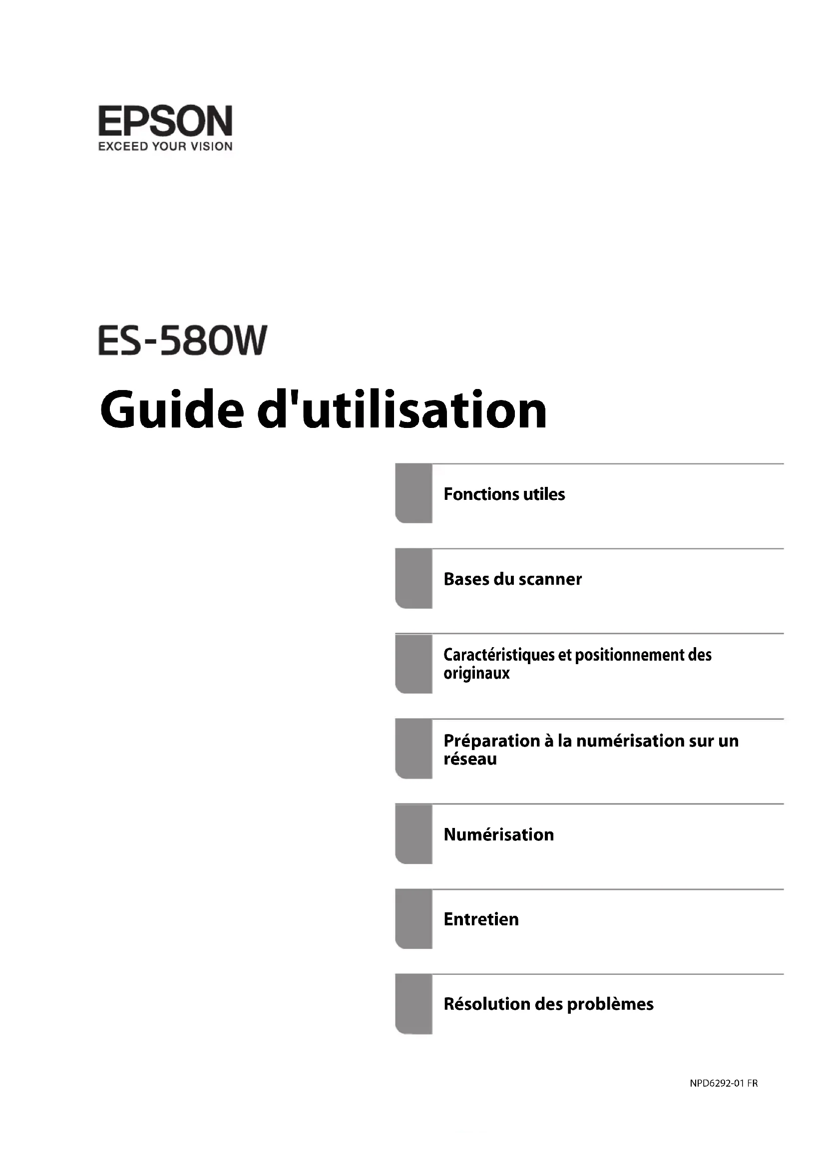 Guide d'utilisation Fonctions utiles Bases du scanner Caractéristiques et positionnement des originaux Préparation à la numérisation sur un réseau Numérisation Entretien Résolution des problèmes NPD6292-01 FRCopyright Aucune partie de cette publication ne peut être reproduite, stockée dans un système de système de récupération de données, ni transmise, sous quelque forme que ce soit ni par aucun procédé électronique ou mécanique, y compris la photocopie, l'enregistrement ou autrement, sans le consentement écrit préalable de Seiko Epson Corporation. Aucune responsabilité ne sera engagée relative à l'utilisation des informations contenues dans ce manuel. Aucune responsabilité n'est assumée pour les dommages résultant des informations contenues dans ce manuel. L'information contenue dans la présente ne peut être utilisée qu'avec ce produit Epson. Epson décline toute responsabilité de l’utilisation de ces informations appliquées à d'autres produits. Neither Seiko Epson Corporation et ses liales ne peuvent être tenus responsables par l'acheteur de ce produit ou des tiers de tout dommage, perte, coût ou dépense encourus par l'acheteur ou des tiers à la suite d'un accident, d’une mauvaise utilisation, d’un abus ou des modications, réparations ou altérations non autorisées de ce produit, ou (sauf aux États-Unis) le non-respect strict des instructions d'exploitation et de maintenance de Seiko Epson Corporation. Seiko Epson Corporation et ses liales ne peuvent être tenus responsables des dommages ou des problèmes découlant de l'utilisation d'options ou de consommables autres que ceux désignés comme des produits Epson authentiques approuvés par Seiko Epson Corporation. Seiko Epson Corporation ne pourra être tenu pour responsable des dommages résultant des interférences électromagnétiques dues à l'utilisation de câbles d'interface autres que ceux désignés comme produits Epson approuvés par Seiko Epson Corporation. © 2020 Seiko Epson Corporation Le contenu de ce manuel et les caractéristiques de ce produit sont modiables sans préavis.Marques commerciales ❏ EPSON, EPSON EXCEED YOUR VISION, EXCEED YOUR VISION et leurs logos sont des marques ou des marques déposées de Seiko Epson.