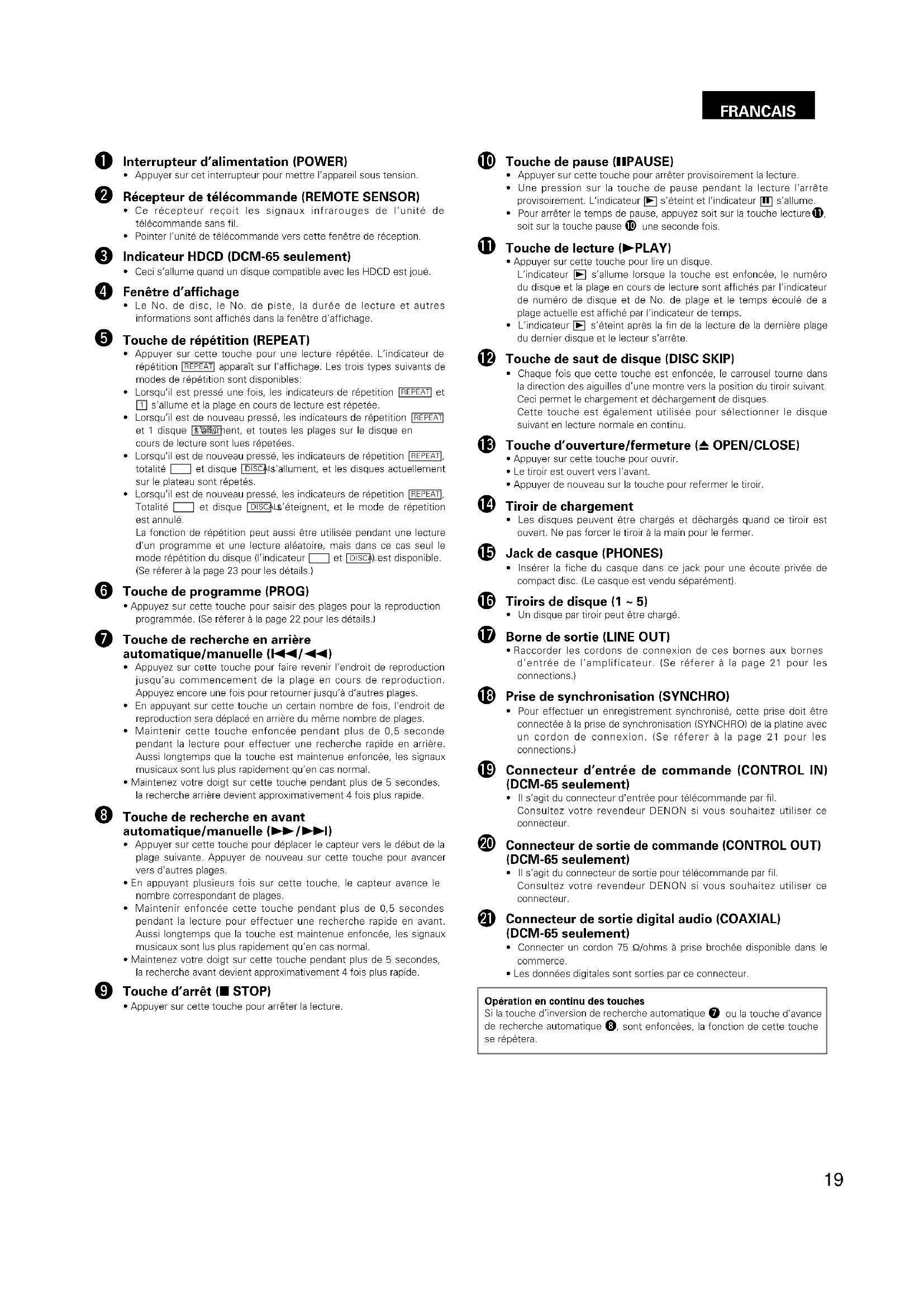 (High Definition Compatible Digital, Compatible Digital Haute Définition) Le HDCD est une technologie de codage/décodage qui réduit considérablement la distorsion survenant lors des enregistrementsdigitaux, tout en restant compatible avec le format CD conventionnel. Le HDCD permet aux données 20-bit d’être converties en données 16-bit des CD courants sans perte de qualité de son. L’utilisation de ce HDCD permet d’atteindre la haute résolution et la basse distorsion caractéristiques du HDCD lors de la lecture de disquescompatibles HDCD, et la technologie digitale de DENON optimise les possibilités de haute qualité de son de la technologie du HDCD. De plus, les CD normaux et les CD compatibles HDCD sont identifiésautomatiquement, et le traitement de signal digital optimum pour ce typede disque est utilisé. (2) Filtre numérique de haute performance Le DCM-65/35 utilise des filtres numériques de haute précision de suréchantillonnage octuple. (3) Lecture simnple des CD simples 8 cm Les CD simples 8 cm peuvent être utilisés sans adaptateur. (4) Programmation jusqu’à 32 plages Toutes les plages d’un disque compact peuvent être programmées pour la lecture dans n’importe quel ordre. La programmation en unités de disque (de toutes les plages sur le disque) est également possible. (5) Mécanisme de changeur de type carrousel nouvellement développé fourni Ce mécanisme peut contenir cinq disques et pendant qu’un disque est en cours de lecture, les quatre disques restants peuvent être changés. De plus, le carrousel peut tourner soit dans le sens des aiguilles d’une montre, soit dans le sens contraire des aiguilles d’une montre, ainsi larecherche entre disques est rapide. (6) Télécommande sans fil accessoire Outre les fonctions générales comme la lecture, l’arrêt et la pause, cette unité de télécommande permet une sélection directe, une programmation directe, une lecture aléatoire et d’autres fonctions. L’unité de télécommande facilite énormément l’utilisation du DCM-65/35, améliorant sa souplesse d’emploi. IMPORTANT (Uniquement modèle pour le marché Canada) Le présent appareil numérique n’émet pas de bruites radioélectriques dépassant les limites applicables aux appareils numériques de la Class B prescrites dans le Réglement sur le brouillage redio- électrique édicté par le ministére des Communications du Canada.NOTE: Ce lecteur CD utilise un laser semi-conducteur. Il est recommandé de l’utiliser dans une pièce où la température est de 10°C (50°F) à 35°C (95°F) pour obtenir un fonctionnement stable et apprécier au maximum la musique.
