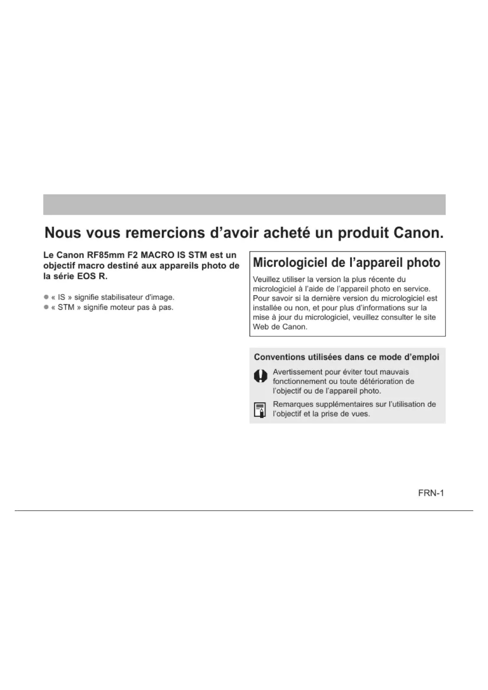 FRN Mode d’emploiFRN-1 Nous vous remercions d’avoir acheté un produit Canon. Le Canon RF85mm F2 MACRO IS STM est un objectif macro destiné aux appareils photo de la série EOS R.