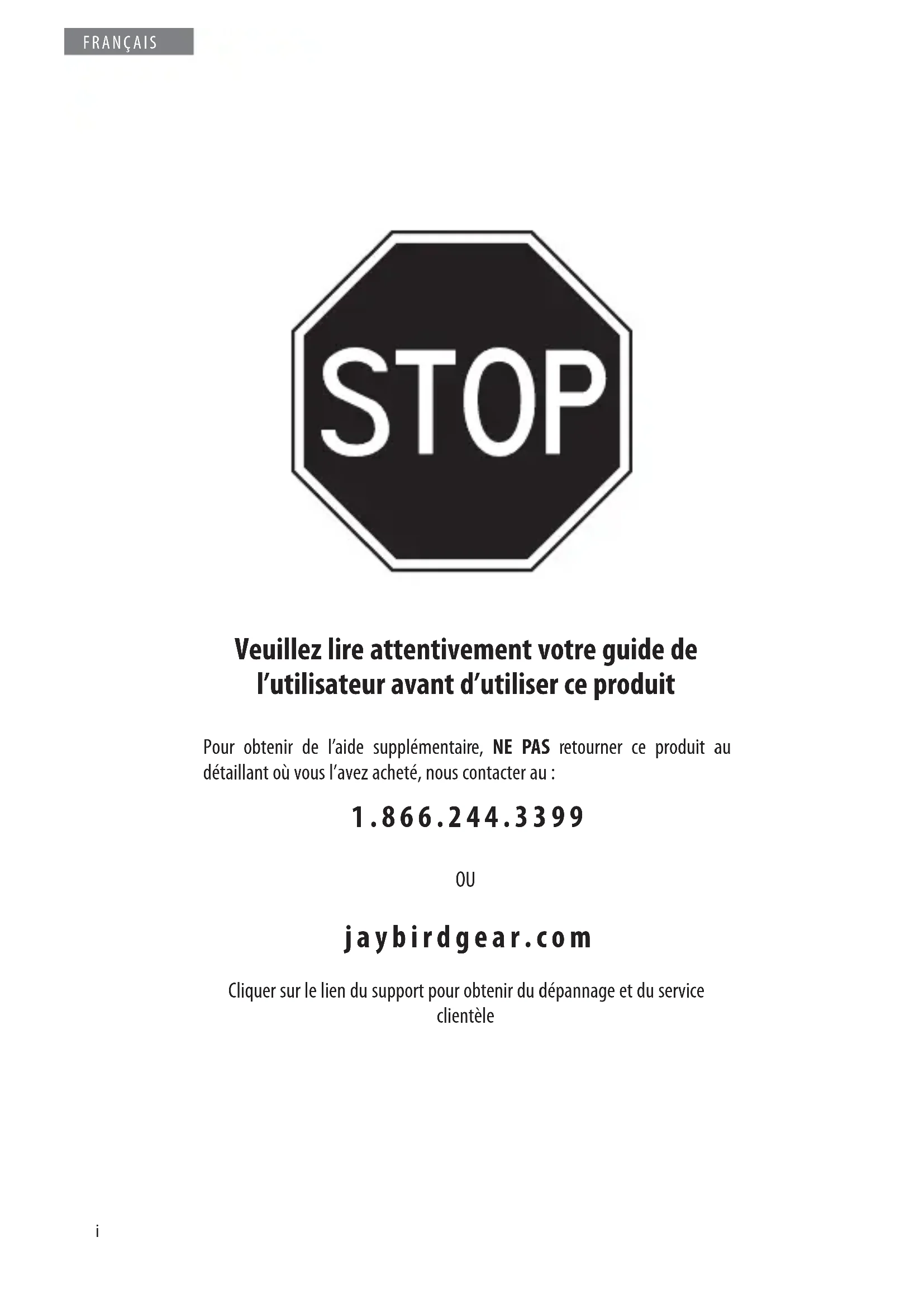 jaybirdgear.com Cliquer sur le lien du support pour obtenir du dépannage et du service clientèleii FRANÇAIS Guide de démarrage rapide Charge : Charger le casque d’écoute stéréo Bluetooth® JB-200 de JayBird pendant 2 heures avant d’utiliser. Voir la page 2 pour obtenir plus de détails. Premier essai : Le casque d’écoute JayBird est conçu pour un ajustement performant dans des conditions extrêmes; c’est un peu comme ajuster des vêtements haute performance pour la première fois. Le fait d’ajuster le casque d’écoute pour la première fois peut sembler un dé , mais il faut persister pendant quelques essais pour apprécier son ajustement haute performance.
