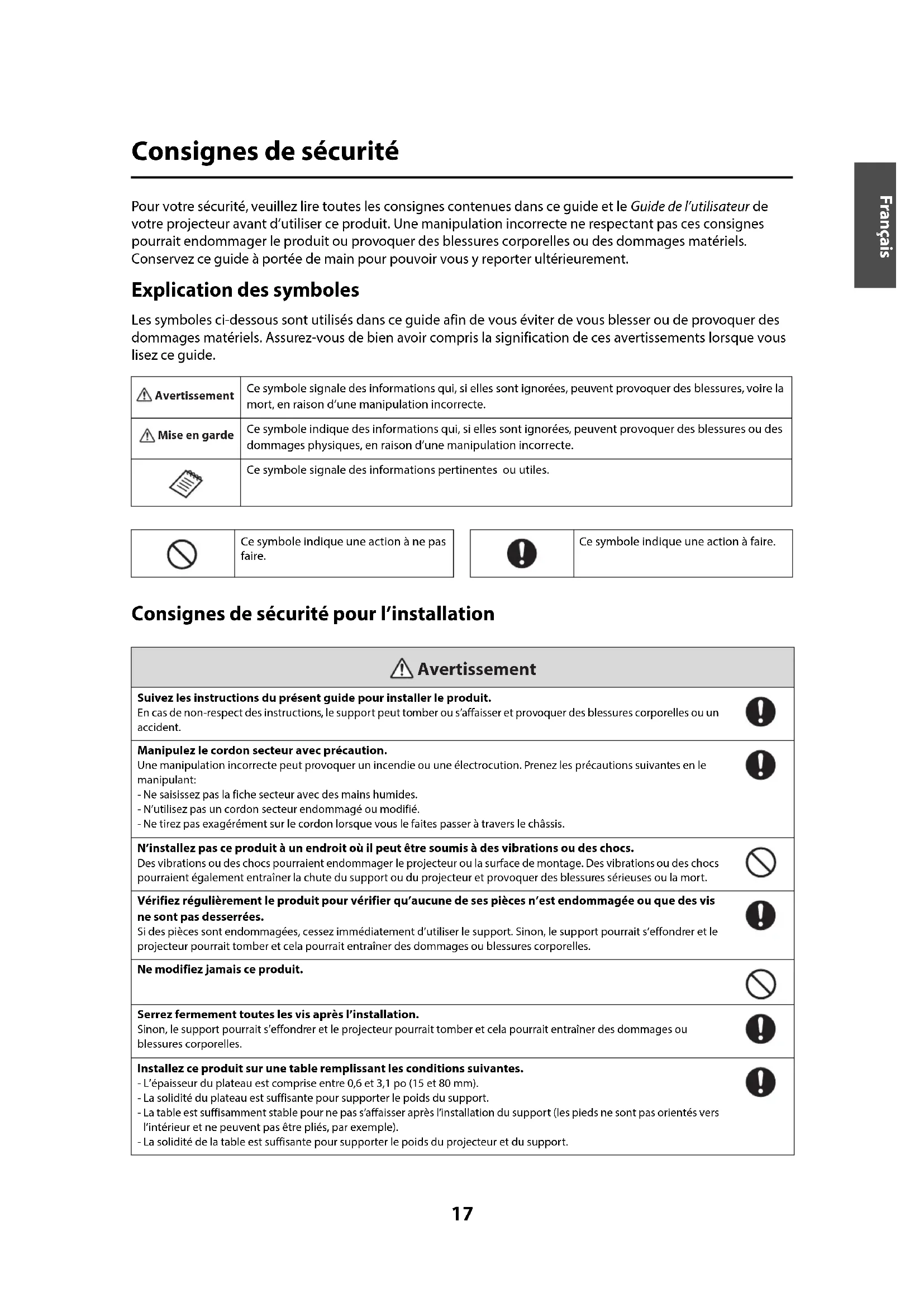 mm) You can change the image size using the projector’s Tele and Wide buttons. You can adjust the projection position using the projector’s Image Shift feature. M4 × 8 mm hexagon socket head cap boltsMount positions9 English Assemble the parts (1) Mount the attachment plate on the projector using M4 ×12 mm hexagon socket head cap bolts (4 bolts with washer and spring washer). (2) Mount the tray on the base frame unit using an M4 × 8 mm hexagon socket head cap bolt. You can mount the tray on either the left or right side of the base frame unit. You can place the pen tray supplied with the projector on the accessory tray. Attachment plate M4 × 12 mm hexagon socket head cap bolts (with washer and spring washer) Accessory tray M4 × 8 mm hexagon socket head cap bolt10 Temporarily mount the base frame unit (1) Loosen the adjuster bolts (×3) to fit the thickness of the tabletop so you can attach the base frame unit to the tabletop. (2) Attach the base frame unit to the table by sliding it onto the edge of the table. Adjuster bolts Base frame unit11 English (3) Fix the adjuster bolts on a flat surface on the bottom side of the tabletop temporarily. Slide the adjuster bolts forward or backward if there are any obstacles on the underside of the table. Adjuster boltsEach adjuster bolt requires a flat surface with at least 2.4 inches(60 mm) in diameter. ❏ Tighten all adjuster bolts firmly after installation. Otherwise, the mount may collapse and the projector may fall, causing damage or personal injury. ❏ Only tighten the adjuster bolts on the flat surface of the underside of the table. Warning12 Install the Touch Unit attachment plate (finger touch models only) (1) Mount the Touch Unit attachment plate on the Touch Unit using M3 × 8 mm hexagon socket cap bolts (×2). (2) Mount the Touch Unit attachment plate on the base frame unit using M3 × 8 mm hexagon socket cap bolts (×2). Touch Unit attachment plate M3 × 8 mm socket cap bolt Base frame unit M3 × 8 mm socket cap bolt Mount so that the Touch Unit attachment plate is flush with the side of the U-shaped arm.13 English (3) Attach the connection cable that is supplied with the Touch Unit to the Touch Unit. Secure the projector to the base frame unit (1) Slide the attachment plate mounted on the projector onto the U-shaped arch from the top. It stops at mounting position or . For information on setting the mounting position, see page 8. For more information on using the Touch Unit, see the projector’s Installation Guide and User’s Guide. Attachment plate Do not place anything under the projector. It may damage the projector during the mounting process. Caution14 (2) Secure the projector with M8 × 35 mm hexagon socket head cap bolts (×2). Determine the position for attaching the table mount (1) Align one side of the U-shaped arch on the base frame unit with the estimated center line of the projected image to align the center of the lens and the center of the image. M8 × 35 mm hexagon socket head cap bolts U-shaped arch Center of the image Table Projected image15 English (2) Tighten the adjuster bolts that were temporarily fixed as shown on page 10. Make sure you tighten the adjuster bolts with equal force. When you have completed the projector installation, connect the necessary cables. Use the cutout on the base frame unit so that the cables do not stick out. For adjusting the image and more details on the projector, refer to the online User's Guide at epson.com/support/brightlinkdownloads (US) or epson.ca/support/ brightlinkdownloads (Canada). Make sure the table does not wobble after you have installed the projector. Tighten all screws firmly. Otherwise, the projector or the mount may fall and cause personal injury or damage. Warning1617 Français Consignes de sécurité Pour votre sécurité, veuillez lire toutes les consignes contenues dans ce guide et le Guide de l’utilisateur de votre projecteur avant d’utiliser ce produit. Une manipulation incorrecte ne respectant pas ces consignes pourrait endommager le produit ou provoquer des blessures corporelles ou des dommages matériels. Conservez ce guide à portée de main pour pouvoir vous y reporter ultérieurement. Explication des symboles Les symboles ci-dessous sont utilisés dans ce guide afin de vous éviter de vous blesser ou de provoquer des dommages matériels. Assurez-vous de bien avoir compris la signification de ces avertissements lorsque vous lisez ce guide. Consignes de sécurité pour l’installation Ce symbole signale des informations qui, si elles sont ignorées, peuvent provoquer des blessures, voire la mort, en raison d’une manipulation incorrecte. Ce symbole indique des informations qui, si elles sont ignorées, peuvent provoquer des blessures ou des dommages physiques, en raison d’une manipulation incorrecte.Ce symbole signale des informations pertinentes ou utiles. Ce symbole indique une action à ne pas faire.Ce symbole indique une action à faire.Suivez les instructions du présent guide pour installer le produit. En cas de non-respect des instructions, le support peut tomber ou s’affaisser et provoquer des blessures corporelles ou un accident.Manipulez le cordon secteur avec précaution. Une manipulation incorrecte peut provoquer un incendie ou une électrocution. Prenez les précautions suivantes en le manipulant:- Ne saisissez pas la fiche secteur avec des mains humides.- N’utilisez pas un cordon secteur endommagé ou modifié.- Ne tirez pas exagérément sur le cordon lorsque vous le faites passer à travers le châssis.N’installez pas ce produit à un endroit où il peut être soumis à des vibrations ou des chocs. Des vibrations ou des chocs pourraient endommager le projecteur ou la surface de montage. Des vibrations ou des chocs pourraient également entraîner la chute du support ou du projecteur et provoquer des blessures sérieuses ou la mort. Vérifiez régulièrement le produit pour vérifier qu’aucune de ses pièces n’e