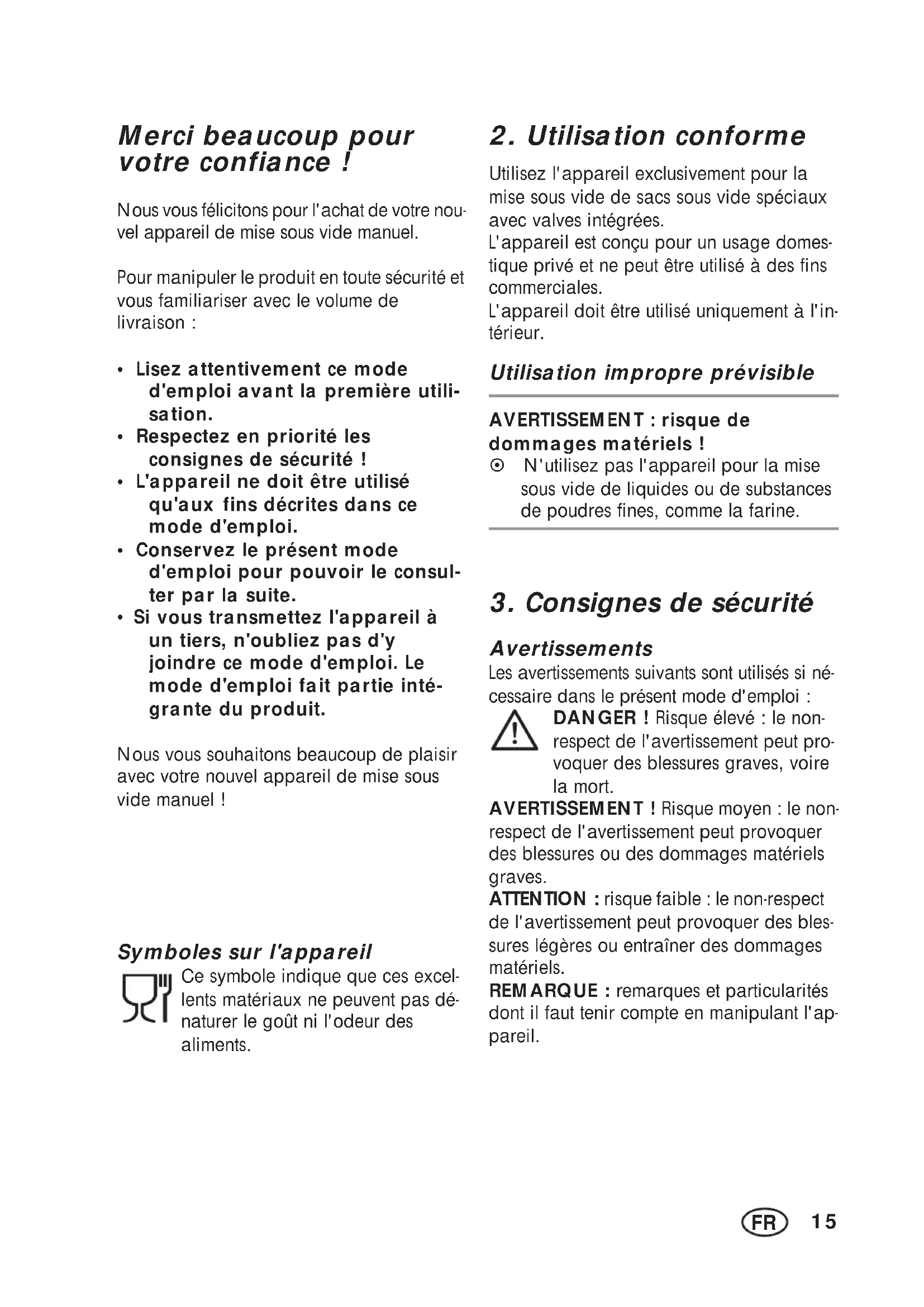 - Si vous transmettez l'appareil à un tiers, n'oubliez pas d'y joindre ce mode d'emploi. Le mode d'emploi fait partie inté- grante du produit. Nous vous souhaitons beaucoup de plaisir avec votre nouvel appareil de mise sous vide manuel ! Symboles sur l'appareil Ce symbole indique que ces excel- lents matériaux ne peuvent pas dé- naturer le goût ni l'odeur des aliments.