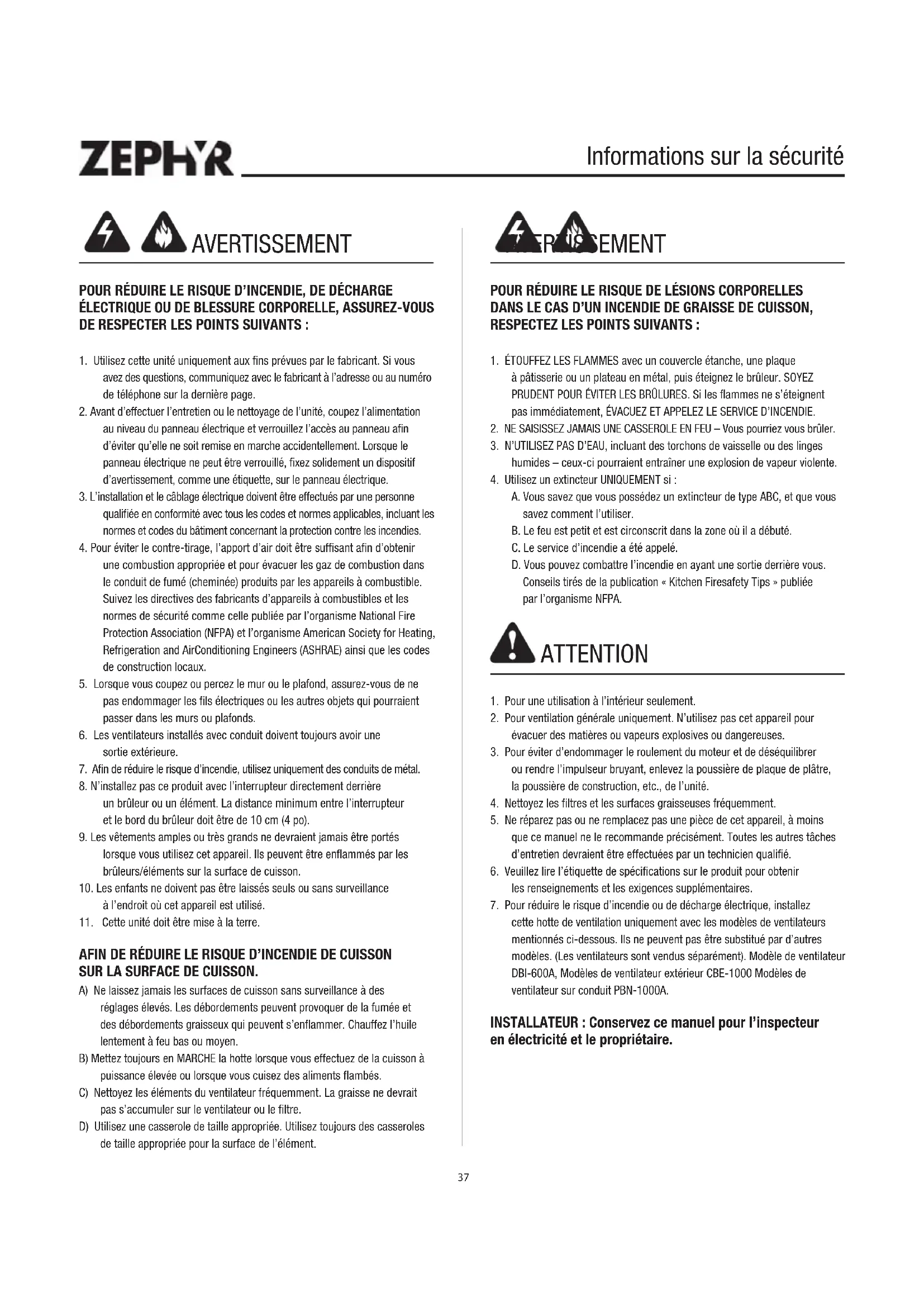 Zephyr Corporation (désigné aux présentes sous le nom de « nous ») garantit au premier acheteur (désigné aux présentes sous le nom de « vous » ou « votre ») de produits Zephyr (les « Produits ») que lesdits produits sont exempts de défauts de fabrication ou de main-d’œuvre selon les conditions suivantes : Garantie de deux ans sur les pièces : Garantie de deux ans à partir de la date d’achat originale du Produit. Nous fournirons sans frais les Produits ou les pièces de remplacement qui comportaient des défauts de fabrication. Nous pourrions choisir, à notre seule discrétion, de réparer ou de remplacer des pièces avant de prendre la décision de rem- placer le Produit. Garantie limitée d’un an sur la main-d’œuvre : Garantie d’un an à partir de la date d’achat originale du Produit. Nous couvrirons sans frais les frais de main-d’œuvre afférents à la réparation du Produit ou des pièces de remplacement qui comportaient des défauts de fabrication. Un an après la date d’achat originale, vous serez responsable de tous les frais de main-d’œuvre associés à la présente garantie. Exclusions de la garantie : Cette garantie ne couvre que la réparation ou le remplacement, à notre gré, de pièces ou de Produits défectueux et ne couvre aucun autre coût afférent aux Produits, dont, sans s’y limiter, les frais liés : (a) à l’entretien normal des Produits et au remplacement des pièces consommables, comme les ampoules, les filtres métalliques, les filtres à charbon et les fusibles; (b) à tout Produit ou pièce ayant été endommagé durant le transport ou étant le résultat d’un mauvais usage, d’une négligence, d’un accident, d’une installation incorrecte ou ne respectant pas les notices d’installation recommandées, d’un entretien ou d’une réparation inapproprié (dont ne nous sommes pas responsables); (c) à une utilisation commerciale ou ne correspondant pas à l’utilisation pour laquelle les Produits sont conçus; (d) à l’usure naturelle du fini, à l’usure due à un entretien inadéquat, à l’utilisation de produits nettoyants corro- sifs ou abrasifs, de tampons nettoyeurs et de produits de nettoyage pour le four; (e) aux éclats, entailles ou fissures résultant d’un abus ou d’une mauvaise utilisation du Produit; (f) aux déplacement d’un technicien de service à votre domicile pour vous montrer comment utiliser les Produits; (g) aux dommages causés par un accident, un incendie, une inondation ou un cas fortuit. Si vous vous trouvez à l’extérieur du territoire que nous desservons, des frais supplémen- taires pourraient s’appliquer pour la livraison des produits à nos points de service désignés pour une réparation sous garantie ou vous pourriez avoir à débourser les frais de déplacement du technicien à votre domicile pour que le Produit soit réparé, enlevé ou réinstallé. Un an après la date d’achat originale du Produit, vous êtes également responsable de tous les frais de main-d’œuvre associés à la présente garantie. Restrictions de la garantie. NOTRE OBLIGATION DE RÉPARER OU DE REMPLACER, À NOTRE GRÉ, LE PRODUIT CONSTITUE VOTRE SEUL ET UNIQUE RECOURS SOUS LA PRÉSENTE GARANTIE. NOUS NE NOUS PORTONS PAS RESPONSABLES POUR TOUT DOMMAGE INDIRECT, ACCESSOIRE OU PARTICULIER RÉSULTANT OU AYANT UN LIEN AVEC L’UTILISATION OU LE RENDEMENT DES PRODUITS. LES GARANTIES EXPRESSES DE LA SEC- TION PRÉCÉDENTE SONT EXCLUSIVES ET TIENNENT LIEU DE TOUTE AUTRE GARANTIE EXPRESSE. PAR LES PRÉSENTES, NOUS REJETONS ET EXCLUONS TOUTE AUTRE GARANTIE EXPRESSE POUR LES PRODUITS ET TOUTES LES GARANTIES TACITES PRÉVUES PAR LA LOI, DONT CELLES RELATIVES À LA QUALITÉ MARCHANDE OU À L'ADÉQUATION DU PRODUIT POUR UNE UTILISATION PARTICULIÈRE. Certains États ou provinces n’autorisent pas les restrictions sur la durée d’une garantie implicite ou l’exclusion ou la restriction des dom- mages indirects ou accessoires; par conséquent, les exclusions et restrictions mentionnées ci-dessus pourraient ne pas s’appliquer à votre cas. Dans la mesure où une loi applicable interdit l’exclusion de garanties implicites, la durée de toute garantie implicite applicable se limite à la période de deux ans décrite ci-dessus. L’unique objectif de toute descrip- tion orale ou écrite est de présenter les Produits et celle-ci ne devrait pas être interprétée comme une garantie expresse. Avant d’utiliser ou de permettre l’utilisation des Produits, vous devrez déterminer si les Produits conviennent aux utilisa- tions prévues et vous devrez assumer tout risque et toute responsabilité relatifs à ces utilisations. Nous nous réservons le droit d’utiliser des pièces reconstruites ou remises à neuf pour remplacer l’une des fonctionnalités dans le cadre de la présente garantie ou de l’une des parties de la présente garantie. L’acheteur original ne peut transférer la présente garantie et celle-ci n’est valide qu’aux États-Unis et au Canada. Pour obtenir du service sous la garantie : Pour avoir droit à du service sous garantie, vous devez : (a) nous avertir en utilisant l’adresse ou le numéro de téléphone inscrit ci-dessous dans les soixante jours suivant la détection du défaut; (b) donner le numéro du modèle, le numéro d’identification de la pièce ainsi que le numéro de série; et (c) décrire la nature de tout défaut de la pièce ou du Produit. Au moment de faire la demande de service sous garantie, vous devrez présenter votre preuve d’achat et la preuve de la date d’achat originale. Si nous déterminons que les exclusions de la garantie énumérées ci-dessus s’appliquent ou si vous vous trouvez dans l’incapacité de nous fournir la documentation nécessaire pour obtenir du service, vous serez responsable de tous les frais d’expédition, de déplacement, de main-d’œuvre ou de tout autre coût afférent au service. Garantie limitée Une pre