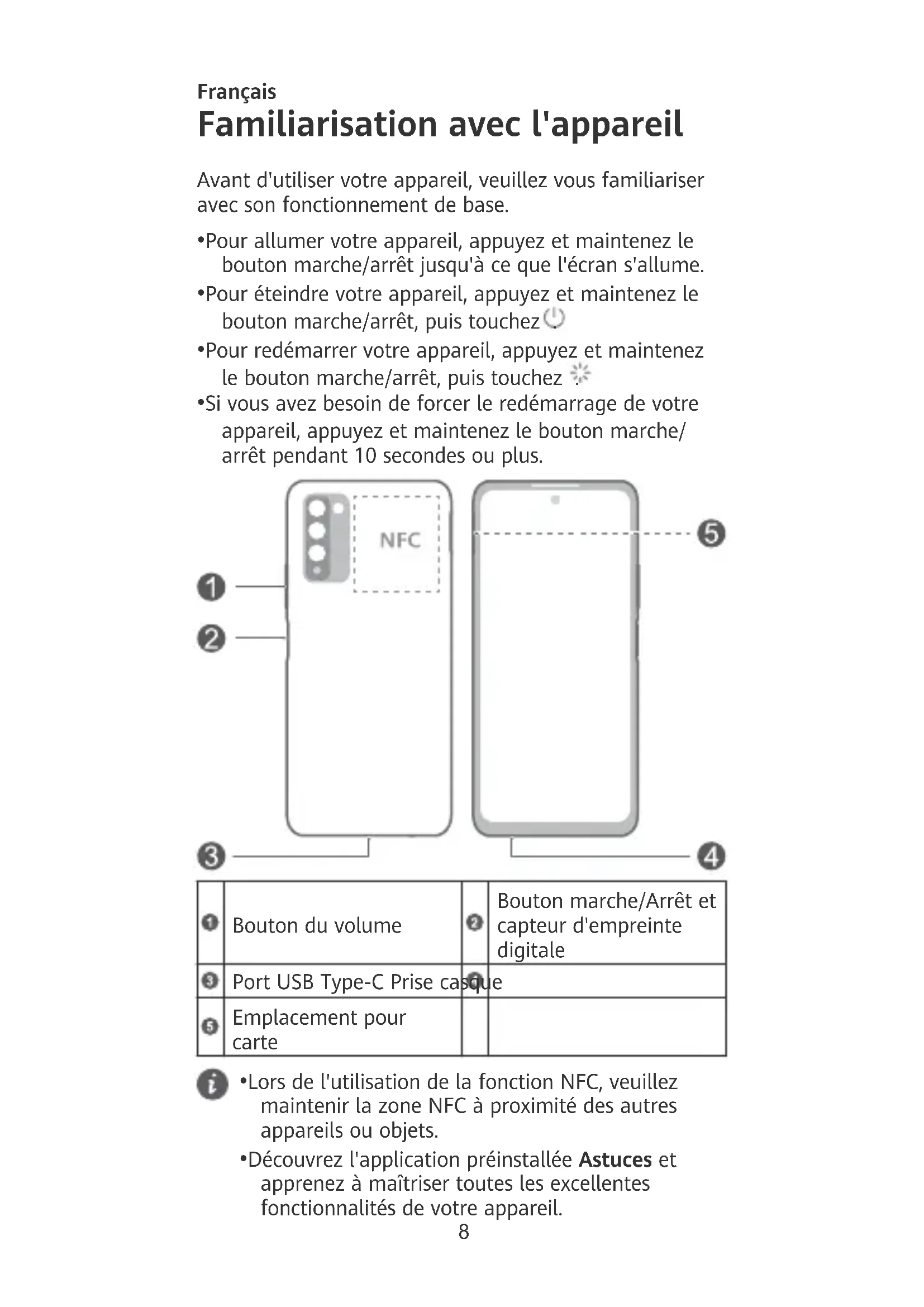 - Découvrez l'application préinstallée Astuces et apprenez à maîtriser toutes les excellentes fonctionnalités de votre appareil. 8Mise en route