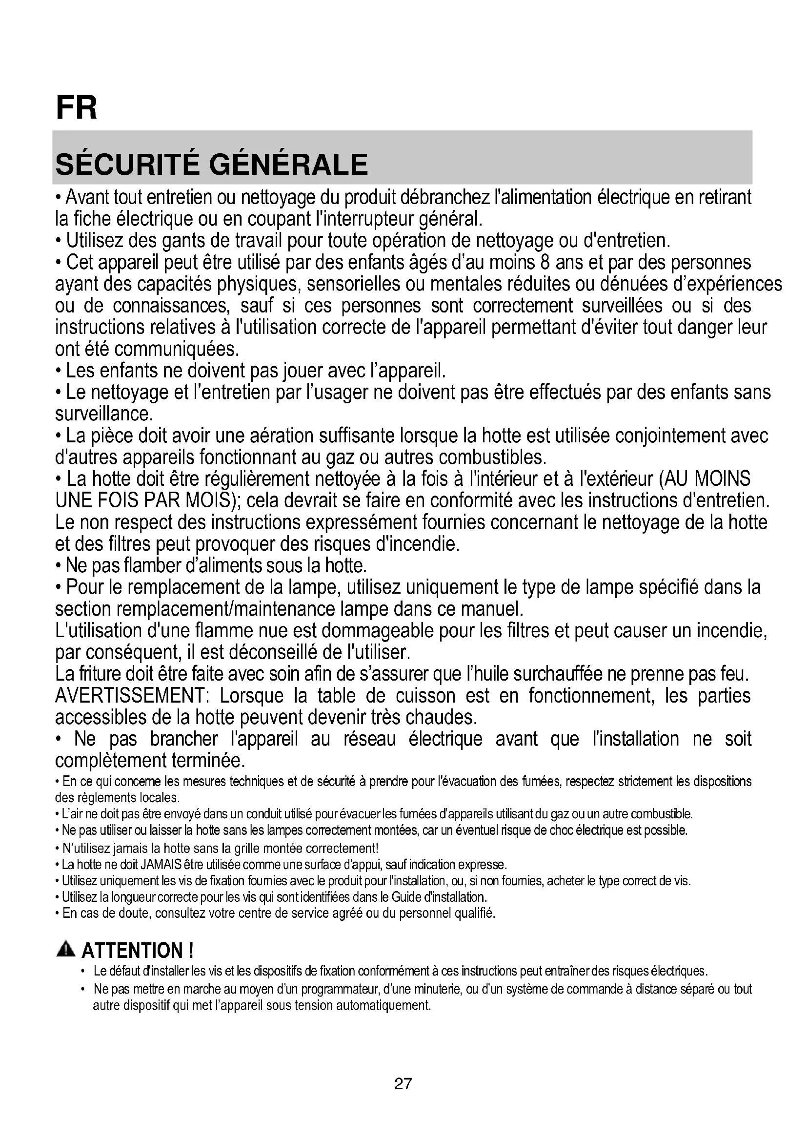 - La hotte doit être régulièrement nettoyée à la fois à l'intérieur et à l'extérieur (AU MOINS UNE FOIS PAR MOIS); cela devrait se faire en conformité avec les instructions d'entretien. Le non respect des instructions expressément fournies concernant le nettoyage de la hotte et des filtres peut provoquer des risques d'incendie.