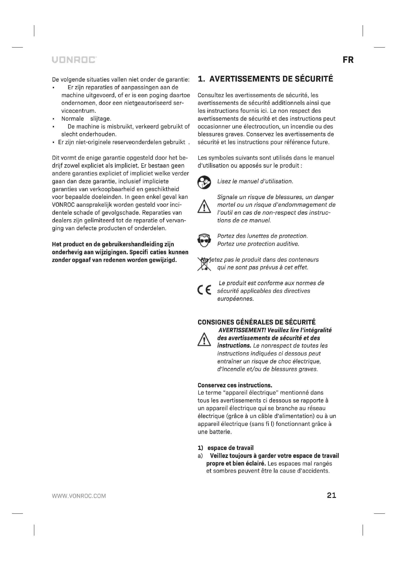 - Des pièces détachées non d’origine ont été utilisées. Ceci constitue l’unique garantie accordée par la société explicitement ou implicitement. Il n’existe aucune autre garantie, explicite ou implicite, qui peut s’étendre au delà du contenu ici présent, y compris les garanties marchandes ou d’adaptation à des fi ns particulières. En aucun cas VONROC ne sera tenu responsable de dommages accidentels ou consécutifs. Les solutions proposées par les reven- deurs devront se limiter à la réparation ou le rempla- cement des éléments ou pièces non conformes. Le produit et le manuel d’utilisation sont sujets à modifi cations. Les spécifi cations peuvent changer sans préavis.