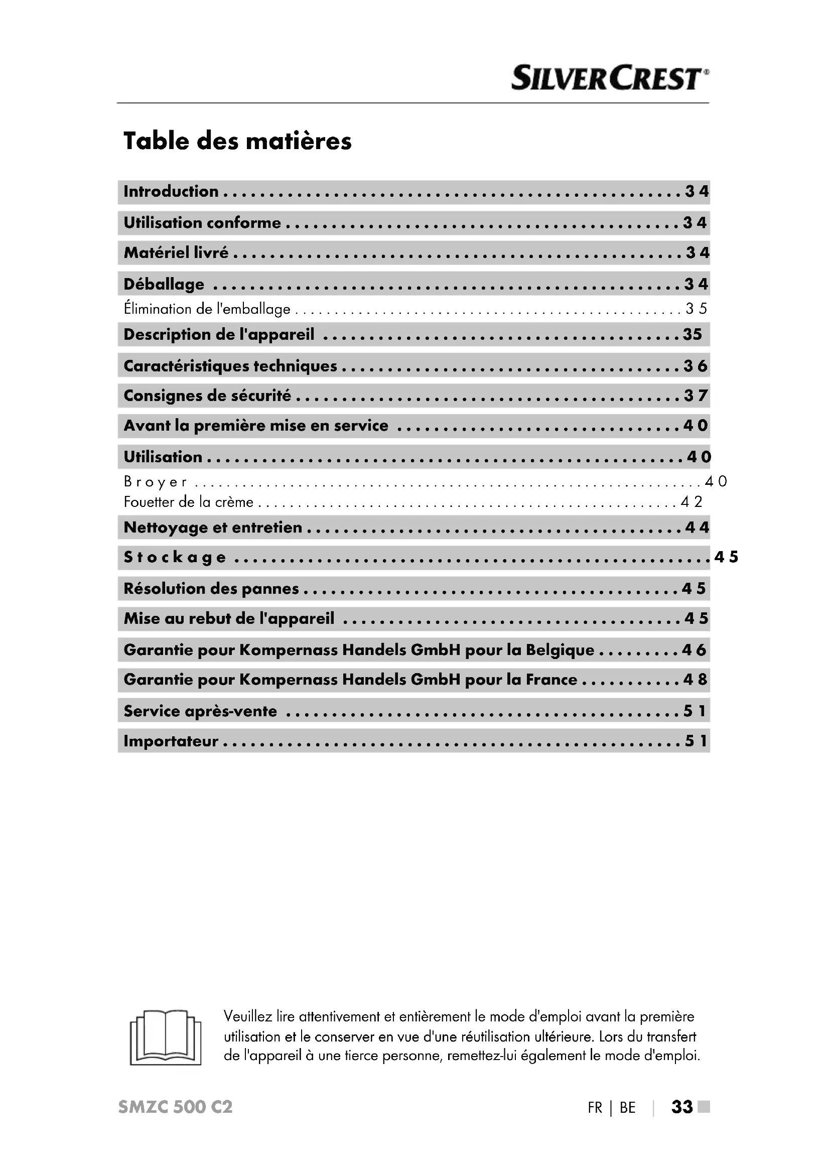 - Importateur Veuillez lire attentivement et entièrement le mode d'emploi avant la première utilisation et le conserver en vue d'une réutilisation ultérieure. Lors du transfert de l'appareil à une tierce personne, remettez-lui également le mode d'emploi.SMZC 500 C2 ■ 34 │ FR│BE Introduction Félicitations pour l'achat de votre nouvel appareil! Vous avez opté pour un produit moderne et de grande qualité. Le présent mode d'emploi fait partie intégrante de ce produit. Il contient des remarques importantes concernant la sécurité, l'usage et la mise au rebut. Avant d'utiliser le produit, veuillez vous familiariser avec toutes les consignes d'utilisation et de sécurité. N'utilisez l'appareil que de la manière indiquée et pour les domaines d'application spécifiés. Si vous cédez le produit à un tiers, remettez-lui également tous les documents. Utilisation conforme Cet appareil sert exclusivement à broyer des produits alimentaires en petite quantité ou à fouetter de la crème ou à émulsionner des liquides. Cet appareil est exclusivement destiné à un usage domestique. Un usage conforme consiste aussi à respecter toutes les informations figurant dans le présent mode d'emploi, en particulier les consignes de sécurité. Toute autre utilisation est considérée comme non conforme et peut entraîner des dommages matériels, voire des accidents. Aucune responsabilité ne peut être assumée au titre de dommages engendrés par un usage non conforme. Matériel livré L'appareil est livré équipé standard avec les composants suivants: ▯ Hachoir multifonction ▯ Porte-lame avec lame ▯ Disque émulsionneur ▯ Anneau antidérapant ▯ Mode d'emploi Déballage p. 51