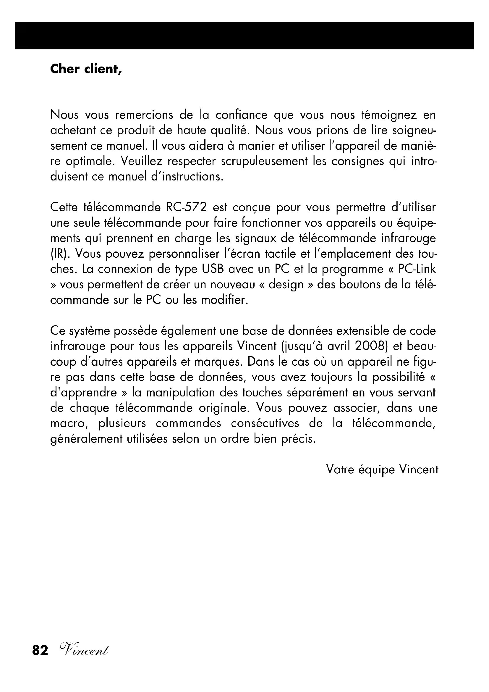 are known to Calculators. To leave the Calculator page, press the key . This universal remote control is equipped with a mathematical calculator for the four basic arithmetic operations and percent calculation. TECHNICAL SPECIFICATIONS Memory: 60MB USB connector: miniUSB B socket USB device class: mass storage LC display with touchpad: monochrome Dimensions: 72 x 130 x 30 mm Weight (without batteries): 170 g Batteries: 3x AAA (LR3)82 Vincent Cher client, Nous vous remercions de la confiance que vous nous témoignez en achetant ce produit de haute qualité. Nous vous prions de lire soigneu- sement ce manuel. Il vous aidera à manier et utiliser l’appareil de maniè- re optimale. Veuillez respecter scrupuleusement les consignes qui intro- duisent ce manuel d’instructions. Cette télécommande RC-572 est conçue pour vous permettre d’utiliser une seule télécommande pour faire fonctionner vos appareils ou équipe- ments qui prennent en charge les signaux de télécommande infrarouge (IR). Vous pouvez personnaliser l’écran tactile et l’emplacement des tou- ches. La connexion de type USB avec un PC et la programme « PC-Link » vous permettent de créer un nouveau « design » des boutons de la télé- commande sur le PC ou les modifier. Ce système possède également une base de données extensible de code infrarouge pour tous les appareils Vincent (jusqu’à avril 2008) et beau- coup d’autres appareils et marques. Dans le cas où un appareil ne figu- re pas dans cette base de données, vous avez toujours la possibilité « d'apprendre » la manipulation des touches séparément en vous servant de chaque télécommande originale. Vous pouvez associer, dans une macro, plusieurs commandes consécutives de la télécommande, généralement utilisées selon un ordre bien précis. Votre équipe VincentVincent
