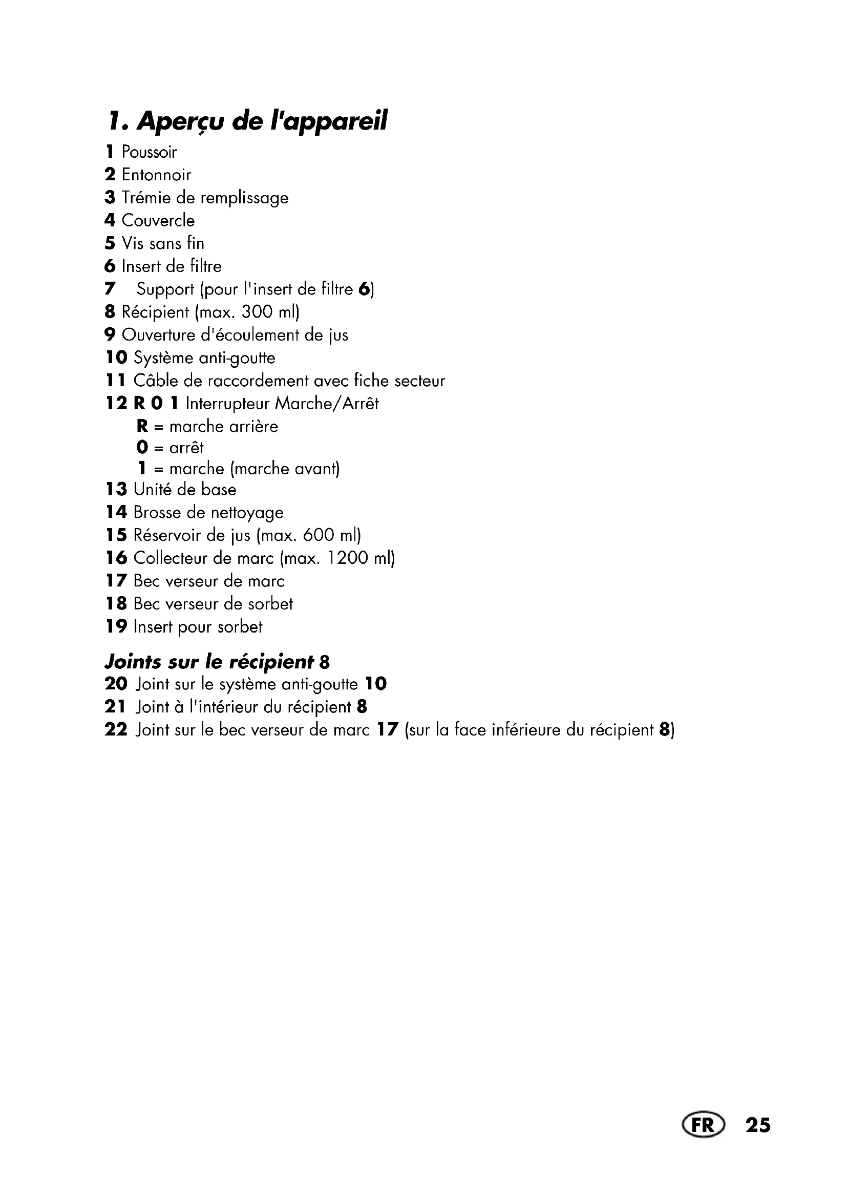 1 Poussoir 2 Entonnoir 3 Trémie de remplissage 4 Couvercle 5 Vis sans fin 6 Insert de filtre 7 Support (pour l'insert de filtre6) 8 Récipient (max. 300 ml) 9 Ouverture d'écoulement de jus 10 Système anti-goutte 11 Câble de raccordement avec fiche secteur 12 R 0 1 Interrupteur Marche/Arrêt R = marche arrière 0 = arrêt 1 = marche (marche avant) 13 Unité de base 14 Brosse de nettoyage 15 Réservoir de jus (max. 600 ml) 16 Collecteur de marc (max. 1200 ml) 17 Bec verseur de marc 18 Bec verseur de sorbet 19 Insert pour sorbet Joints sur le récipient8 20 Joint sur le système anti-goutte10 21 Joint à l'intérieur du récipient8 22 Joint sur le bec verseur de marc17 (sur la face inférieure du récipient8) __331036_Slow Juicer_B6.book Seite 25 Freitag, 8. November 2019 9:49 0926