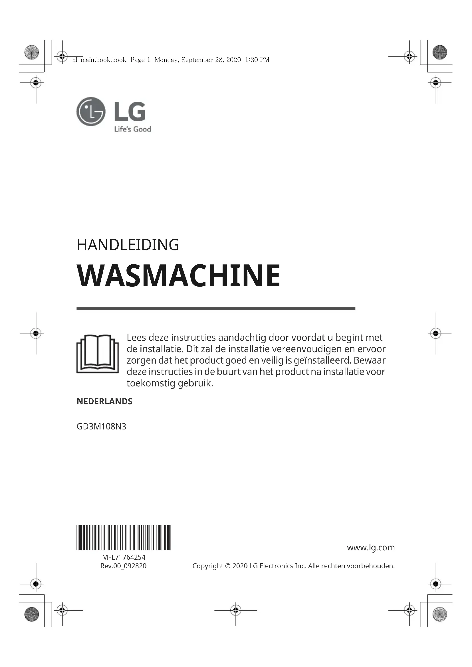 - Deze warme lucht droogt de kleding en komt uit de achterkant van het apparaat. nl_main.book.book Page 56 Monday, September 28, 2020 1:30 PMMANUEL DU PROPRIÉTAIRE LAVE-LINGE Avant de commencer l’installation, lire attentivement ces instructions. Cela simplifiera l’installation et assurera que le produit soit installé correctement et en toute sécurité. Conserver ces instructions à proximité du produit après installation pour référence ultérieure. FRANÇAIS GD3M108N3 www.lg.com Copyright © 2020 LG Electronics Inc. Tous droits réservés fr_main.book.book Page 1 Monday, September 28, 2020 12:13 PMTABLE DES MATIÈRES Ce manuel peut contenir des images ou un contenu différent du modèle que vous avez acheté. Ce manuel est sujet à révision par le fabricant.