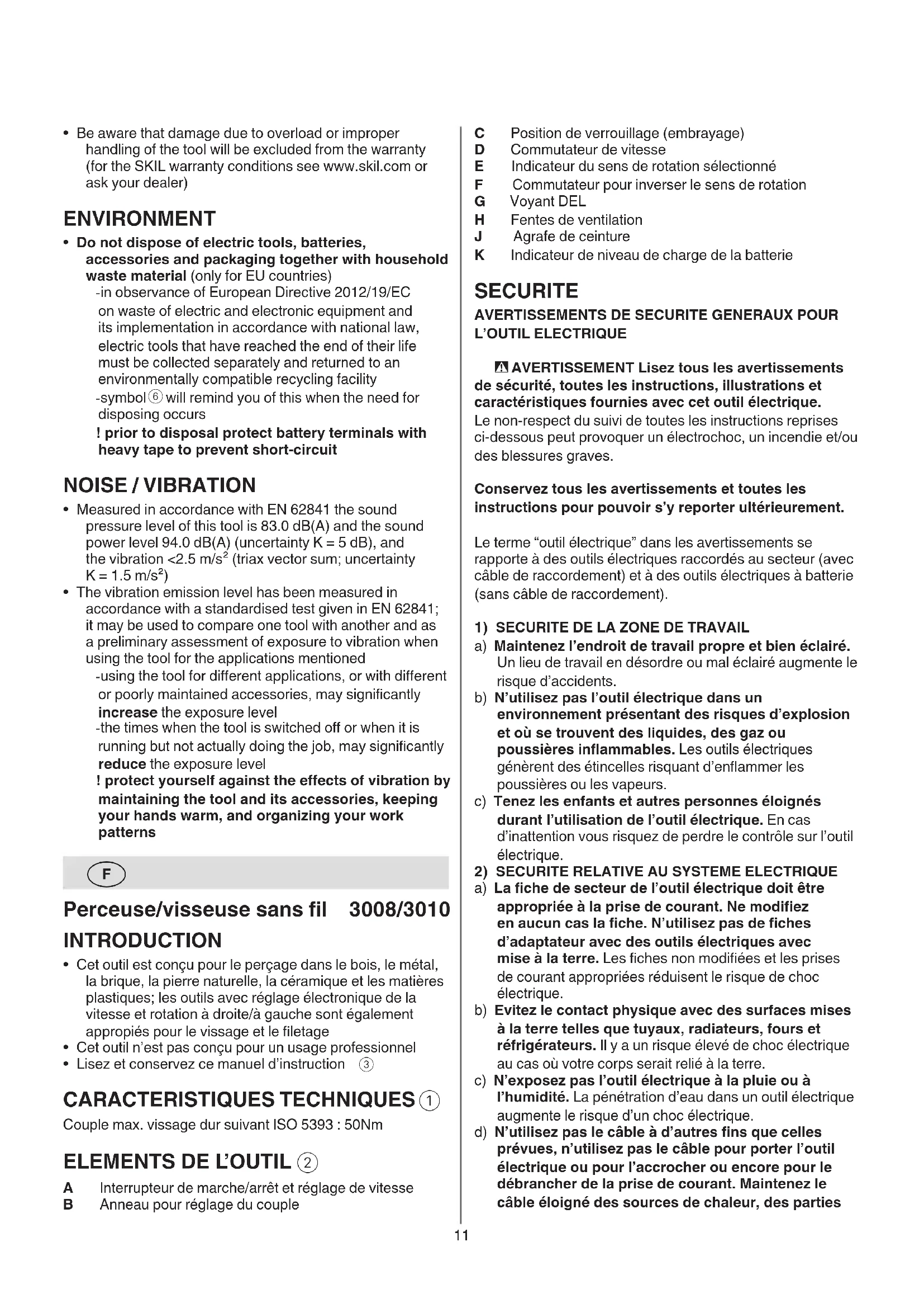 - Veuillez noter que tout dégât causé par une surcharge ou une mauvaise utilisation de l’outil ne sera pas couvert par la garantie (pour connaître les conditions de la garantie SKIL, surfez sur www.skil.com ou adressez-vous à votre revendeur) ENVIRONNEMENT