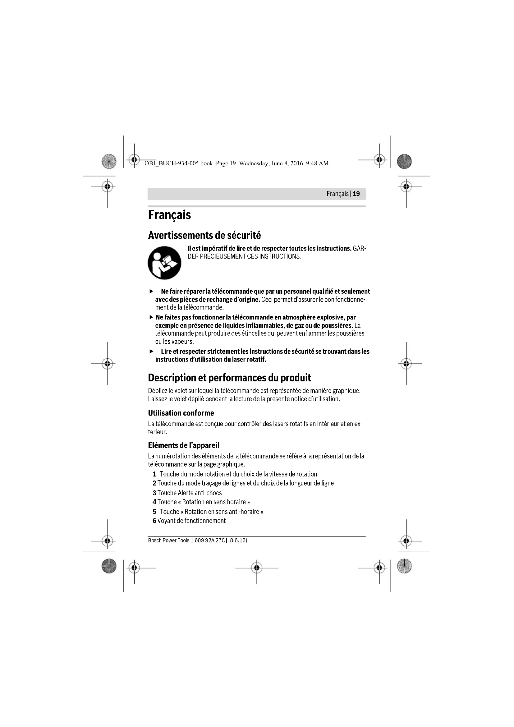 Pour permettre une identification précise de votre télécommande, le numéro de série 10 est marqué sur la plaque signalétique. OBJ_BUCH-934-005.book Page 20 Wednesday, June 8, 2016 9:48 AMFrançais | 21 Bosch Power Tools 1 609 92A 27C | (8.6.16) N’exposez pas la télécommande à des températures extrêmes ou de forts changements de température. Ne la laissez pas trop longtemps dans une voiture p.ex. Si elle est exposée à d’importants changements de température, laissez-la revenir à la température ambiante avant de la mettre en service. Tant que la pile insérée dispose de suffisamment de tension, la télécommande est prête à fonctionner. Placez le laser rotatif de façon à ce que les signaux de la télécommande atteignent une des cellules de réception sur le laser rotatif en direction de celui-ci (voir les instruc- tions d’utilisation du laser rotatif). Si la télécommande ne peut pas être dirigée direc- tement sur une cellule de réception, la zone de travail s’en trouve réduite. Il est pos- sible d’améliorer la portée même pour un signal indirect en réfléchissant le signal (p.ex. auprès d’un mur). Dès qu’une touche de la télécommande a été appuyée, le voyant de fonctionnement 6 s’allume et indique ainsi qu’un signal a été émis. Il n’est pas possible de mettre en marche/arrêter le laser rotatif au moyen de la télé- commande. Modes opératoires Vous trouverez des informations détaillées concernant les fonctions du laser rotatif dans les instructions d’utilisation du laser rotatif. Mode rotation (150/300/600 tr/min) La fonction de la touche du mode rotation 1 sur la télécommande est identique avec celle du laser rotatif. Le laser rotatif est toujours en mode rotation, à la vitesse de rotation moyenne, quand il est mis en service. Pour passer du mode traçage de lignes au mode rotation, appuyez sur la touche du mode rotation 1. Le mode rotation démarre à la vitesse de rotation moyenne. Pour modifier la vitesse de rotation, appuyez à nouveau sur la touche du mode rota- tion 1 jusqu’à ce que la vitesse souhaitée soit atteinte. Mode traçage de lignes, mode marquage de points (10°/25°/50°, 0°) La fonction de la touche du mode traçage de lignes 2 sur la télécommande est iden- tique avec celle du laser rotatif. Pour passer au mode traçage de lignes ou au mode marquage de points, appuyez sur la touche du mode traçage de lignes 2. Le laser rotatif passe au mode traçage de lignes avec le plus petit angle d’ouverture. OBJ_BUCH-934-005.book Page 21 Wednesday, June 8, 2016 9:48 AM22 | Français 1 609 92A 27C | (8.6.16) Bosch Power Tools Pour modifier l’angle d’ouverture, appuyez sur la touche du mode traçage de lignes 2. L’angle d’ouverture est agrandi en deux étapes, en même temps la vitesse de rotation est augmentée à chaque étape. Si l’on appuie sur la touche du mode traçage de lignes 2 une troisième fois, le laser rotatif passe en mode marquage de points après une courte durée de postoscillation. Appuyer à nouveau sur la touche 2 remet l’appareil en mode traçage de lignes avec le plus petit angle d’ouverture. Note : En raison de l’inertie, le laser peut dépasser légèrement les points extrêmes de la ligne laser. Rotation de la ligne laser/du point laser ou du plan de rotation (voir figure A) Une rotation de la ligne laser/du point laser ou du plan de rotation n’est possible qu’au moyen de la télécommande. Lorsque le laser rotatif est en position horizontale, il est possible de positionner la ligne laser (en mode traçage de lignes) ou le point laser (en mode marquage de points) à l’intérieur du plan de rotation du laser. Une rotation de 360° est possible. Pour une rotation dans le sens horaire, appuyez sur la touche 4, pour une rotation dans le sens anti-horaire, appuyez sur la touche 5. En mode rotation, appuyer sur les touches n’a aucun effet. Lorsque le laser rotatif est en position verticale, il est possible de tourner le point la- ser, la ligne laser ou le plan de rotation autour de l’axe verticale. La rotation n’est pos- sible qu’à l’intérieur de la plage de nivellement automatique (5 ° vers la gauche ou vers la droite). Pour une rotation vers la droite, appuyez sur la touche 4, pour une rotation vers la gauche, appuyez sur la touche 5. Reset fonction d’avertissement de choc Le laser rotatif dispose d’une fonction d’avertissement de choc empêchant, en cas de modifications de position ou de secousses du laser rotatif, ou en cas de vibrations, le nivellement sur une hauteur modifiée, évitant ainsi des erreurs de hauteur. La mise en marche ou l’arrêt de la fonction d’avertissement de choc n’est possible que sur le laser rotatif. Une fois que la fonction d’avertissement de choc a été déclenchée, elle peut être redémarrée au moyen de la télécommande. Après le déclenchement de la fonction d’avertissement de choc, la rotation du laser est arrêtée sur le laser rotatif, le laser se met à clignoter, l’affichage de nivellement s’éteint et l’affichage de l’avertissement de chos clignote rouge. Le mode de service actuel est mémorisé. OBJ_BUCH-934-005.book Page 22 Wednesday, June 8, 2016 9:48 AMFrançais | 23 Bosch Power Tools 1 609 92A 27C | (8.6.16) Appuyez sur la touche reset avertissement de choc 3 quand l’avertissement de choc est déclenché. La fonction d’avertissement de choc est redémarrée et le laser rotatif commence le nivellement. Dès que le laser rotatif est nivelé (l’affichage de nivelle- ment du laser rotatif reste allumé vert en permanence), il démarre dans le mode de service mémorisé. Vérifiez maintenant la hauteur du faisceau laser à partir d’un point de référence et, le cas échéant, corrigez la hauteur. Exemple de travail Tourner le plan de rotation en position verticale (voir figure B) Pour aligner la ligne laser verticale ou le plan de rotation auprès d’un point de réfé- 