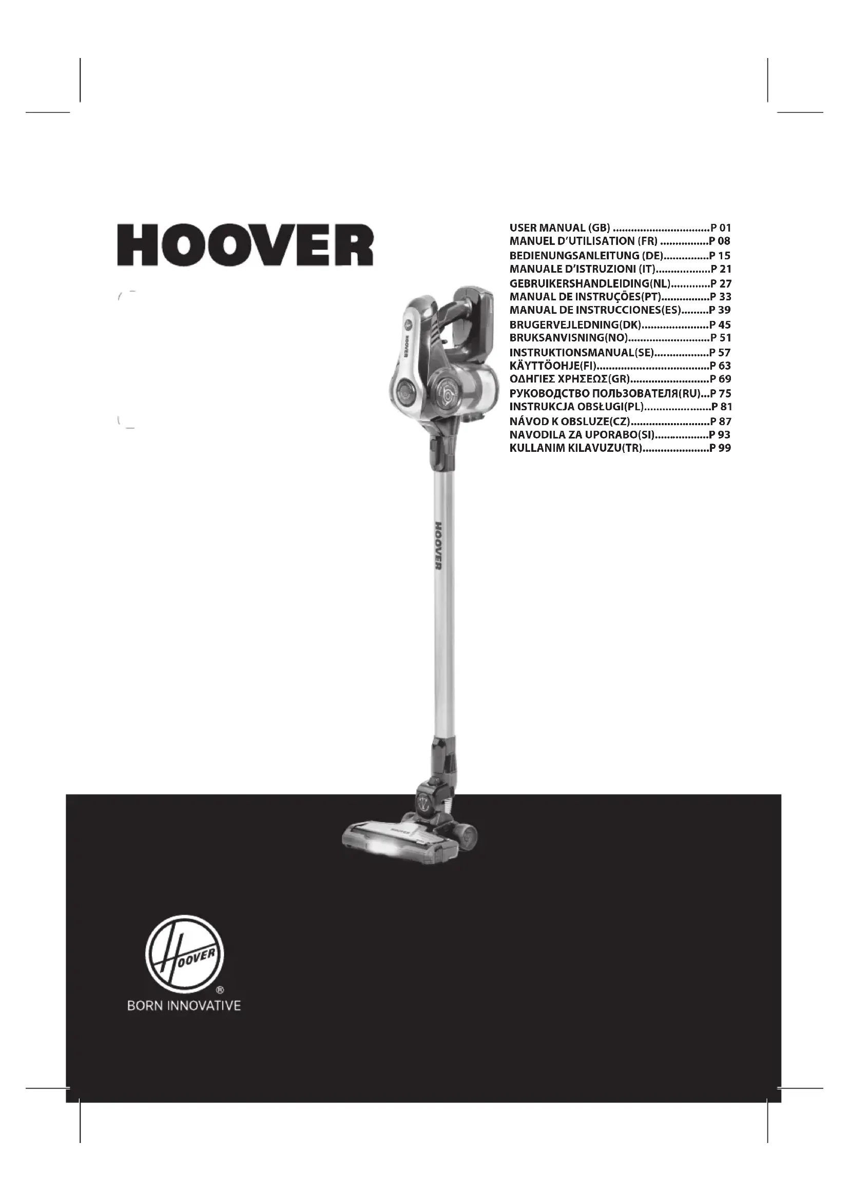 REMARQUE : N’utilisez pas d’eau chaude ou de détergents pour laver les ltres d’évacuation. Dans le cas peu probable où les ltres d’évacuation seraient endommagés, remplacez-les par des ltres de la marque Hoover. Ne tentez pas d’utiliser le produit sans avoir monté le ltre. IMPORTANT : Pour des performances optimales, conservez toujours le ltre à mailles propre. Nous recommandons que le ltre soit lavé au moins une fois par mois. FR12 DEPANNAGE Si vous avez des problèmes avec votre nettoyeur, suivez cette simple liste de vérication avant d’appeler le service clientèle Hoover : A. Le nettoyeur ne s’allume pas Vérifiez que le nettoyeur est chargé. Vérifiez que le bloc batterie est monté en place. B. L’aspirateur s’arrête de fonctionner Vérifiez si le moteur HSpin-Core Technology est bloqué. Dégagez-le et assurez-vous que le levier de mode continu est désactivé. Une fois que cela est fait, appuyez simplement sur le bouton de marche/d’arrêt et le produit redémarrera après quelques secondes. C. Aspiration insufsante ou pas d’aspiration du tout Videz le bac à poussière, lavez le filtre à mailles et nettoyez l’ensemble HSpin-Core Technology. Enlevez la brosse et vérifiez qu’il n’y a pas de blocages dans les conduites. D. Les batteries ne peuvent pas se charger Cela peut être dû à de très longues périodes de stockage (plus de 6 mois). Contactez le service clientèle Hoover pour effectuer le changement de batterie. Si le problème persiste, contactez le service clientèle Hoover. PIÈCES DÉTACHÉES ET CONSOMMABLES HOOVER Toujours remplacer les pièces par des pièces détachées de la marque Hoover. Celles-ci sont disponibles auprès de votre revendeur Hoover. Lorsque vous commandez des pièces, toujours indiquer votre numéro de modèle. VOTRE GARANTIE Les conditions de garantie de cet appareil sont dénies par notre représentant dans le pays où il est vendu et peuvent être obtenues auprès de votre revendeur. Les détails concernant ces conditions peuvent être obtenues auprès du revendeur auprès duquel l’appareil a été acheté. La facture d’achat ou le reçu doivent être présentés pour toutes réclamations relevant des conditions de cette garantie. IMPORTANT : La batterie de cet aspirateur bénécie d’une garantie de 2 ans à partir de la date d’achat. Passés les deux ans, le client est responsable du coût d’acquisition d’une nouvelle batterie. Ces conditions peuvent être modiées sans préavis.