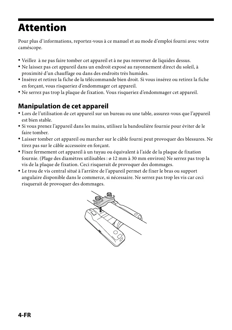 Pour plus d’informations, reportez-vous à ce manuel et au mode d’emploi fourni avec votre caméscope. Veillez à ne pas faire tomber cet appareil et à ne pas renverser de liquides dessus. Ne laissez pas cet appareil dans un endroit exposé au rayonnement direct du soleil, à proximité d’un chauffage ou dans des endroits très humides. Insérez et retirez la fiche de la télécommande bien droit. Si vous insérez ou retirez la fiche en forçant, vous risqueriez d’endommager cet appareil. Ne serrez pas trop la plaque de fixation. Vous risqueriez d’endommager cet appareil.