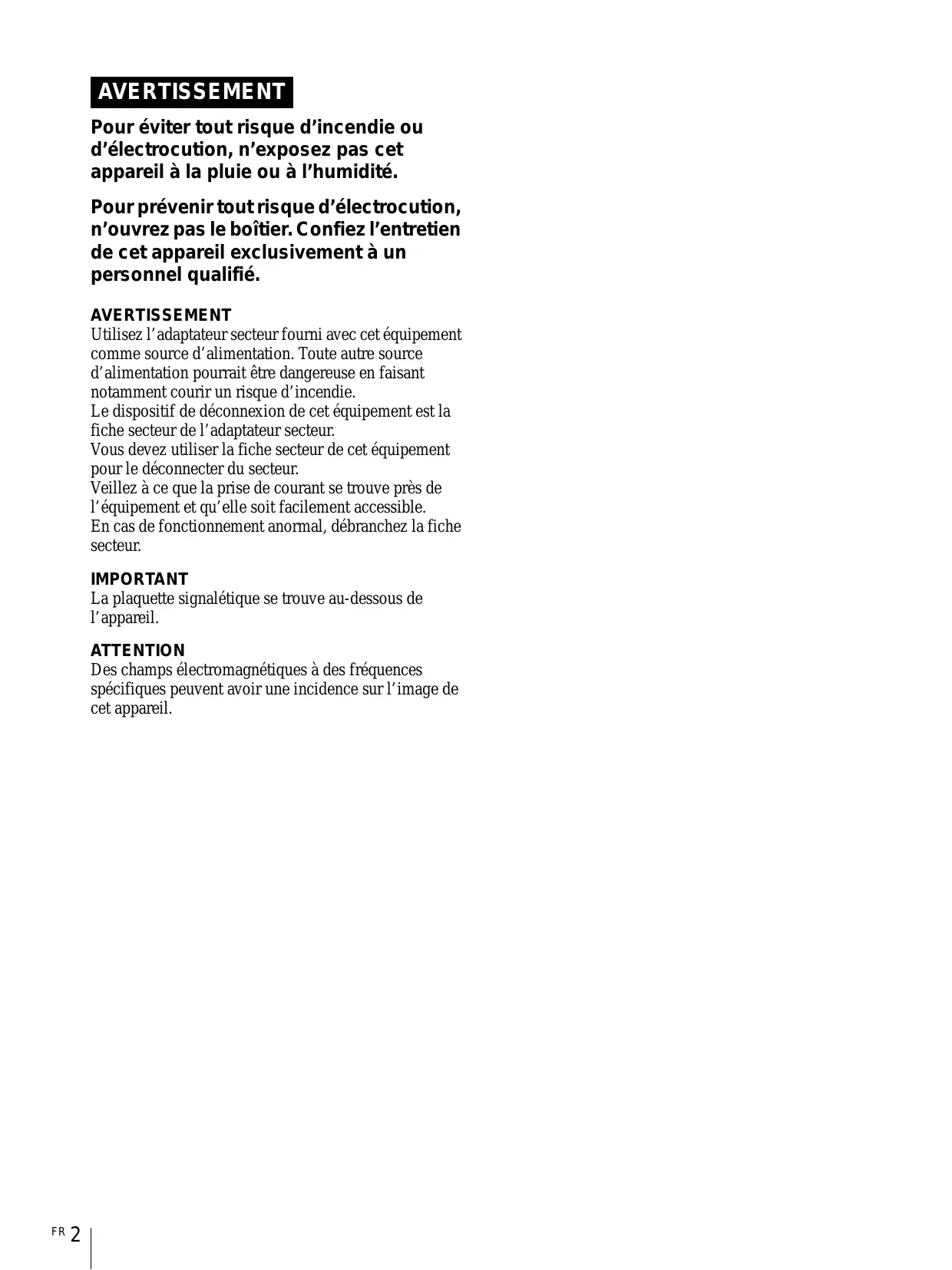 Pour prévenir tout risque d’électrocution, n’ouvrez pas le boîtier. Confiez l’entretien de cet appareil exclusivement à un personnel qualifié. AVERTISSEMENT Utilisez l’adaptateur secteur fourni avec cet équipement comme source d’alimentation. Toute autre source d’alimentation pourrait être dangereuse en faisant notamment courir un risque d’incendie. Le dispositif de déconnexion de cet équipement est la fiche secteur de l’adaptateur secteur. Vous devez utiliser la fiche secteur de cet équipement pour le déconnecter du secteur. Veillez à ce que la prise de courant se trouve près de l’équipement et qu’elle soit facilement accessible. En cas de fonctionnement anormal, débranchez la fiche secteur. IMPORTANT La plaquette signalétique se trouve au-dessous de l’appareil. ATTENTION Des champs électromagnétiques à des fréquences spécifiques peuvent avoir une incidence sur l’image de cet appareil.