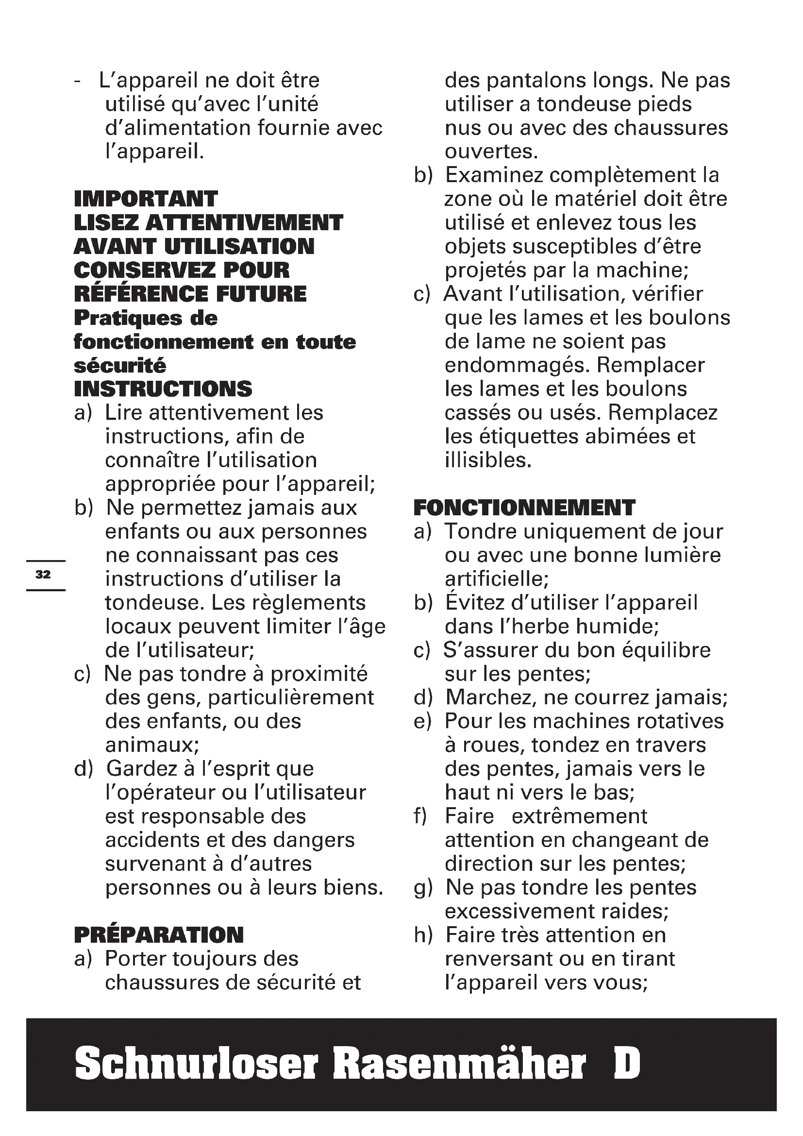 tous les avertissements de sécurité et toutes les instructions. Ne pas suivre les avertissements et instructions peut donner lieu à un choc électrique, un incendie et/ou une blessure sérieuse. Lire attentivement les instructions pour utiliser la machine en toute sécurité. Conserver tous les avertissements et toutes les instructions pour référence future. - Cet appareil n’est pas destiné à être utilisé par des personnes (y compris les enfants) dont les aptitudes physiques, sensorielles ou mentales sont réduites, ou qui manquent d’expérience et de connaissance, à moins qu’elles ne se soient supervisées ou qu’elles n’aient reçus des instructions concernant l’utilisation de l’appareil auprès d’une personne responsable de leur sécurité. - Surveillez les enfants afin de vous assurer qu’ils ne jouent pas avec l’appareil.3232 Schnurloser Rasenmäher D - L’appareil ne doit être utilisé qu’avec l’unité d’alimentation fournie avec l’appareil. IMPORTANT LISEZ ATTENTIVEMENT AVANT UTILISATION CONSERVEZ POUR