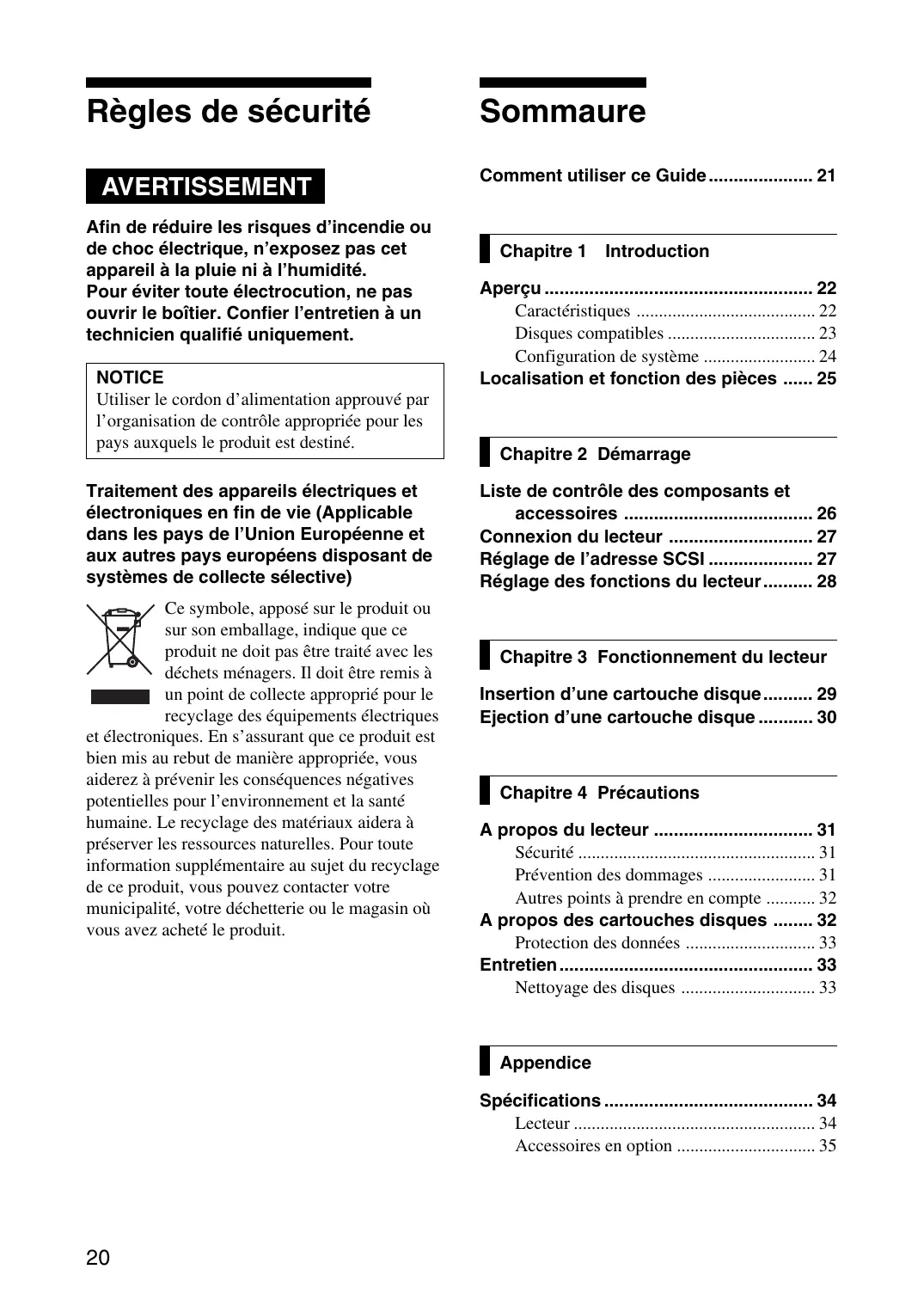 Disable write cache. Règles de sécurité AVERTISSEMENT Afin de réduire les risques d’incendie ou de choc électrique, n’exposez pas cet appareil à la pluie ni à l’humidité. Pour éviter toute électrocution, ne pas ouvrir le boîtier. Confier l’entretien à un technicien qualifié uniquement. NOTICE Utiliser le cordon d’alimentation approuvé par l’organisation de contrôle appropriée pour les pays auxquels le produit est destiné. Traitement des appareils électriques et électroniques en fin de vie (Applicable dans les pays de l’Union Européenne et aux autres pays européens disposant de systèmes de collecte sélective) Ce symbole, apposé sur le produit ou sur son emballage, indique que ce produit ne doit pas être traité avec les déchets ménagers. Il doit être remis à un point de collecte approprié pour le recyclage des équipements électriques et électroniques. En s’assurant que ce produit est bien mis au rebut de manière appropriée, vous aiderez à prévenir les conséquences négatives potentielles pour l’environnement et la santé humaine. Le recyclage des matériaux aidera à préserver les ressources naturelles. Pour toute information supplémentaire au sujet du recyclage de ce produit, vous pouvez contacter votre municipalité, votre déchetterie ou le magasin où vous avez acheté le produit. Sommaure Comment utiliser ce Guide ..................... 21