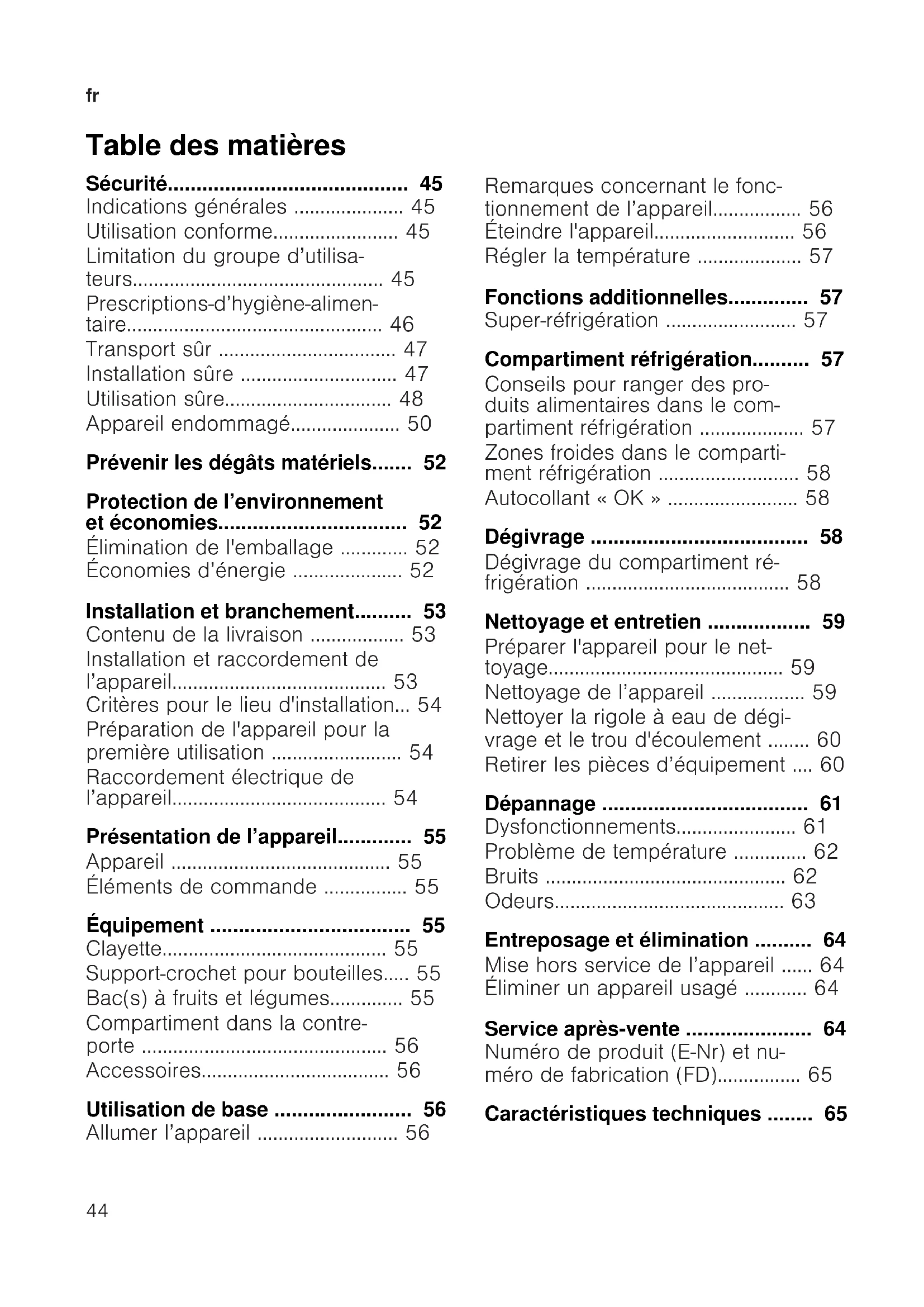 appareil à condition de le faire sous surveillance, ou que son utili- sation sûre leur ait été enseignée et qu’ils aient compris les dan- gers qui en émanent. Les enfants ne sont pas autorisés à jouer avec l'appareil. Le nettoyage de l’appareil, et l’entretien par l’utilisateur, sont des activités que les enfants ne peuvent pas effectuer sans sur- veillance. Les enfants de moins de 8ans doivent être tenus à distance de l’appareil et du cordon d’alimentation secteur. Les enfants à partir de 3 ans et ceux âgés de moins de 8 ans peuvent charger et décharger l'appareil de réfrigération/congéla- tion. Prescriptions-d’hygiène-alimentaire Conformément à la réglementation française visant à empêcher la présence de listeria dans le compartiment réfrigérateur, nous vous remercions de respecter les consignes suivantes. ¡ Nettoyez fréquemment le compartiment intérieur du réfrigérateur à l’aide d’un détergent non agressif, ne provoquant pas d’oxy- dation des pièces métalliques (utilisez par ex. de l’eau tiède ad- ditionnée d’un peu de produit à vaisselle). Ensuite, désinfectez avec de l’eau additionnée de vinaigre ou de jus de citron les surfaces que vous avez préalablement net- toyées, ou utilisez un produit germicide en vente dans le com- merce et adapté aux réfrigérateurs (avant d’utiliser ce produit sur les pièces métalliques, faites un test de compatibilité à un endroit peu visible). ¡ Enlevez les emballages commerciaux avant de mettre les pro- duits alimentaires dans le compartiment réfrigérateur (par ex. le carton qui réunit les pots de yaourt). ¡ Pour éviter toute contamination entre des produits alimentaires de nature différente, rangez-les bien séparés les uns des autres, bien emballés ou rangés dans des récipients à couvercle. ¡ Avant de préparer des plats et de saisir des produits alimen- taires, lavez-vous les mains. Avant de préparer d’autres plats, la- vez-vous à nouveau les mains. Lavez-les encore une fois avant de prendre un repas.Sécurité fr