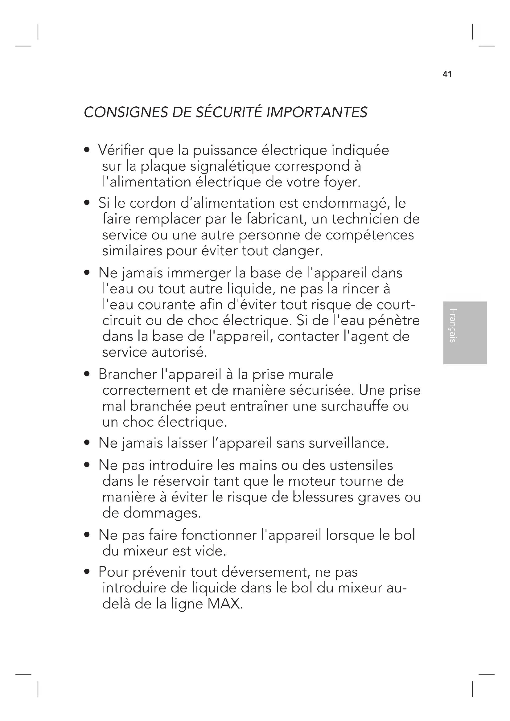 - Pour prévenir tout déversement, ne pas introduire de liquide dans le bol du mixeur au- delà de la ligne MAX.42 Français Français
