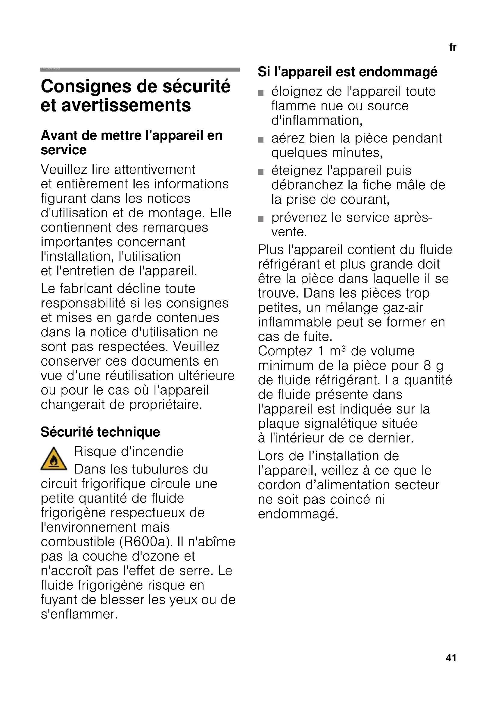 frTable des matières frMode d’emploi Consignes de sécurité et avertissements Avant de mettre l'appareil en service Veuillez lire attentivement et entièrement les informations figurant dans les notices d'utilisation et de montage. Elle contiennent des remarques importantes concernant l'installation, l'utilisation et l'entretien de l'appareil. Le fabricant décline toute responsabilité si les consignes et mises en garde contenues dans la notice d'utilisation ne sont pas respectées. Veuillez conserver ces documents en vue d’une réutilisation ultérieure ou pour le cas où l’appareil changerait de propriétaire. Sécurité technique Risque d’incendie Dans les tubulures du circuit frigorifique circule une petite quantité de fluide frigorigène respectueux de l'environnement mais combustible (R600a). Il n'abîme pas la couche d'ozone et n'accroît pas l'effet de serre. Le fluide frigorigène risque en fuyant de blesser les yeux ou de s'enflammer. Si l'appareil est endommagé ■ éloignez de l'appareil toute flamme nue ou source d'inflammation, ■ aérez bien la pièce pendant quelques minutes, ■ éteignez l'appareil puis débranchez la fiche mâle de la prise de courant, ■ prévenez le service après- vente. Plus l'appareil contient du fluide réfrigérant et plus grande doit être la pièce dans laquelle il se trouve. Dans les pièces trop petites, un mélange gaz-air inflammable peut se former en cas de fuite. Comptez 1 m³ de volume minimum de la pièce pour 8 g de fluide réfrigérant. La quantité de fluide présente dans l'appareil est indiquée sur la plaque signalétique située à l'intérieur de ce dernier. Lors de l’installation de l’appareil, veillez à ce que le cordon d’alimentation secteur ne soit pas coincé ni endommagé.fr