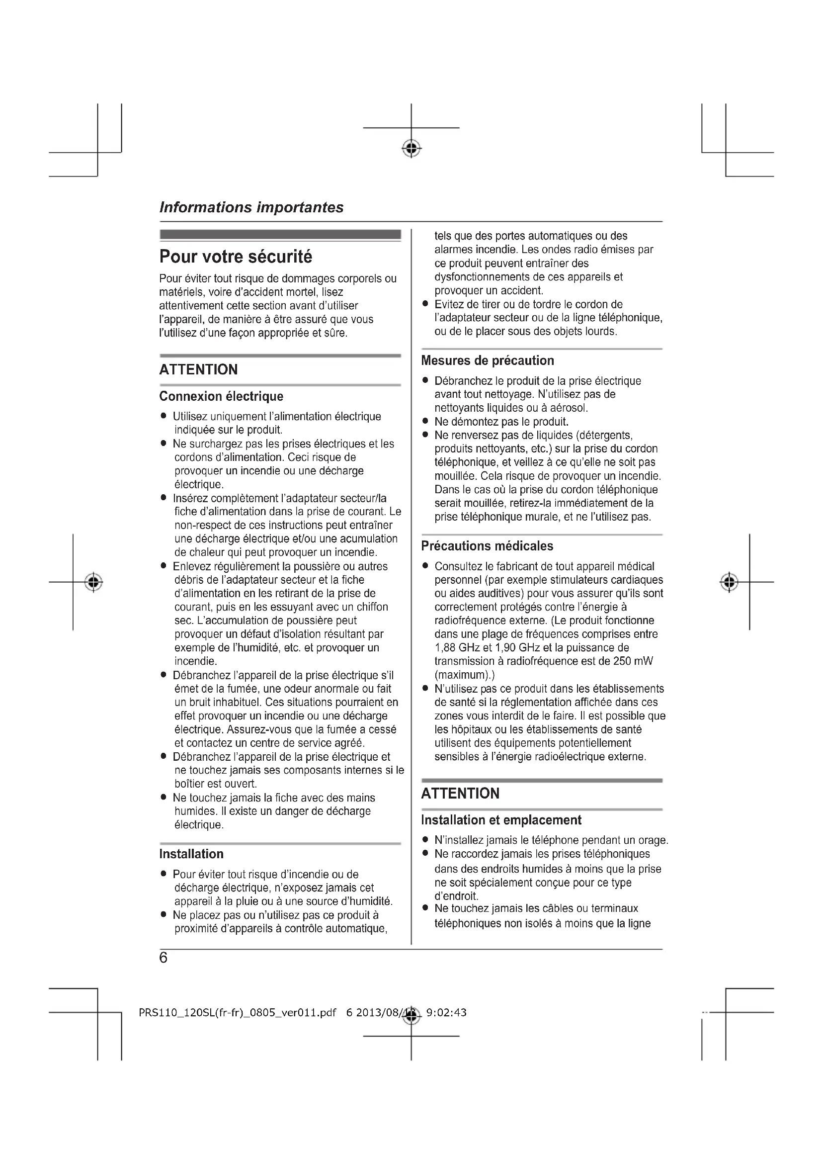 Introduction PRS110_120SL(fr-fr)_0805_ver011.pdf 5 2013/08/13 9:02:43Pour votre sécurité Pour éviter tout risque de dommages corporels ou matériels, voire d’accident mortel, lisez attentivement cette section avant d’utiliser l’appareil, de manière à être assuré que vous l’utilisez d’une façon appropriée et sûre. ATTENTION Connexion électrique R Utilisez uniquement l’alimentation électrique indiquée sur le produit. R Ne surchargez pas les prises électriques et les cordons d’alimentation. Ceci risque de provoquer un incendie ou une décharge électrique. R Insérez complètement l’adaptateur secteur/la fiche d’alimentation dans la prise de courant. Le non-respect de ces instructions peut entraîner une décharge électrique et/ou une ac cumulation de chaleur qui peut provoquer un incendie. R Enlevez régulièrement la poussière ou autres débris de l’adaptateur secteur et la fiche d’alimentation en les retirant de la prise de courant, puis en les essuyant avec un chiffon sec. L’accumulation de poussière peut provoquer un défaut d’isolation résultant par exemple de l’humidité, etc. et provoquer un incendie. R Débranchez l’appareil de la prise électrique s’il émet de la fumée, une odeur anormale ou fait un bruit inhabituel. Ces situations pourraient en effet provoquer un incendie ou une décharge électrique. Assurez-vous que la fumée a cessé et contactez un centre de service agréé. R Débranchez l’appareil de la prise électrique et ne touchez jamais ses composants internes si le boîtier est ouvert. R Ne touchez jamais la fiche avec des mains humides. Il existe un danger de décharge électrique. Installation R Pour éviter tout risque d’incendie ou de décharge électrique, n’exposez jamais cet appareil à la pluie ou à une source d’humidité. R Ne placez pas ou n’utilisez pas ce produit à proximité d’appareils à contrôle automatique, tels que des portes automatiques ou des alarmes incendie. Les ondes radio émises par ce produit peuvent entraîner des dysfonctionnements de ces appareils et provoquer un accident. R Evitez de tirer ou de tordre le cordon de l’adaptateur secteur ou de la ligne téléphonique, ou de le placer sous des objets lourds. Mesures de précaution R Débranchez le produit de la prise électrique avant tout nettoyage. N’utilisez pas de nettoyants liquides ou à aérosol. R Ne démontez pas le produit. R Ne renversez pas de liquides (détergents, produits nettoyants, etc.) sur la prise du cordon téléphonique, et veillez à ce qu’elle ne soit pas mouillée. Cela risque de provoquer un incendie. Dans le cas où la prise du cordon téléphonique serait mouillée, retirez-la immédiatement de la prise téléphonique murale, et ne l’utilisez pas. Précautions médicales R Consultez le fabricant de tout appareil médical personnel (par exemple stimulateurs cardiaques ou aides auditives) pour vous assurer qu’ils sont correctement protégés contre l’énergie à radiofréquence externe. (Le produit fonctionne dans une plage de fréquences comprises entre 1,88 GHz et 1,90 GHz et la puissance de transmission à radiofréquence est de 250 mW (maximum).) R N’utilisez p as ce produit dans les établissements de santé si la réglementation affichée dans ces zones vous interdit de le faire. Il est possible que les hôpitaux ou les établissements de santé utilisent des équipements potentiellement sensibles à l’énergie radioélectrique externe. ATTENTION Installation et emplacement R N’installez jamais le téléphone pendant un orage. R Ne raccordez jamais les prises téléphoniques dans des endroits humides à moins que la prise ne soit spécialement conçue pour ce type d’endroit. R Ne touchez jamais les câbles ou terminaux téléphoniques non isolés à moins que la ligne