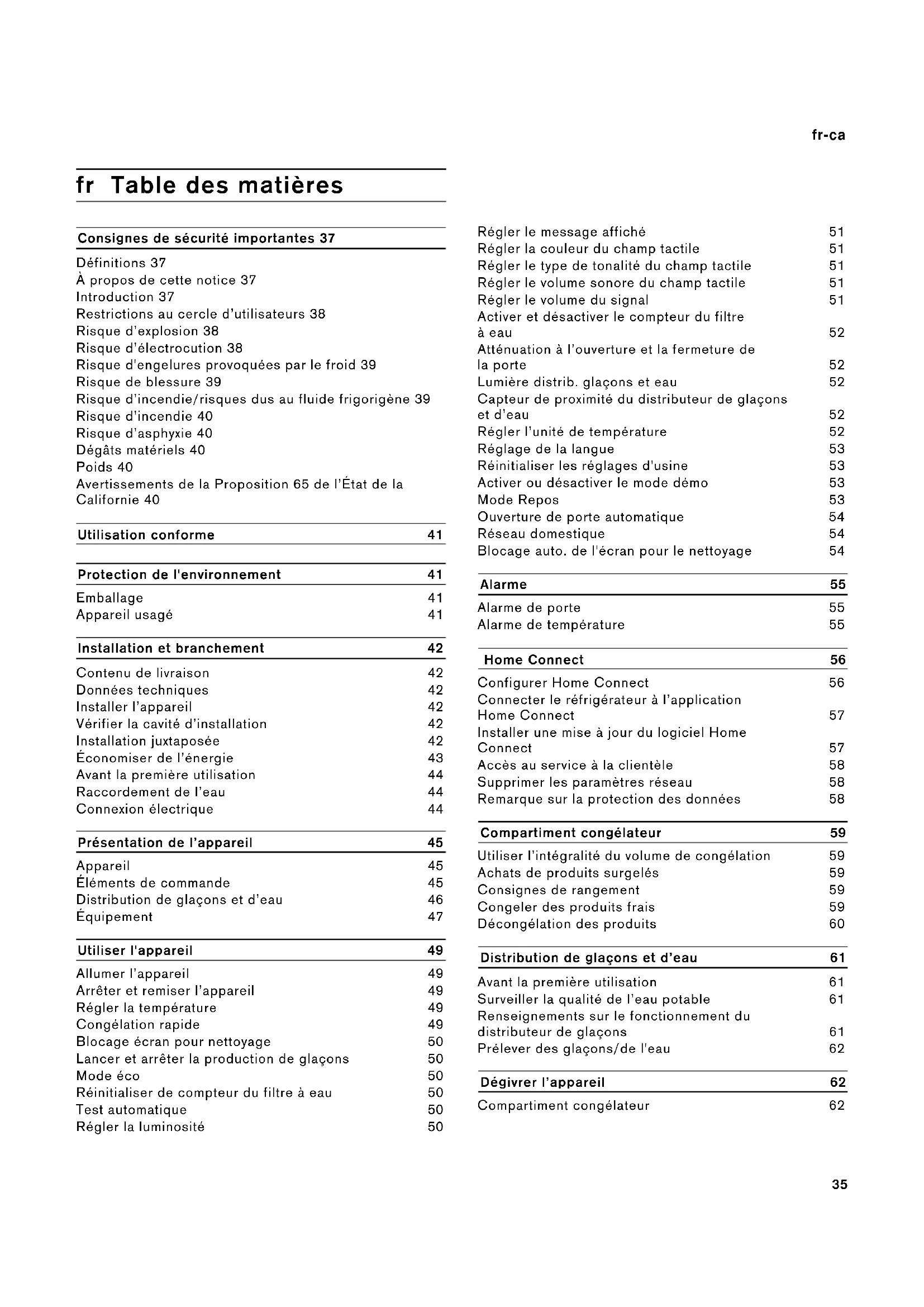 Risque d’incendie Les blocs multiprises ou blocs secteur portables peuvent surchauffer et provoquer un incendie. ▯ N’utilisez pas de blocs multiprises ni de blocs secteur portables derrière l’appareil. Risque d’asphyxie ▯ Appareils équipés d’une serrure : rangez la clé hors de portée des enfants. ▯ Ne confiez jamais l’emballage et ses pièces constitutives aux enfants. Dégâts matériels Pour éviter des dégâts matériels : ▯ Ne vous servez jamais du socle, des glissières ou des portes comme marchepieds et ne vous appuyez jamais dessus. ▯ Veillez à ce que les pièces en matière plastique et les joints de porte soient exempts d'huile et de graisse. ▯ Pour débrancher, ne saisissez que la fiche mâle, pas le cordon de branchement. Poids L’appareil est très lourd. Il faut être au moins 2 deux personnes pour installer et transporter l'appareil. ~ "Installation et branchement" à la page 42 Avertissements de la Proposition 65 de l’État de la Californie Ce produit pourrait contenir un produit chimique reconnu par l'État de la Californie comme cancérigène ou ayant des effets nocifs sur la reproduction. Par conséquent, l'emballage de votre produit pourrait porter l'étiquette suivante, comme requis par la Californie :41 Utilisation conforme fr-ca