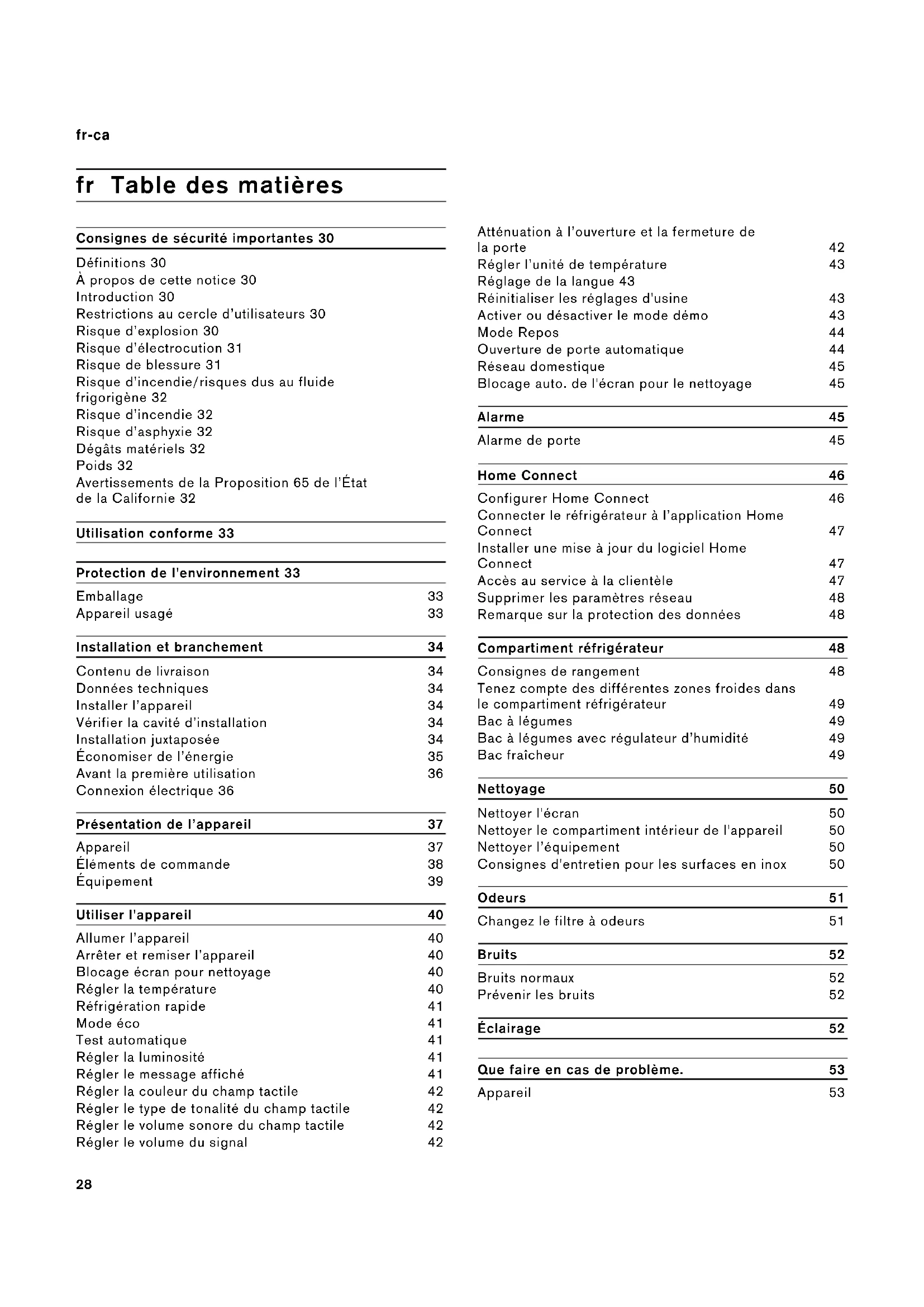 US 877 442 4436 toll-free28 fr-ca fr Table des matières fr Notice d'utilisation Consignes de sécurité importantes 30 Définitions 30 À propos de cette notice 30 Introduction 30 Restrictions au cercle d’utilisateurs 30 Risque d’explosion 30 Risque d’électrocution 31 Risque de blessure 31 Risque d’incendie/risques dus au fluide frigorigène 32 Risque d’incendie 32 Risque d’asphyxie 32 Dégâts matériels 32 Poids 32 Avertissements de la Proposition 65 de l’État de la Californie 32 Utilisation conforme 33 Protection de l'environnement 33 Emballage 33 Appareil usagé 33 Installation et branchement 34 Contenu de livraison 34 Données techniques 34 Installer l’appareil 34 Vérifier la cavité d’installation 34 Installation juxtaposée 34 Économiser de l’énergie 35 Avant la première utilisation 36 Connexion électrique 36 Présentation de l’appareil 37 Appareil 37 Éléments de commande 38 Équipement 39 Utiliser l'appareil 40 Allumer l’appareil 40 Arrêter et remiser l’appareil 40 Blocage écran pour nettoyage 40 Régler la température 40 Réfrigération rapide 41 Mode éco 41 Test automatique 41 Régler la luminosité 41 Régler le message affiché 41 Régler la couleur du champ tactile 42 Régler le type de tonalité du champ tactile 42 Régler le volume sonore du champ tactile 42 Régler le volume du signal 42 Atténuation à l’ouverture et la fermeture de la porte 42 Régler l’unité de température 43 Réglage de la langue 43 Réinitialiser les réglages d'usine 43 Activer ou désactiver le mode démo 43 Mode Repos 44 Ouverture de porte automatique 44 Réseau domestique 45 Blocage auto. de l'écran pour le nettoyage 45 Alarme 45 Alarme de porte 45 Home Connect 46 Configurer Home Connect 46 Connecter le réfrigérateur à l’application Home Connect 47 Installer une mise à jour du logiciel Home Connect 47 Accès au service à la clientèle 47 Supprimer les paramètres réseau 48 Remarque sur la protection des données 48 Compartiment réfrigérateur 48 Consignes de rangement 48 Tenez compte des différentes zones froides dans le compartiment réfrigérateur 49 Bac à légumes 49 Bac à légumes avec régulateur d’humidité 49 Bac fraîcheur 49 Nettoyage 50 Nettoyer l'écran 50 Nettoyer le compartiment intérieur de l'appareil 50 Nettoyer l’équipement 50 Consignes d'entretien pour les surfaces en inox 50 Odeurs 51 Changez le filtre à odeurs 51 Bruits 52 Bruits normaux 52 Prévenir les bruits 52 Éclairage 52 Que faire en cas de problème. 53 Appareil 5329 fr-ca Service à la clientèle 54 Autodiagnostic de l’appareil 54 Commande de réparation et conseils en cas de problèmes 549 Consignes de sécurité importantes VEUILLEZ LIRE ET CONSERVER CES CONSIGNES!