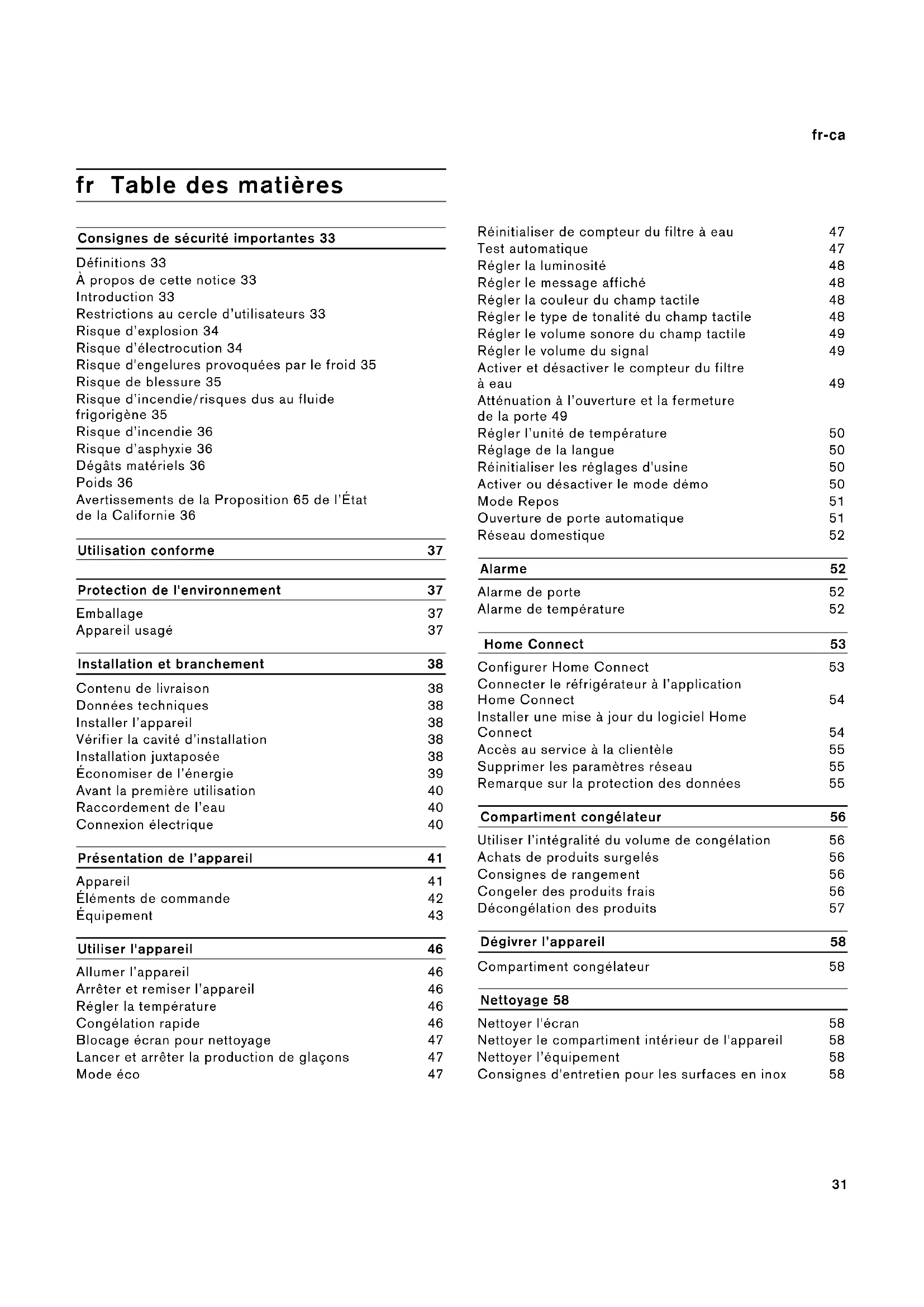 Risque d’incendie Les blocs multiprises ou blocs secteur portables peuvent surchauffer et provoquer un incendie. ▯ N’utilisez pas de blocs multiprises ni de blocs secteur portables derrière l’appareil. Risque d’asphyxie ▯ Appareils équipés d’une serrure : rangez la clé hors de portée des enfants. ▯ Ne confiez jamais l’emballage et ses pièces constitutives aux enfants. Dégâts matériels Pour éviter des dégâts matériels : ▯ Ne vous servez jamais du socle, des glissières ou des portes comme marchepieds et ne vous appuyez jamais dessus. ▯ Veillez à ce que les pièces en matière plastique et les joints de porte soient exempts d'huile et de graisse. ▯ Pour débrancher, ne saisissez que la fiche mâle, pas le cordon de branchement. Poids L’appareil est très lourd. Il faut être au moins 2 deux personnes pour installer et transporter l'appareil. ~ "Installation et branchement" à la page 38 Avertissements de la Proposition 65 de l’État de la Californie Ce produit pourrait contenir un produit chimique reconnu par l'État de la Californie comme cancérigène ou ayant des effets nocifs sur la reproduction. Par conséquent, l'emballage de votre produit pourrait porter l'étiquette suivante, comme requis par la Californie :37 Utilisation conforme fr-ca