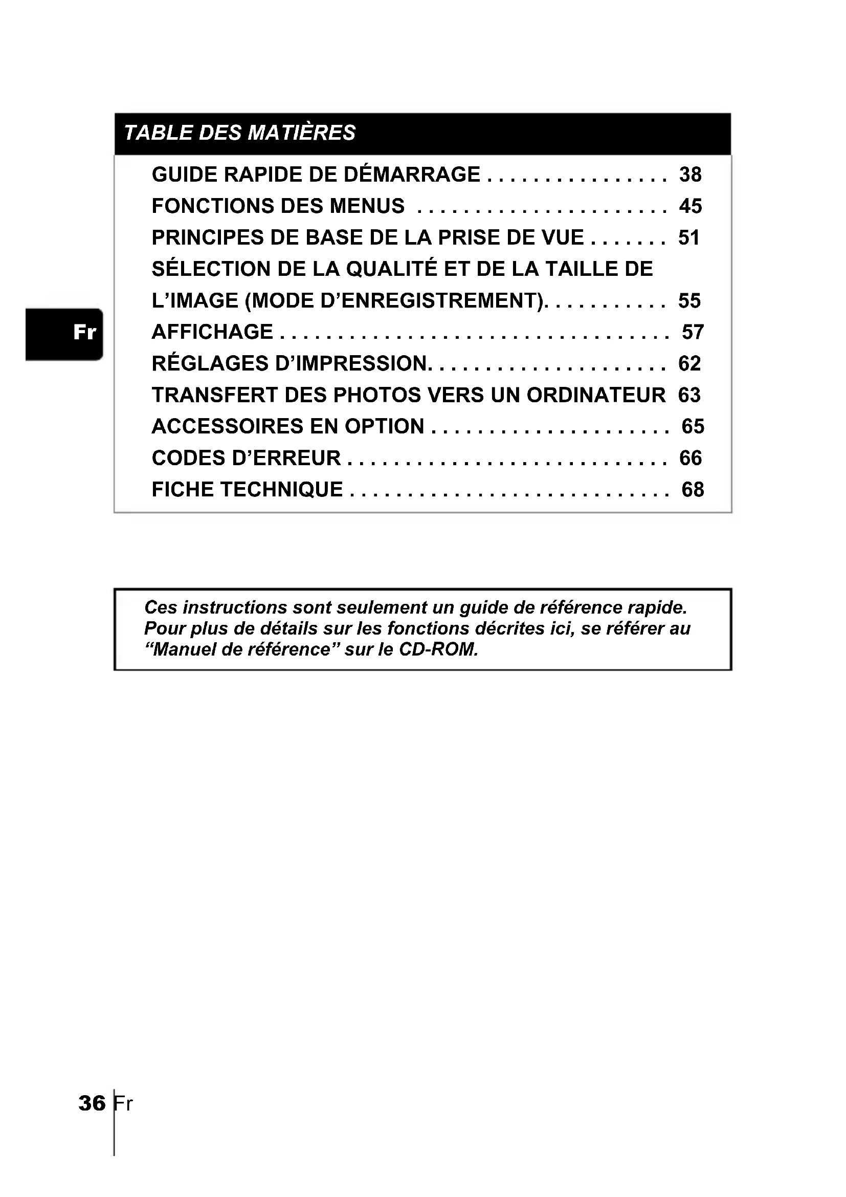 FICHE TECHNIQUE . . . . . . . . . . . . . . . . . . . . . . . . . . . . 68 Ces instructions sont seulement un guide de référence rapide. Pour plus de détails sur les fonctions décrites ici, se référer au “Manuel de référence” sur le CD-ROM. basic_f.fm Page 36 Thursday, February 7, 2002 2:10 PMFr 37