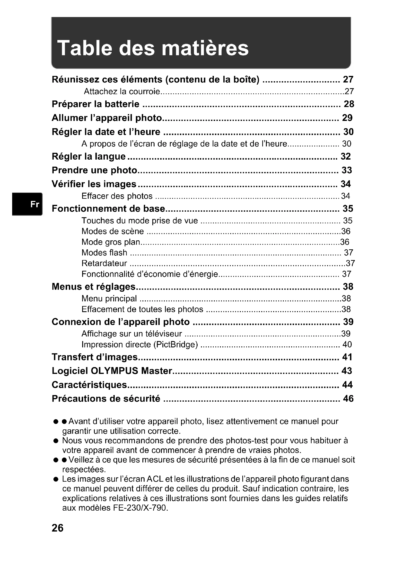 - Précautions de sécurité Avant d’utiliser votre appareil photo, lisez attentivement ce manuel pour garantir une utilisation correcte. Nous vous recommandons de prendre des photos-test pour vous habituer à votre appareil avant de commencer à prendre de vraies photos. Veillez à ce que les mesures de sécurité présentées à la fin de ce manuel soit respectées. Les images sur l’écran ACL et les illustrations de l’appareil photo figurant dans ce manuel peuvent différer de celles du produit. Sauf indication contraire, les explications relatives à ces illustrations sont fournies dans les guides relatifs aux modèles FE-230/X-790. d4336_33_f_basic_00_bookfile.book Page 26 Tuesday, November 14, 2006 4:02 PM27 p. 46