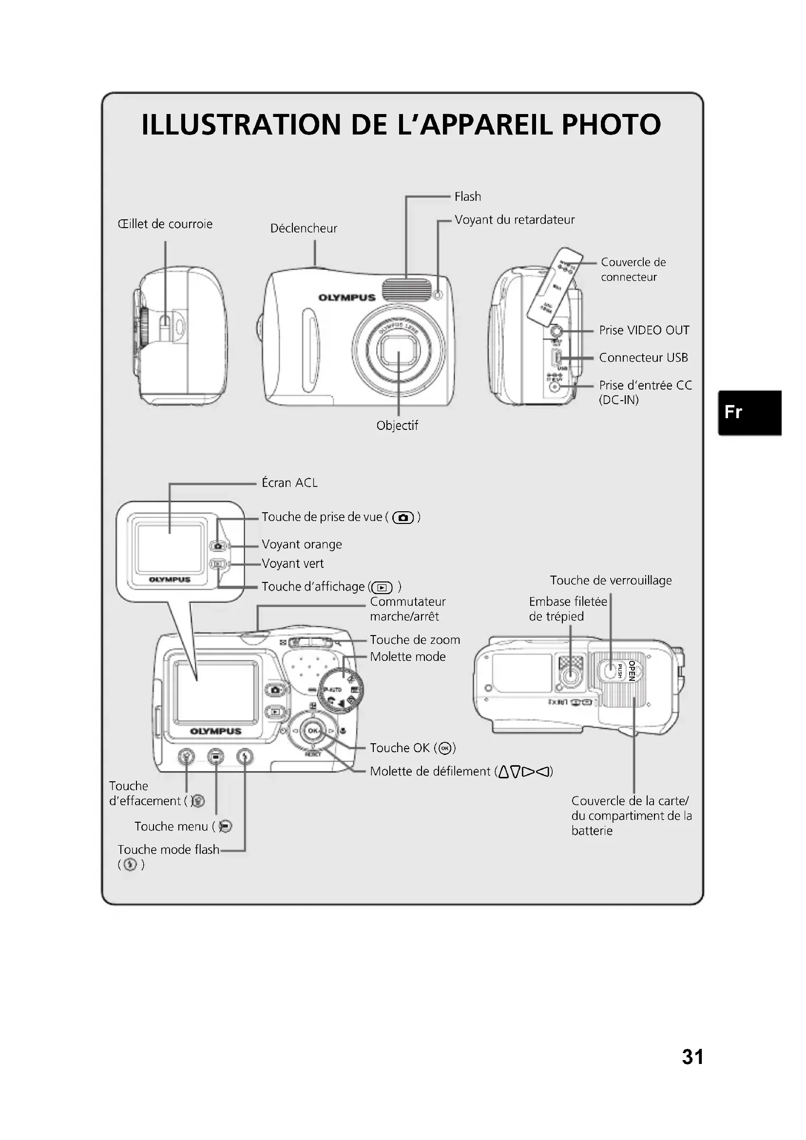 Avant d’utiliser l’appareil photo, lisez attentivement ce manuel afin de garantir un fonctionnement correct de l’appareil photo. Nous vous recommandons de prendre des photos-test pour vous habituer à votre appareil avant de commencer à prendre de vraies photos. Veuillez respecter les précautions de sécurité détaillées à la fin du présent manuel. Il est possible que les représentations de l’écran ACL et que les illustrations de l’appareil photo utilisées dans ce manuel ne correspondent pas au produit réel. L’ensemble des images utilisées dans le présent manuel est basé sur le modèle FE-110/X-705. Table des matières d4304_fr_basic_US.book Page 30 Thursday, July 28, 2005 5:10 PM31
