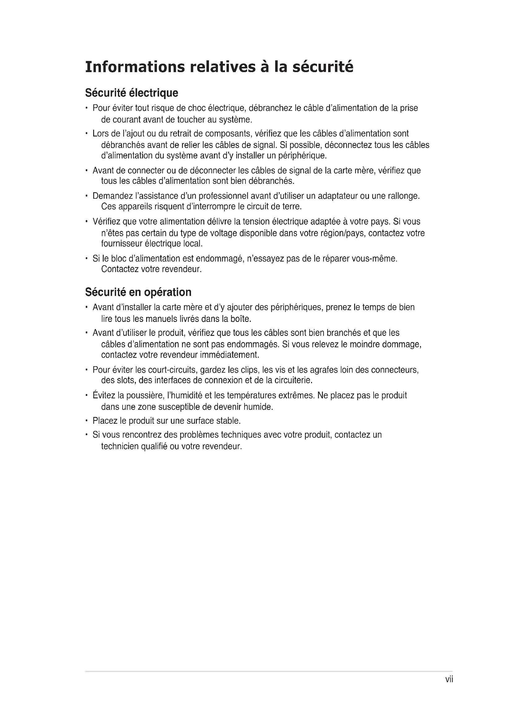 - Lors de l’ajout ou du retrait de composants, vériez que les câbles d’alimentation sont débranchés avant de relier les câbles de signal. Si possible, déconnectez tous les câbles d’alimentation du système avant d’y installer un périphérique.