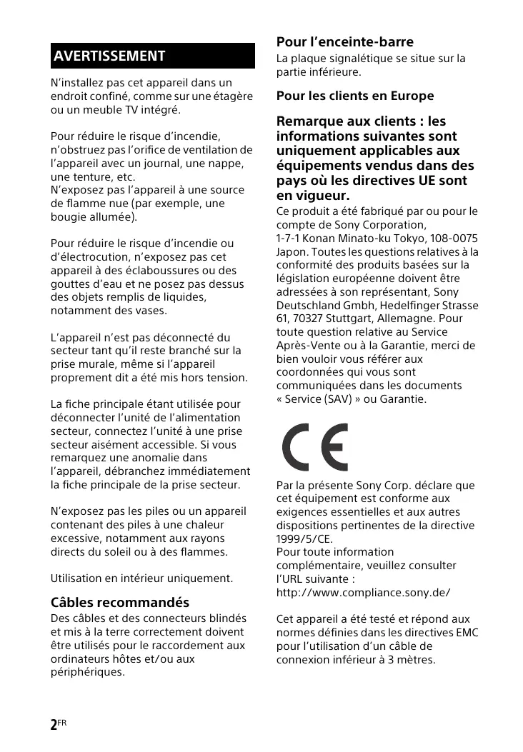 équipements vendus dans des pays où les directives UE sont en vigueur. Ce produit a été fabriqué par ou pour le compte de Sony Corporation, 1-7-1 Konan Minato-ku Tokyo, 108-0075 Japon. Toutes les questions relatives à la conformité des produits basées sur la législation européenne doivent être adressées à son représentant, Sony Deutschland Gmbh, Hedelfinger Strasse 61, 70327 Stuttgart, Allemagne. Pour toute question relative au Service Après-Vente ou à la Garantie, merci de bien vouloir vous référer aux coordonnées qui vous sont communiquées dans les documents « Service (SAV) » ou Garantie.