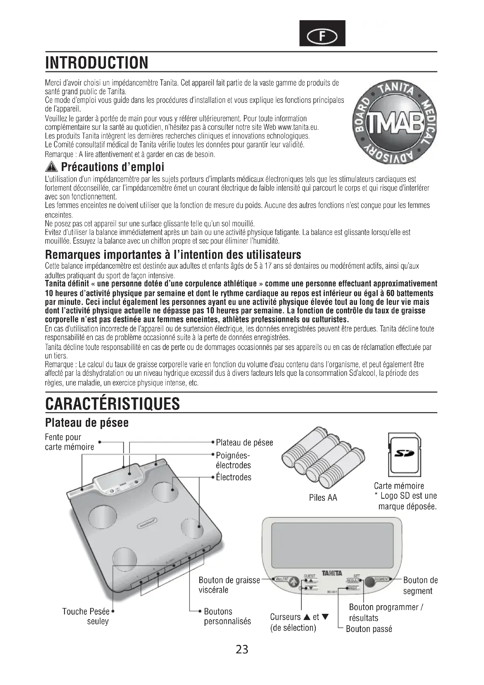 - Beim Messen wird angezeigt. Messungen lassen sich nur unter der maximalen Wiegekapazität durchführen. Spezifikation BC-601 Höchstgewicht 150kg (330lb) (23st 8lb) Teilung 0.1kg (0.2lb) (0.2lb) Teilung der Körperfettanzeige 0.1% Persönliche Daten 4 Speicherplätze Stromversorgung 4 Mignonbatterien (enthalten) Stromverbrauch Maximal 150 mA Messstrom 50 kHz, 100 μA FEHLERSUCHE Batterien dürfen nicht in den Hausmüll! Als Verbraucher sind Sie gesetzlich verpflichtet, gebrauchte oder ausge- laufene. Batterien zurückzugeben. Sie können Ihre alten Batterien bei den öffentlichen. Sammelstellen in Ihrer Stadt oder überall dort abgeben, wo Batterien der betreffenden Art verkauft werden und speziell gekennzeich- nete Sammelbehälter aufgestellt sind. Bei Verschrottung des Gerätes sind die Batterien zu entnehmen und müssen ebenfalls bei Sammelstellen abgegebenwerden. Hinweis: Diese Zeichen finden Sie auf schadstoffhaltigen Batterien: Pb Pb = Batterie enthält Blei, Cd Cd = Batterie enthält Cadmium, Hg Hg = Batterie enthält Quecksilber. Dieses Gerät ist funkentstört entsprechend der geltenden EG- Richtlinie 2004/108/EC.23 Merci d’avoir choisi un impédancemètre Tanita. Cet appareil fait partie de la vaste gamme de produits de santé grand public de Tanita. Ce mode d’emploi vous guide dans les procédures d’installation et vous explique les fonctions principales de l’appareil. Veuillez le garder à portée de main pour vous y référer ultérieurement. Pour toute information complémentaire sur la santé au quotidien, n’hésitez pas à consulter notre site Web www.tanita.eu. Les produits Tanita intègrent les dernières recherches cliniques et innovations echnologiques. Le Comité consultatif médical de Tanita vérifie toutes les données pour garantir leur validité. Remarque : A lire attentivement et à garder en cas de besoin. Précautions d’emploi L’utilisation d’un impédancemètre par les sujets porteurs d’implants médicaux électroniques tels que les stimulateurs cardiaques est fortement déconseillée, car l’impédancemètre émet un courant électrique de faible intensité qui parcourt le corps et qui risque d’interférer avec son fonctionnement. Les femmes enceintes ne doivent utiliser que la fonction de mesure du poids. Aucune des autres fonctions n’est conçue pour les femmes enceintes. Ne posez pas cet appareil sur une surface glissante telle qu’un sol mouillé. Evitez d’utiliser la balance immédiatement après un bain ou une activité physique fatigante. La balance est glissante lorsqu’elle est mouillée. Essuyez la balance avec un chiffon propre et sec pour éliminer l’humidité. Remarques importantes à l’intention des utilisateurs Cette balance impédancemètre est destinée aux adultes et enfants âgés de 5 à 17 ans sé dentaires ou modérément actifs, ainsi qu’aux adultes pratiquant du sport de façon intensive. Tanita définit « une personne dotée d’une corpulence athlétique » comme une personne effectuant approximativement 10 heures d’activité physique par semaine et dont le rythme cardiaque au repos est inférieur ou égal à 60 battements par minute. Ceci inclut également les personnes ayant eu une activité physique élevée tout au long de leur vie mais dont l’activité physique actuelle ne dépasse pas 10 heures par semaine. La fonction de contrôle du taux de graisse corporelle n’est pas destinée aux femmes enceintes, athlètes professionnels ou culturistes. En cas d’utilisation incorrecte de l’appareil ou de surtension électrique, les données enregistrées peuvent être perdues. Tanita décline toute responsabilité en cas de problème occasionné suite à la perte de données enregistrées. Tanita décline toute responsabilité en cas de perte ou de dommages occasionnés par ses appareils ou en cas de réclamation effectuée par un tiers. Remarque : Le calcul du taux de graisse corporelle varie en fonction du volume d’eau contenu dans l’organisme, et peut également être affecté par la déshydratation ou un niveau hydrique excessif dus à divers facteurs tels que la consommation Sd’alcool, la période des règles, une maladie, un exercice physique intense, etc. INTRODUCTION CARACTÉRISTIQUES Plateau de pésee Plateau de pésee Électrodes Boutons personnalisés Touche Pesée seuley Piles AA Carte mémoire