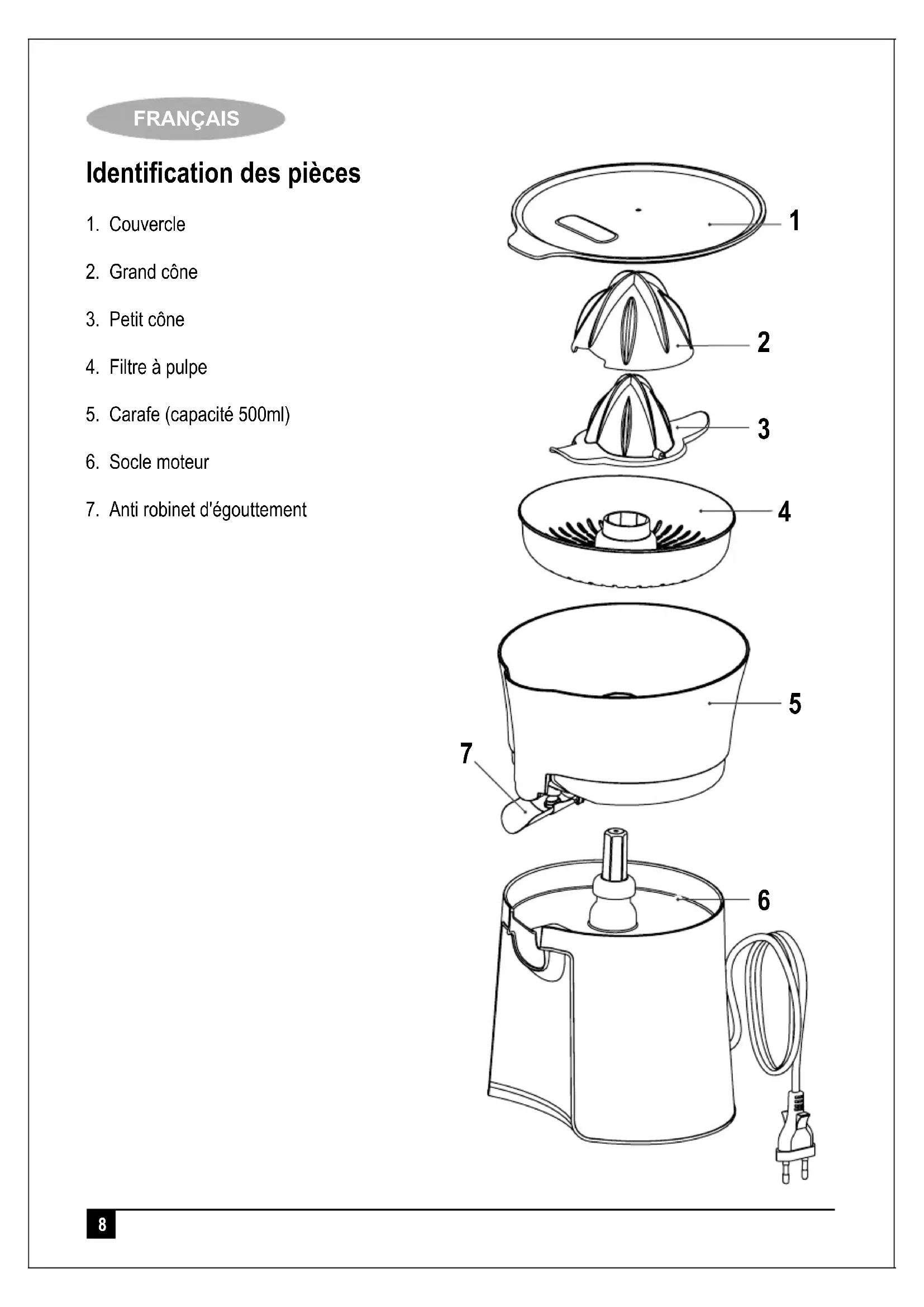 - Si l’appareil est de classe I (mis à la terre), connectez le fil vert/jaune sur la borne terre. Remarque: Si votre appareil est de classe II double isolation (seulement 2 fils dans le cordon), aucune connexion n’est à faire sur la borne terre. Suivez les instructions de montage fournies avec les fiches de bonne qualité. Tout fusible remplacé doit être du même calibre que le fusible d’origine fourni avec l’appareil. Avertissement! La section ci-dessus sur le remplacement de la fiche concerne le personnel des centres de service agréés.11 FRANÇAIS Instructions de sécurité supplémentaires pour les presse-agrumes