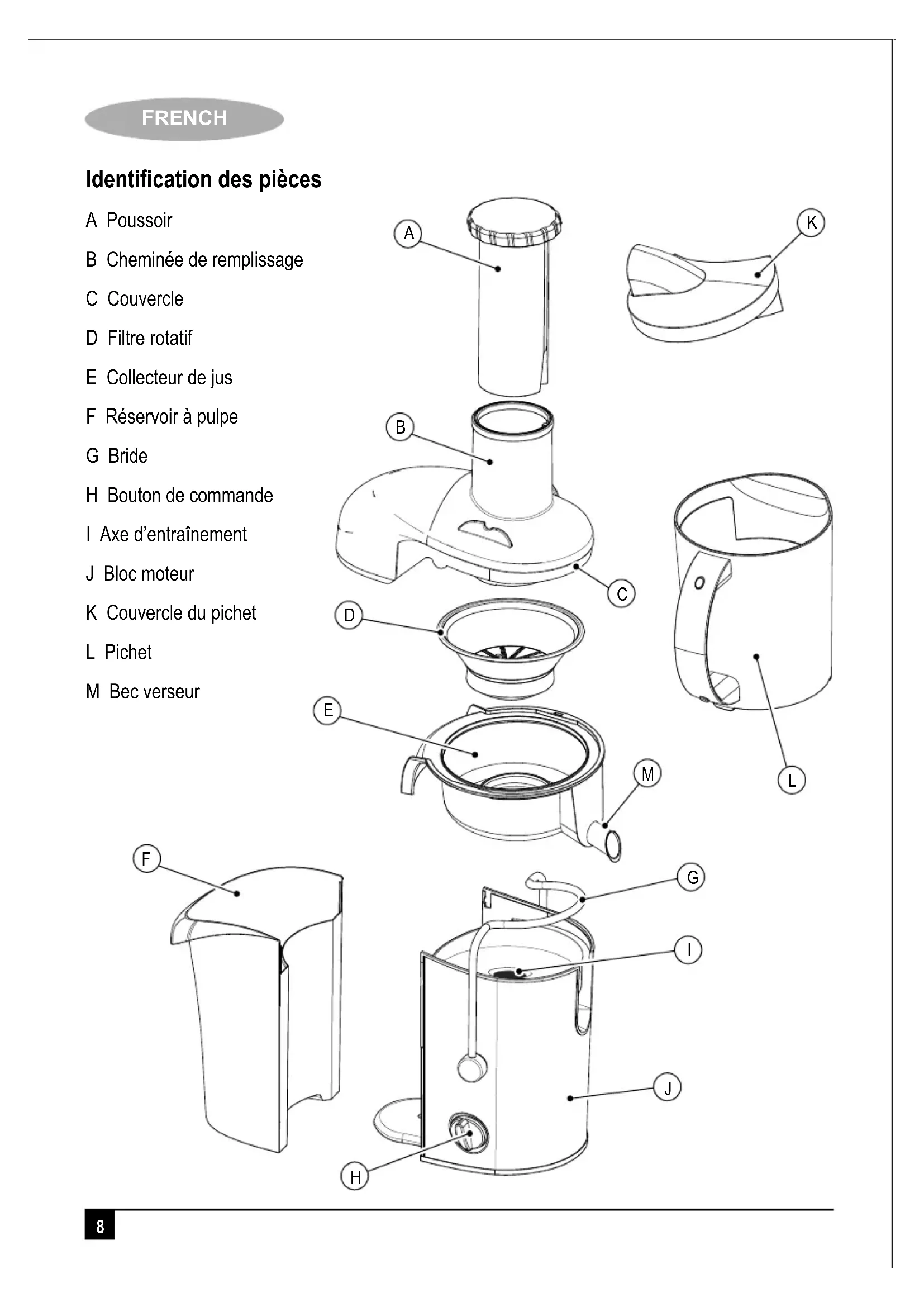 Identification des pièces A Poussoir B Cheminée de remplissage C Couvercle D Filtre rotatif E Collecteur de jus F Réservoir à pulpe G Bride H Bouton de commande I Axe d’entraînement J Bloc moteur K Couvercle du pichet L Pichet M Bec verseur9 FRENCH Utilisation prévue Votre centrifugeuse Black & Decker a été conçue pour extraire le jus des fruits et des légumes. Cet appareil est destiné à un usage domestique uniquement. Lisez ce manuel attentivement avant d’utiliser l’appareil. Consignes de sécurité