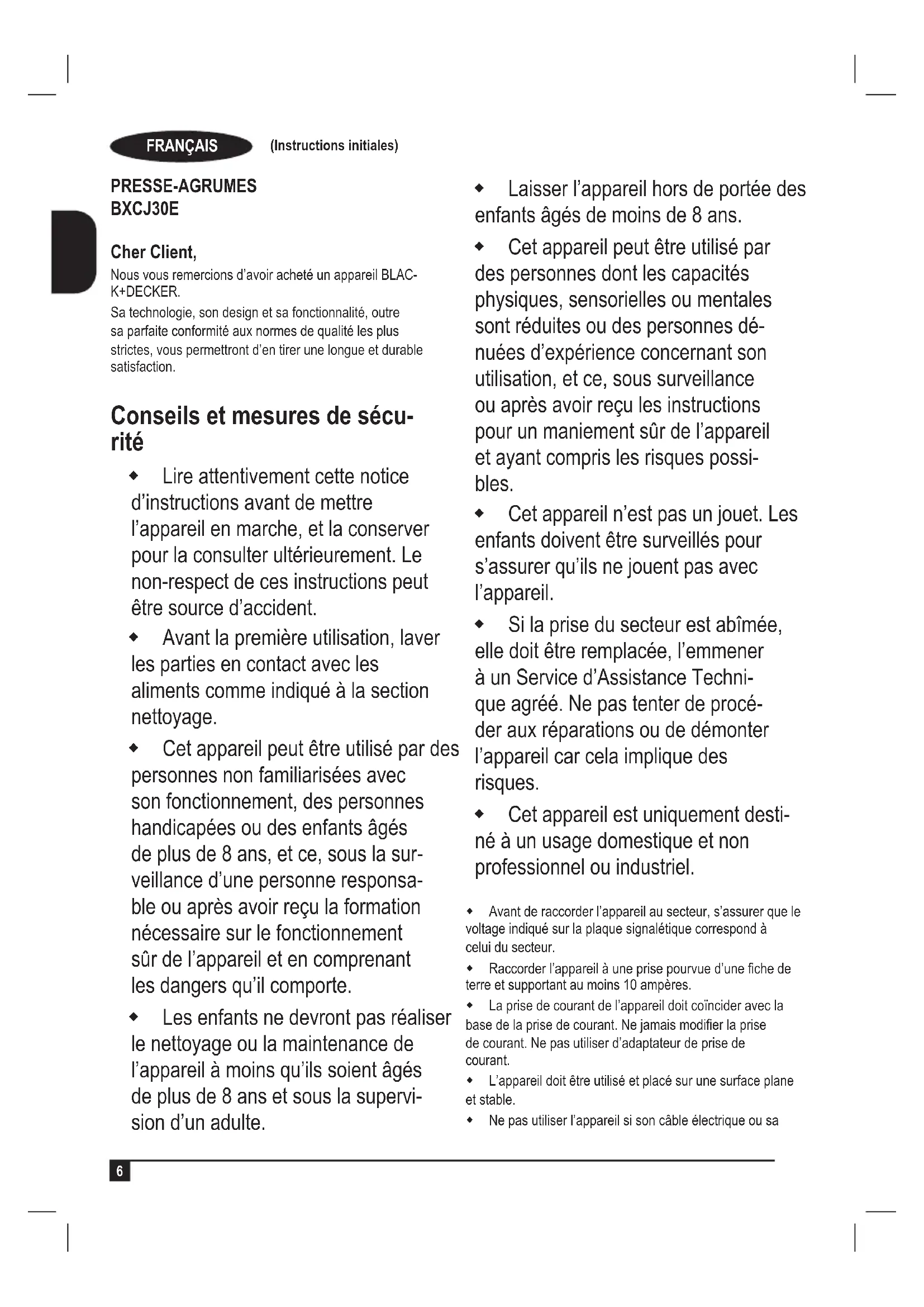 PRESSE-AGRUMES BXCJ30E Cher Client, Nous vous remercions d’avoir acheté un appareil BLAC- K+DECKER. Sa technologie, son design et sa fonctionnalité, outre sa parfaite conformité aux normes de qualité les plus strictes, vous permettront d’en tirer une longue et durable satisfaction. Conseils et mesures de sécu- rité Lire attentivement cette notice d’instructions avant de mettre l’appareil en marche, et la conserver pour la consulter ultérieurement. Le non-respect de ces instructions peut être source d’accident. Avant la première utilisation, laver les parties en contact avec les aliments comme indiqué à la section nettoyage. Cet appareil peut être utilisé par des personnes non familiarisées avec son fonctionnement, des personnes handicapées ou des enfants âgés de plus de 8 ans, et ce, sous la sur- veillance d’une personne responsa- ble ou après avoir reçu la formation nécessaire sur le fonctionnement sûr de l’appareil et en comprenant les dangers qu’il comporte. Les enfants ne devront pas réaliser le nettoyage ou la maintenance de l’appareil à moins qu’ils soient âgés de plus de 8 ans et sous la supervi- sion d’un adulte. Laisser l’appareil hors de portée des enfants âgés de moins de 8 ans. Cet appareil peut être utilisé par des personnes dont les capacités physiques, sensorielles ou mentales sont réduites ou des personnes dé- nuées d’expérience concernant son utilisation, et ce, sous surveillance ou après avoir reçu les instructions pour un maniement sûr de l’appareil et ayant compris les risques possi- bles. Cet appareil n’est pas un jouet. Les enfants doivent être surveillés pour s’assurer qu’ils ne jouent pas avec l’appareil. Si la prise du secteur est abîmée, elle doit être remplacée, l’emmener à un Service d’Assistance Techni- que agréé. Ne pas tenter de procé- der aux réparations ou de démonter l’appareil car cela implique des risques. Cet appareil est uniquement desti- né à un usage domestique et non professionnel ou industriel. Avant de raccorder l’appareil au secteur, s’assurer que le voltage indiqué sur la plaque signalétique correspond à celui du secteur. Raccorder l’appareil à une prise pourvue d’une che de terre et supportant au moins 10 ampères. La prise de courant de l’appareil doit coïncider avec la base de la prise de courant. Ne jamais modier la prise de courant. Ne pas utiliser d’adaptateur de prise de courant. L’appareil doit être utilisé et placé sur une surface plane et stable. Ne pas utiliser l’appareil si son câble électrique ou saFRANÇAIS (Instructions initiales)