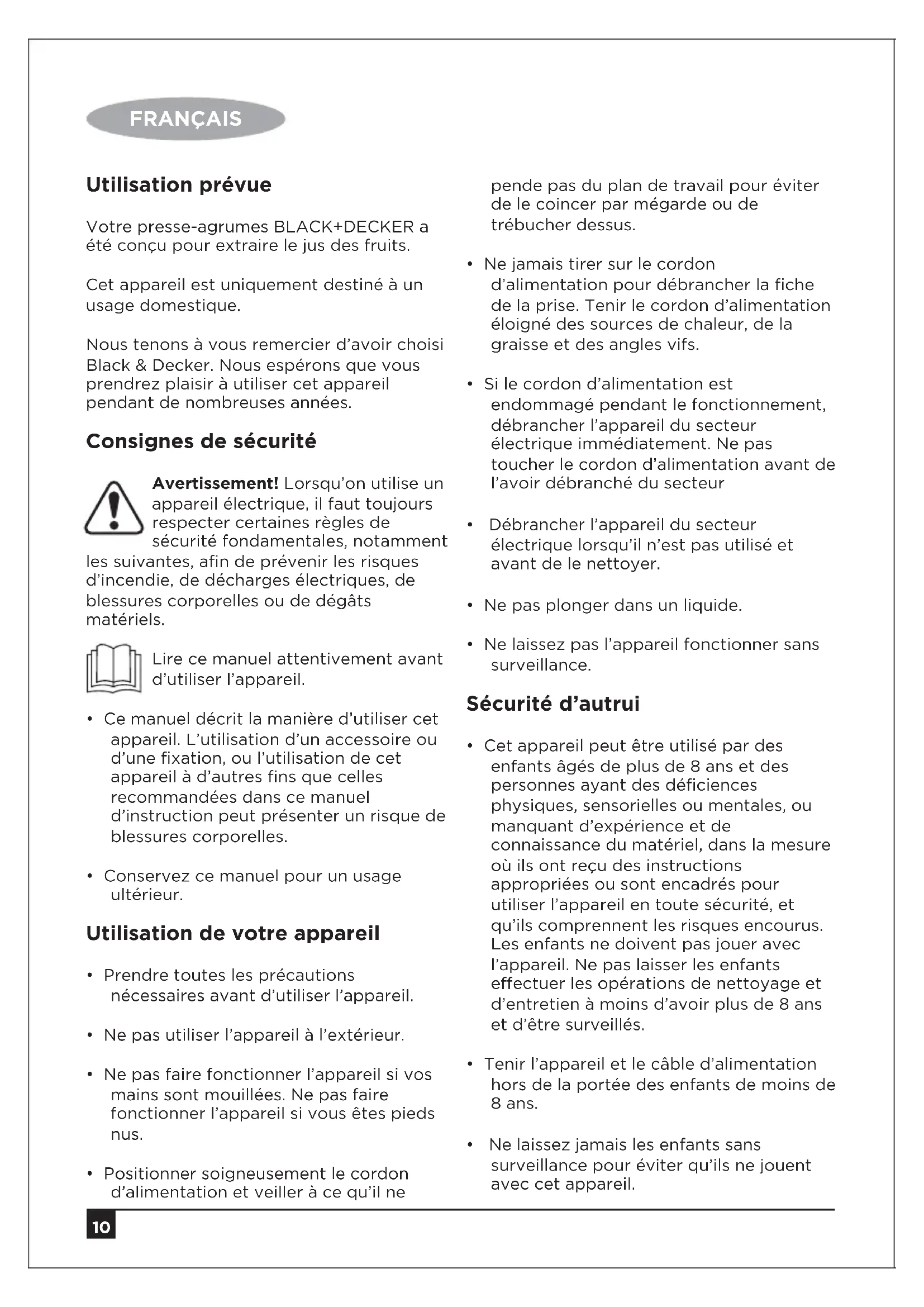 FRANÇAIS A B C D E F10 FRANÇAIS Utilisation prévue Votre presse-agrumes BLACK+DECKER a été conçu pour extraire le jus des fruits. Cet appareil est uniquement destiné à un usage domestique. Nous tenons à vous remercier d’avoir choisi Black & Decker. Nous espérons que vous prendrez plaisir à utiliser cet appareil pendant de nombreuses années. Consignes de sécurité Avertissement! Lorsqu’on utilise un appareil électrique, il faut toujours respecter certaines règles de sécurité fondamentales, notamment les suivantes, afin de prévenir les risques d’incendie, de décharges électriques, de blessures corporelles ou de dégâts matériels. Lire ce manuel attentivement avant d’utiliser l’appareil.