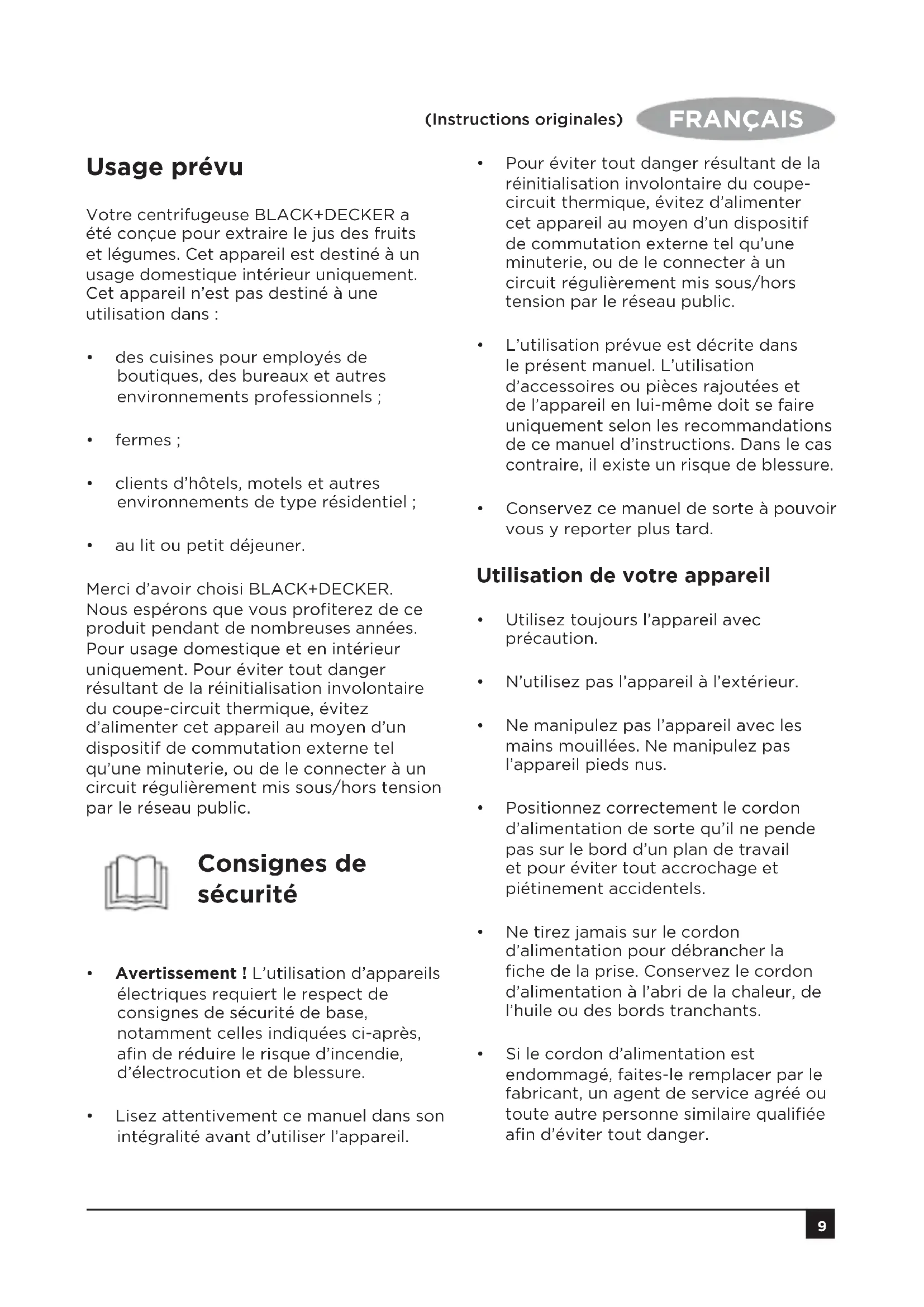 Usage prévu Votre centrifugeuse BLACK+DECKER a été conçue pour extraire le jus des fruits et légumes. Cet appareil est destiné à un usage domestique intérieur uniquement. Cet appareil n’est pas destiné à une utilisation dans: