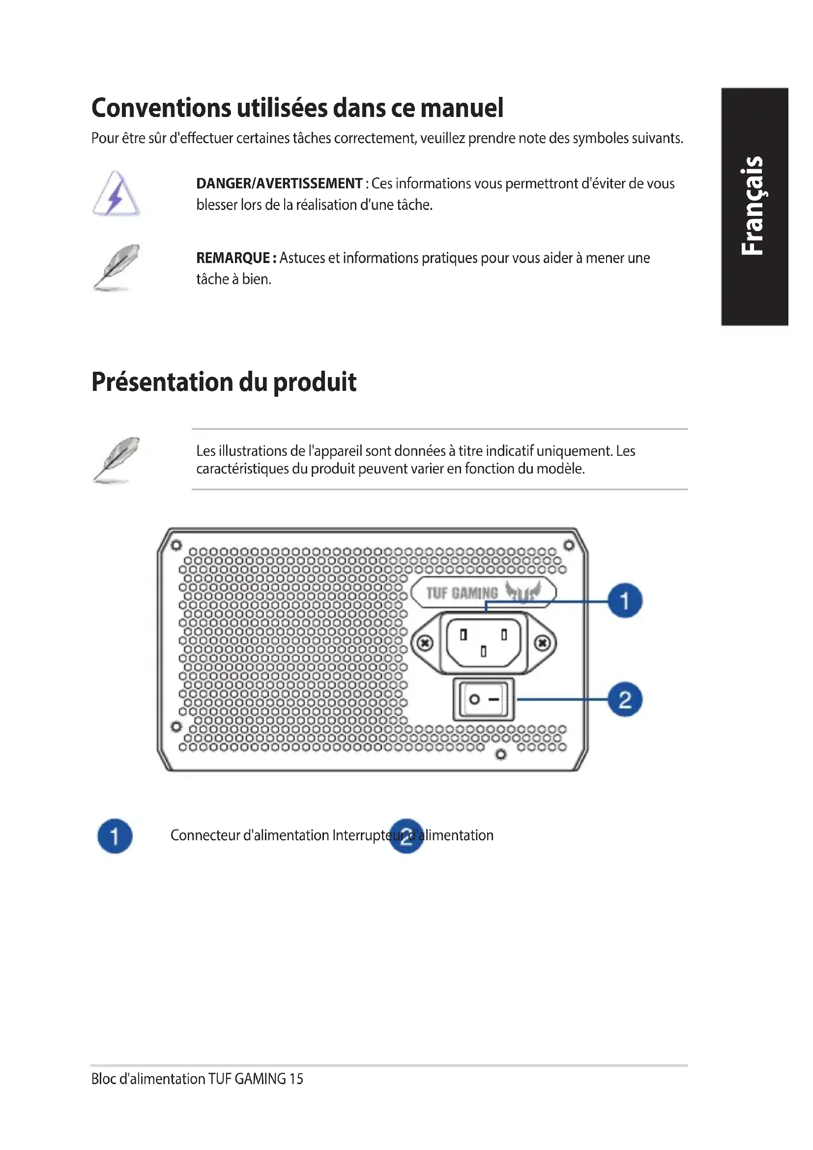 d'alimentation sous tension. Installation de votre bloc d'alimentation TUF GAMINGBloc d'alimentation TUF GAMING 17 Français Consignes de sécurité Étiquettes d'avertissement