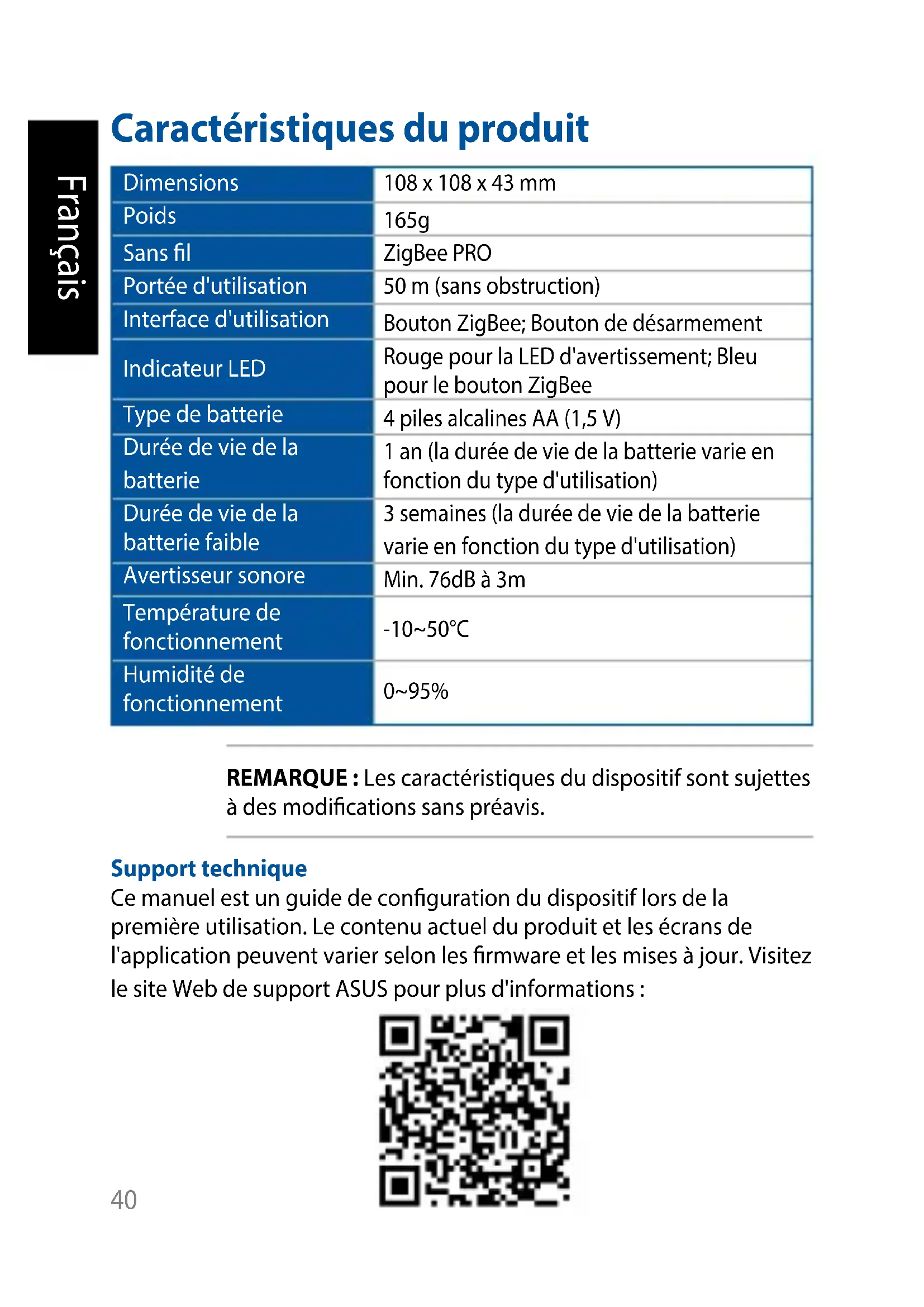 ItalianoCaractéristiques du produit Dimensions 108 x 108 x 43 mm Poids 165g Sans l ZigBee PRO Portée d'utilisation 50 m (sans obstruction) Interface d'utilisation Bouton ZigBee; Bouton de désarmement Indicateur LED Rouge pour la LED d'avertissement; Bleu pour le bouton ZigBee Type de batterie 4 piles alcalines AA (1,5 V) Durée de vie de la batterie 1 an (la durée de vie de la batterie varie en fonction du type d'utilisation) Durée de vie de la batterie faible 3 semaines (la durée de vie de la batterie varie en fonction du type d'utilisation) Avertisseur sonore Min. 76dB à 3m Température de fonctionnement -10~50°C Humidité de fonctionnement 0~95% REMARQUE : Les caractéristiques du dispositif sont sujettes à des modications sans préavis. Support technique Ce manuel est un guide de conguration du dispositif lors de la première utilisation. Le contenu actuel du produit et les écrans de l'application peuvent varier selon les rmware et les mises à jour. Visitez le site Web de support ASUS pour plus d'informations :