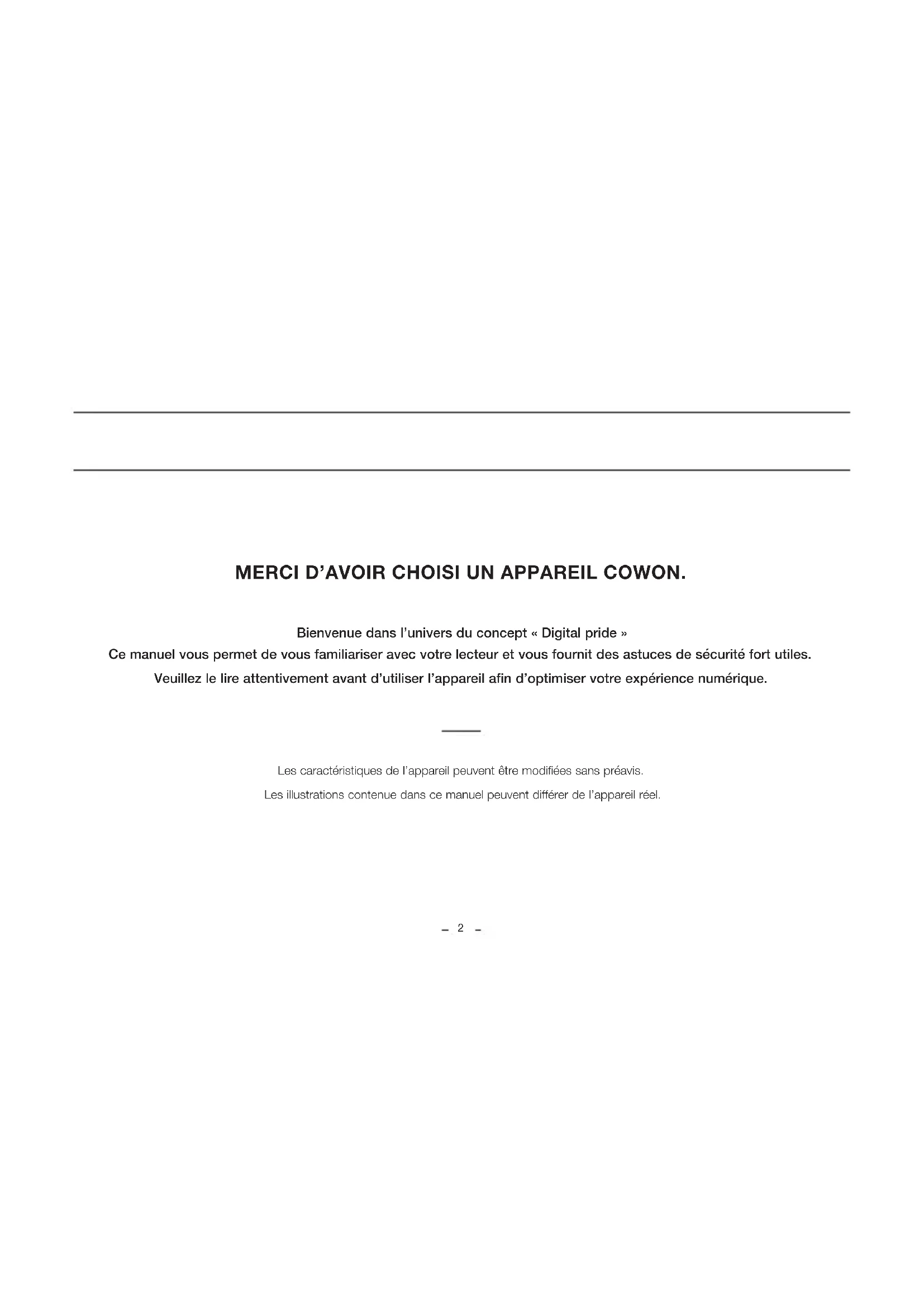 PC CONNECT PWR BUTTON SIDE BUTTON BODY (좌측면엔 특징 없음) et maintenez-les enfoncés pendant 6 secondes minimum pour réinitialiser l’appareil. + Je n’entends aucun son. Assurez-vous que le volume n’est pas réglé sur “0”. Assurez-vous que le lecteur contient un fichier. Si le lecteur ne contient pas de fichier, vous n’entendrez aucun son. Veuillez noter que des fichiers corrompus produisent une lecture bruyante et irrégulière. Assurez-vous que les écouteurs sont correctement branchés. Des impuretés dans la prise d’écouteurs peuvent causer du bruit. + Les fichiers que j’ai mémorisés ne figurent pas dans la liste. Chaque mode affiche une liste des fichiers lisibles uniquement. Pour visualiser tous les fichiers que vous avez mémorisés, sélectionnez le mode Navigateur. Veuillez noter que le dossier System n’apparaîtra pas dans le Navigateur. DÉPANNAGE + L’ordinateur ne reconnaît pas le lecteur lorsqu’il est raccordé. Si la connexion est instable en raison de fréquentes coupures, connecter l’appareil directement au port USB sur le tableau principal du PC. + La capacité de mémoire du lecteur est différente ou plus petite que la capacité spécifiée. La capacité de mémoire indiquée par Windows peut différer de la capacité indiquée par le fabricant de la mémoire. La capacité réelle sera être réduite par rapport à la capacité initiale car un certain espace de la mémoire devrait être utilisée pour le système pour le fonctionnement normal. + Le lecteur ne lit pas correctement lorsque la mémoire est pleine. Une partie de la mémoire de l’appareil est utilisée pour les paramètres et la mémoire vive. Si les fichiers sont sauvegardés dans cet espace, l’appareil peut ne pas fonctionner correctement. Il est donc conseillé de laisser au minimum 100 Mo de mémoire libre lors de l’utilisation de l’appareil. + Après formatage de l’appareil sur mon PC, il ne peut plus être lu par mon PC, la mémoire est réduite ou la vitesse de transfert des fichiers est ralentie. La mémoire intégrée de l’appareil a été préformatée et ne nécessite pas de formatage supplémentaire. Cependant, s’il est nécessaire de formater l’appareil, utilisez la fonction de formatage de la mémoire interne incluse dans l’appareil ; si vous choisissez de formater l’appareil en le connectant à un PC par le biais d’un câble USB, utilisez un utilitaire qui prend en charge le formatage FAT32 grande capacité et définissez la taille d’allocation par défaut sur 32 ko, ou utilisez exFAT afin d’éviter toute réduction de la mémoire ou de la vitesse. Ce produit ne prend pas en charge le formatage sur MAC OS.www.COWON.com