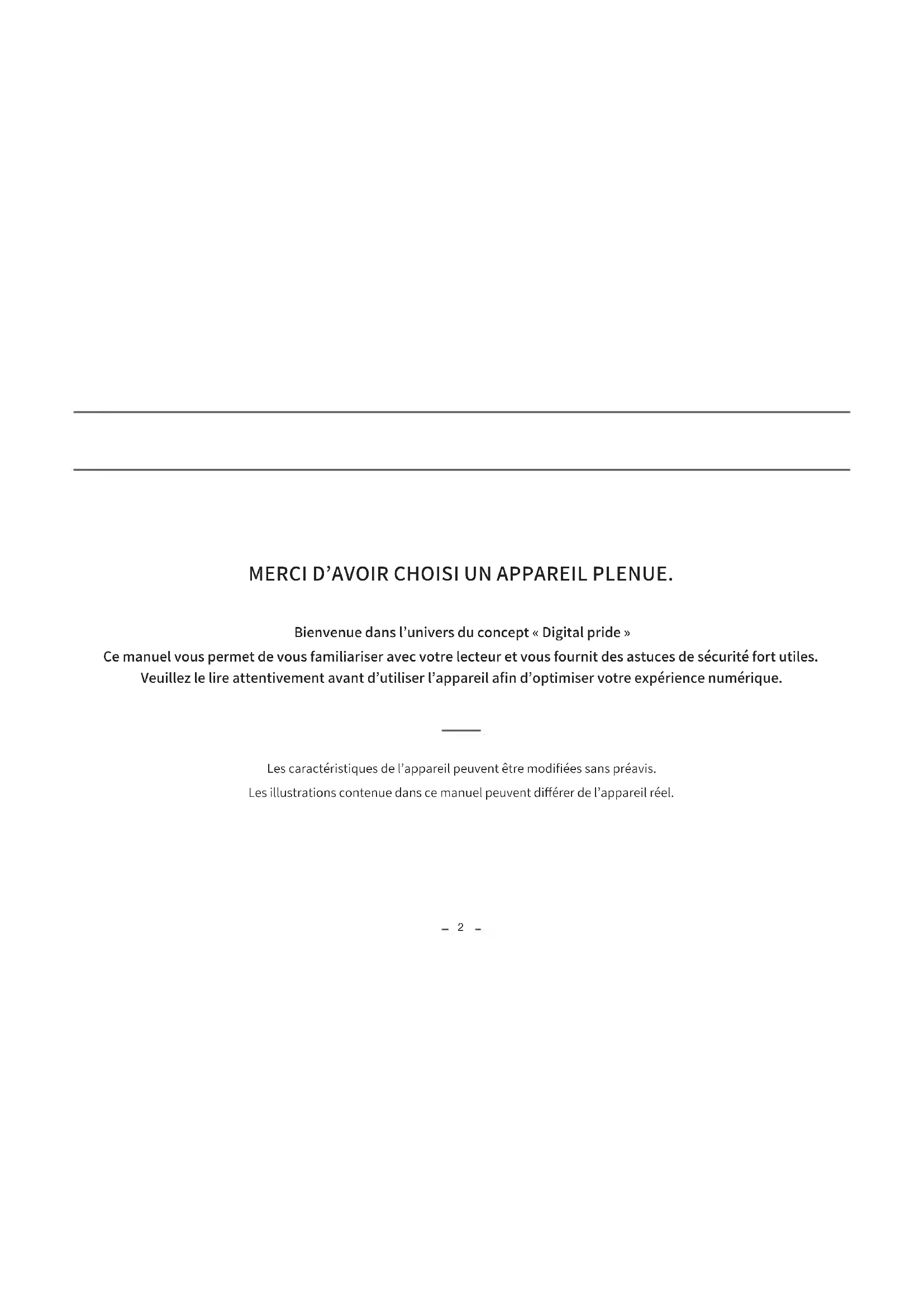 - Si vous avez déni des prols EQ d’utilisateur, sauvegardez les prols avant la suppression. + Les chiers que j’ai mémorisés ne gurent pas dans la liste. Chaque mode ache une liste des chiers lisibles uniquement. Pour visualiser tous les chiers que vous avez mémorisés, sélectionnez le mode Navigateur. Veuillez noter que le dossier System n’apparaîtra pas dans le Navigateur. + L’ordinateur ne reconnaît pas le lecteur lorsqu’il est raccordé. Si la connexion est instable en raison de fréquentes coupures, connecter l’appareil directement au port USB sur le tableau principal du PC. + La capacité de mémoire du lecteur est diérente ou plus petite que la capacité spéciée. La capacité de mémoire indiquée par Windows peut diérer de la capacité indiquée par le fabricant de la mémoire. La capacité réelle sera être réduite par rapport à la capacité initiale car un certain espace de la mémoire devrait être utilisée pour le système pour le fonctionnement normal.27 Dépannage + Le lecteur ne lit pas correctement lorsque la mémoire est pleine. Une partie de la mémoire de l’appareil est utilisée pour les paramètres et la mémoire vive. Si les chiers sont sauvegardés dans cet espace, l’appareil peut ne pas fonctionner correctement. Il est donc conseillé de laisser au minimum 100 Mo de mémoire libre lors de l’utilisation de l’appareil. + Après formatage de l’appareil sur mon PC, il ne peut plus être lu par mon PC, la mémoire est réduite ou la vitesse de transfert des chiers est ralentie. La mémoire intégrée de l’appareil a été préformatée et ne nécessite pas de formatage supplémentaire. Cependant, s’il est nécessaire de formater l’appareil, utilisez la fonction de formatage de la mémoire interne incluse dans l’appareil ; si vous choisissez de formater l’appareil en le connectant à un PC par le biais d’un câble USB, utilisez un utilitaire qui prend en charge le formatage FAT32 grande capacité et dénissez la taille d’allocation par défaut sur 32 ko, ou utilisez exFAT an d’éviter toute réduction de la mémoire ou de la vitesse. Ce produit ne prend pas en charge le formatage sur MAC OS.www.PLENUE.com